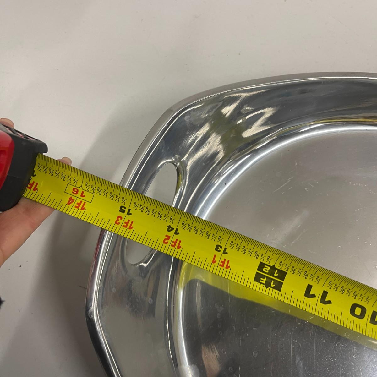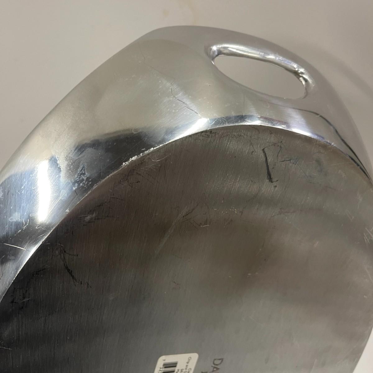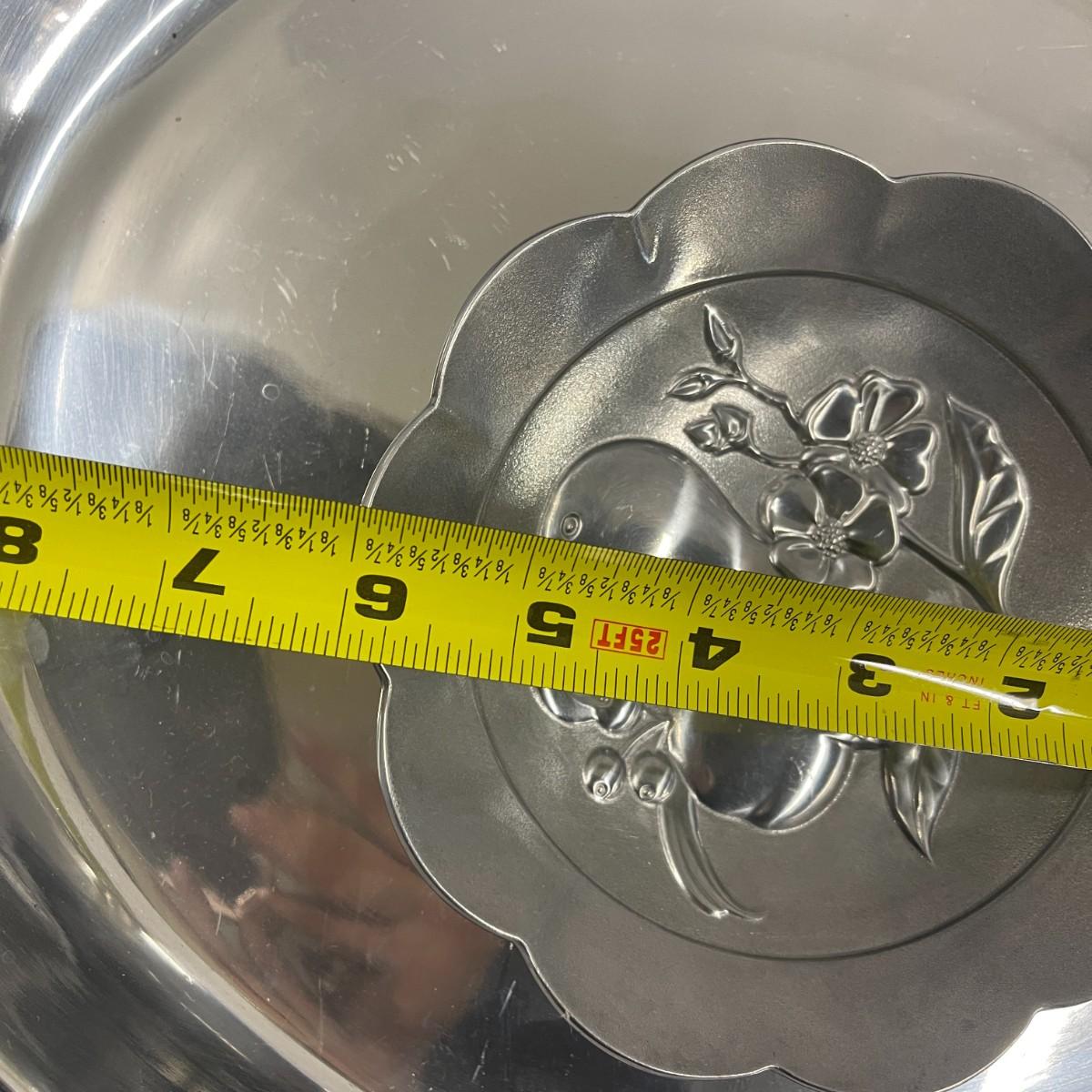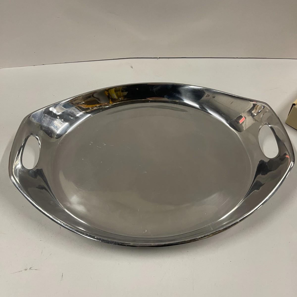 Lot of Metal Serveware by Lenox & Dansk. Includes Lenox Grape Weave small tray in new condition and in original box, Lenox Orchards in Bloom scalloped metal dish and danks Classic Fjord Chip & Dip (missing the dip)