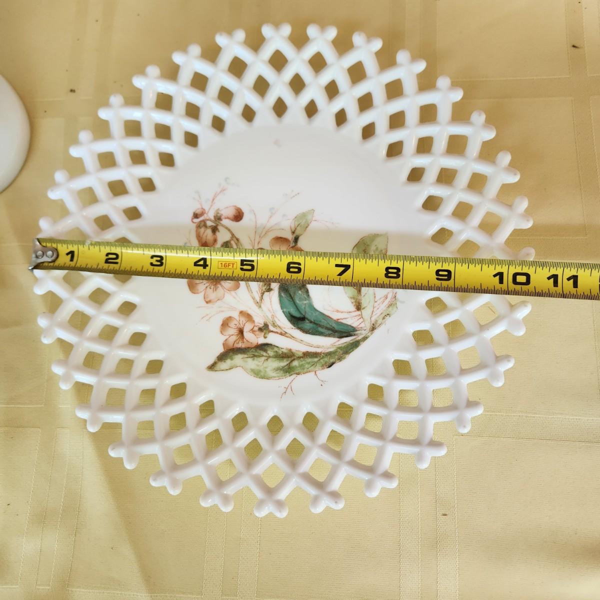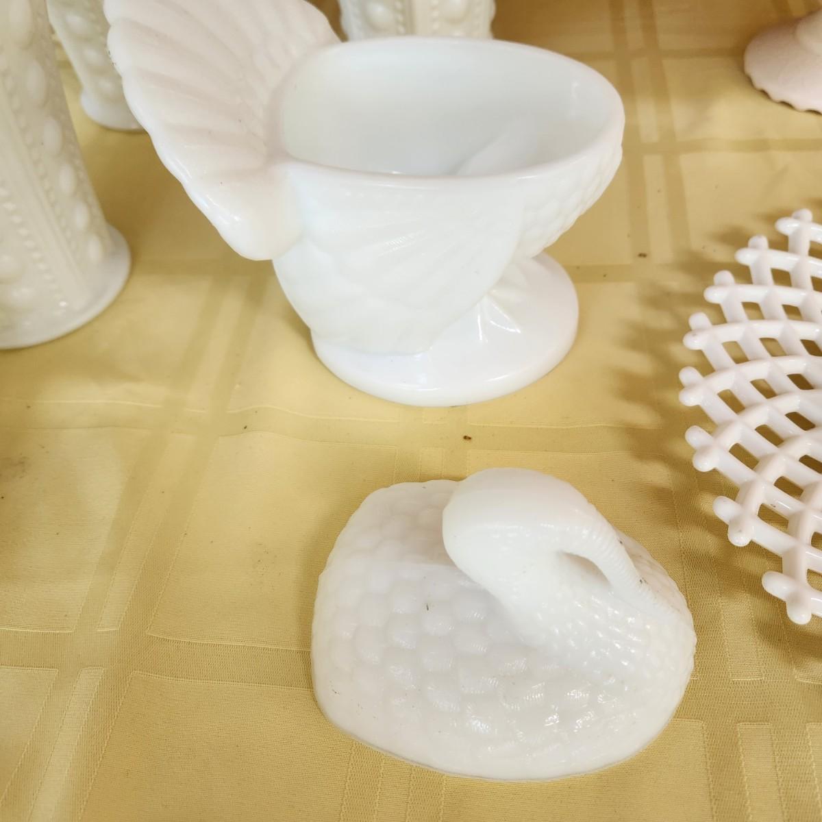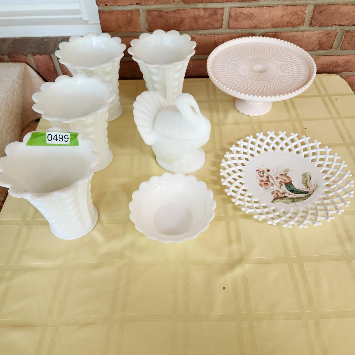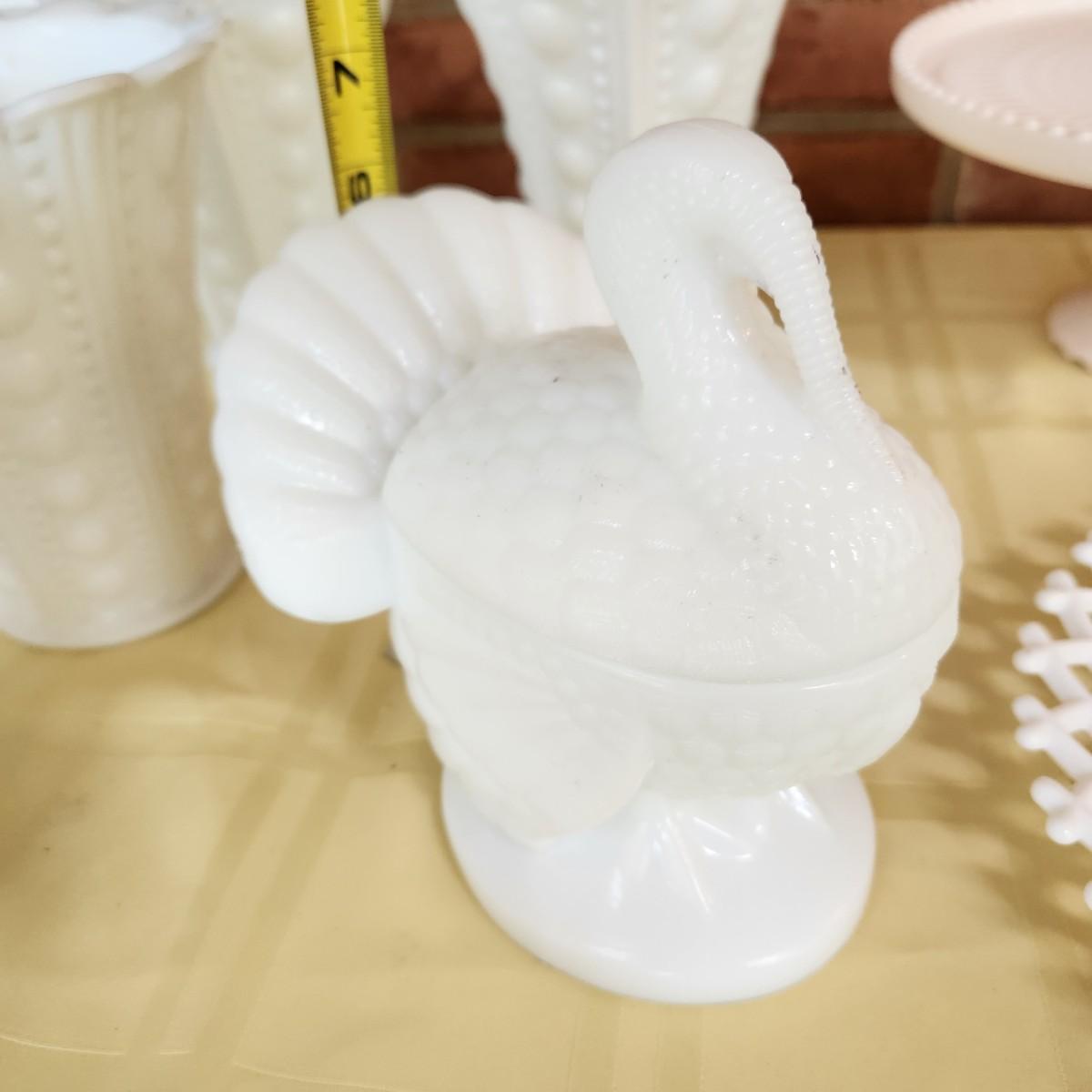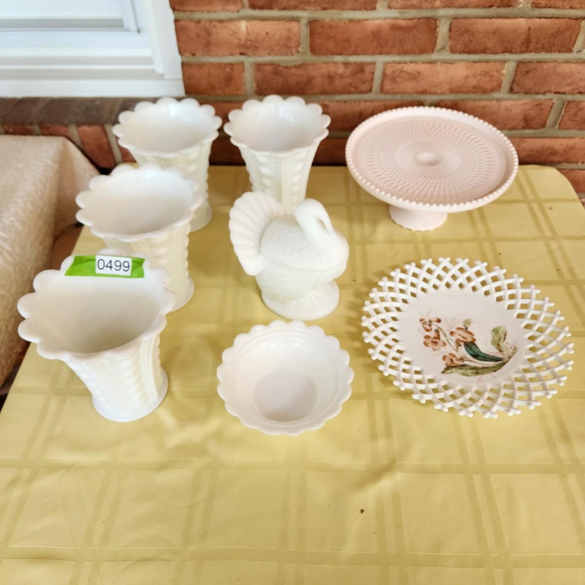 Lot of Milk Glass Vases Cake Platter Turkey Dish , Bowl