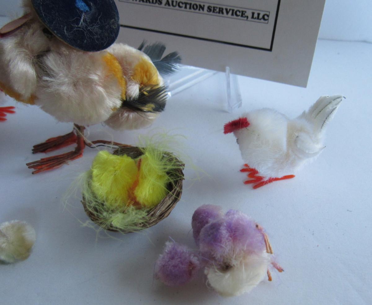 The roosters are newer, chick with hat is probably the oldest one. The purple mini one lost his head but there is a purple ball there to be reattached, and one other tiny part of one. Shipping is available at shipping cost plus $5 a box handling fee. See our terms for details.