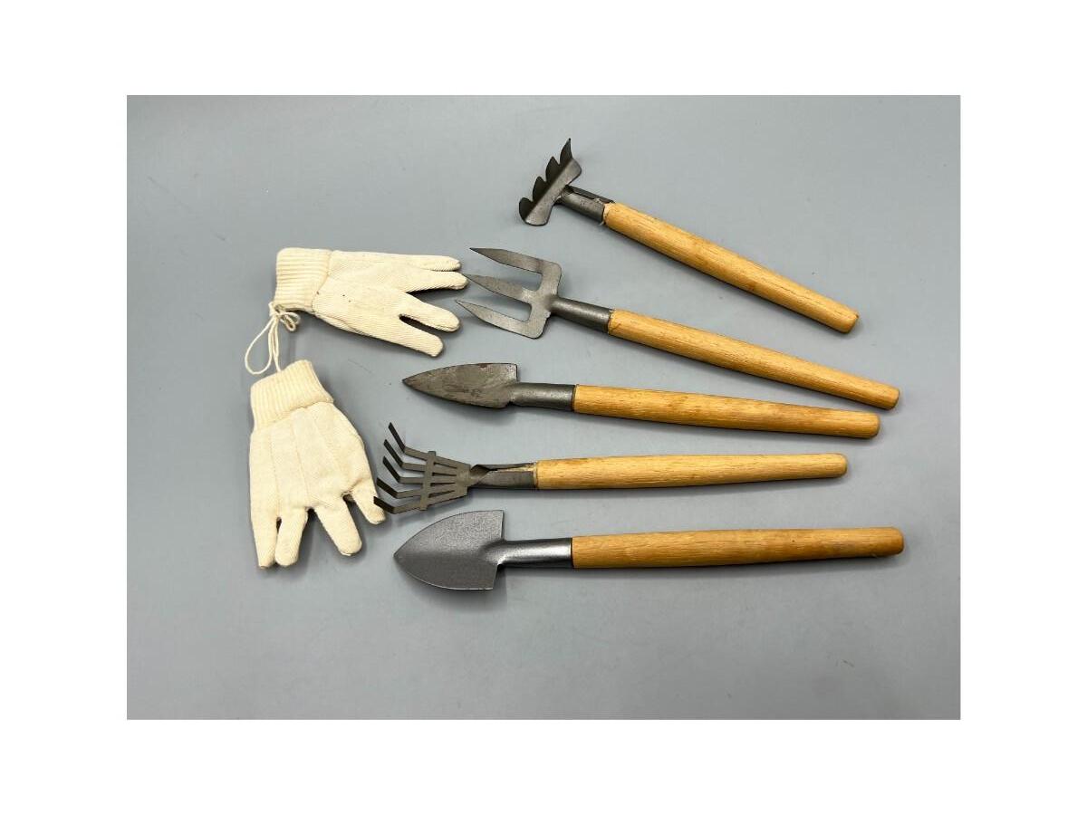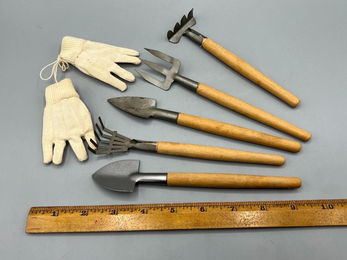 Lot of Miniature Wood & Metal Gardening Tools, there is no signifncant damage to any of the miniature tools and is in good displayable condition. Check pictures for more details and for sizing.