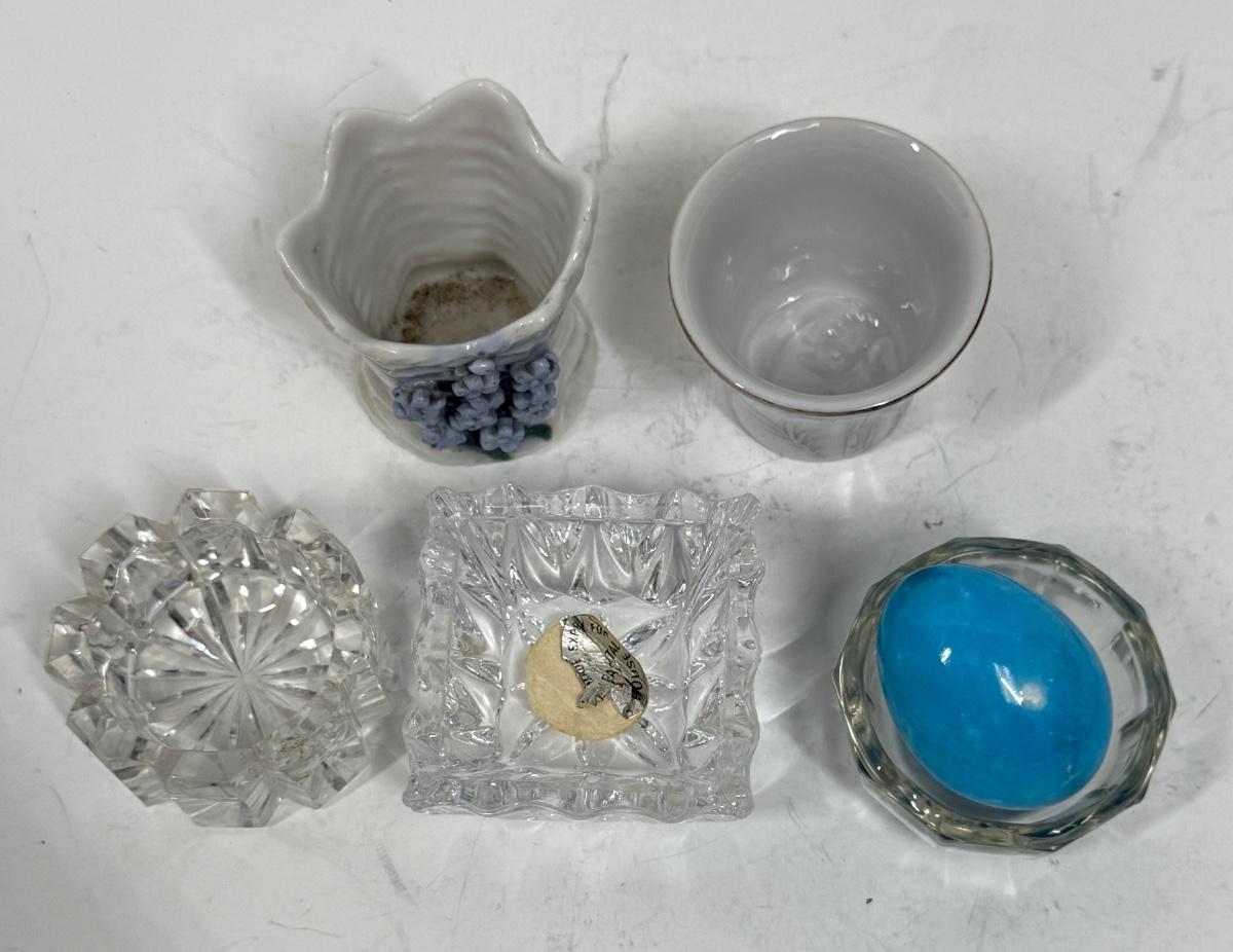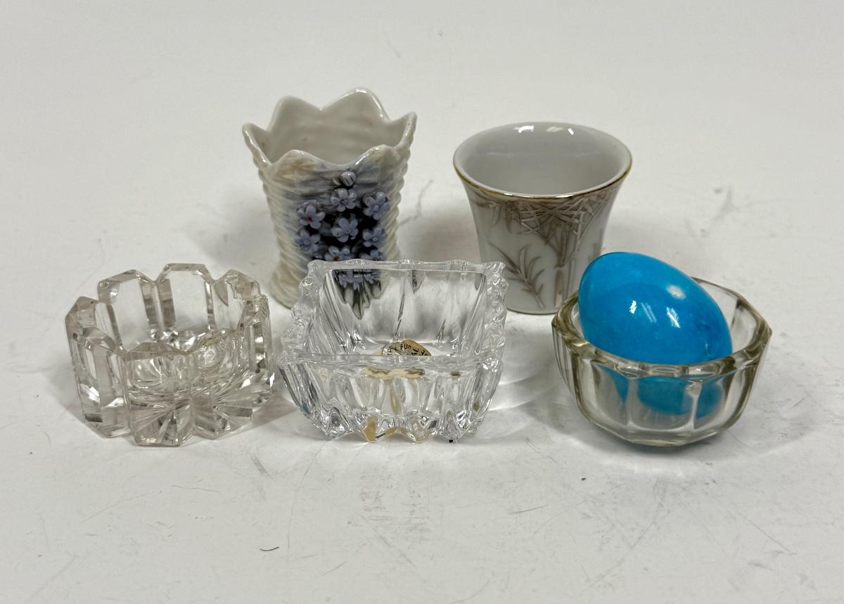 Lot of Miniatures - 3 clear salts, Marble Blue Egg, 2 porcelain salts