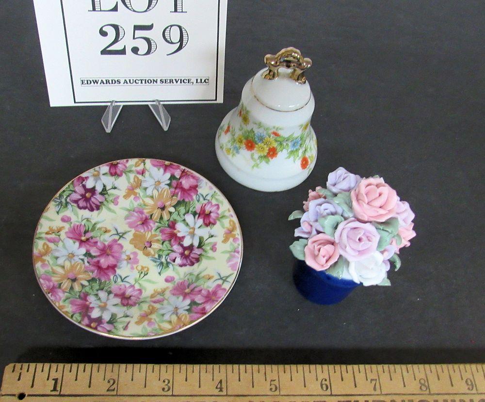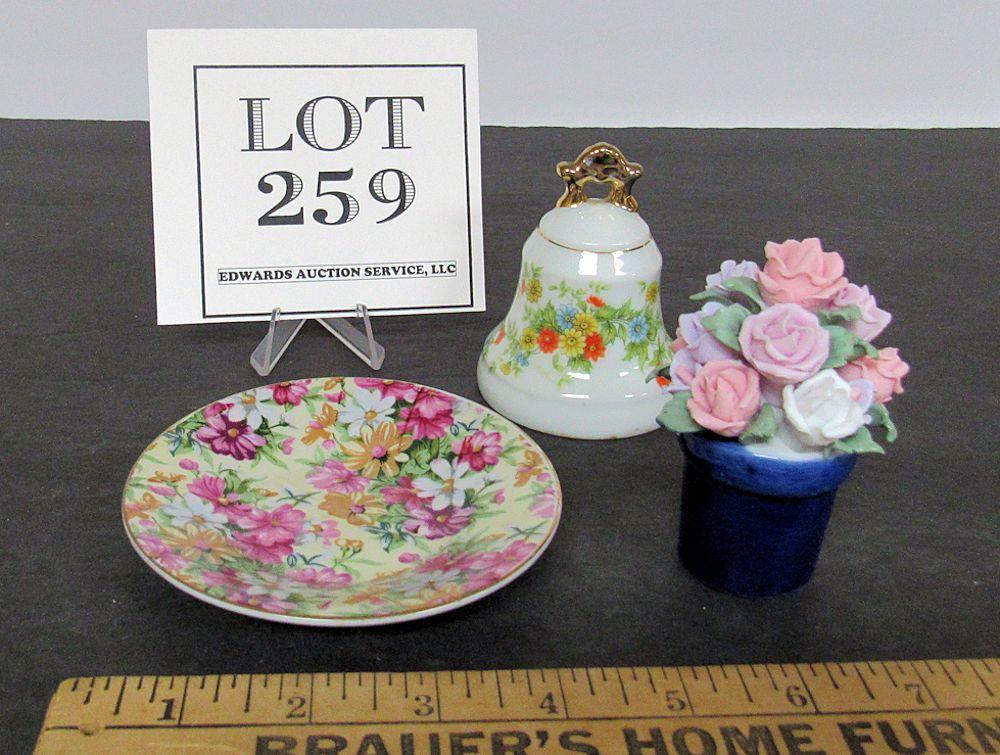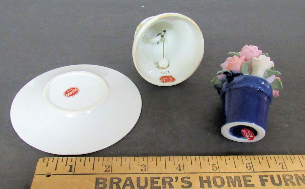 Lefton bell, China flowers, little plate. Appear to be in good condition. Shipping is available at shipping cost plus $5.00 handling fee on up to 8 lots, $10.00 handling fee on 9 or more lots or two boxes. You will receive exact item as pictured, no refunds, returns not accepted.