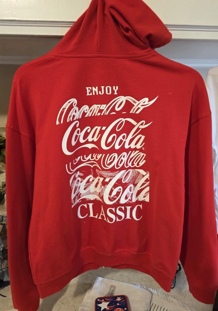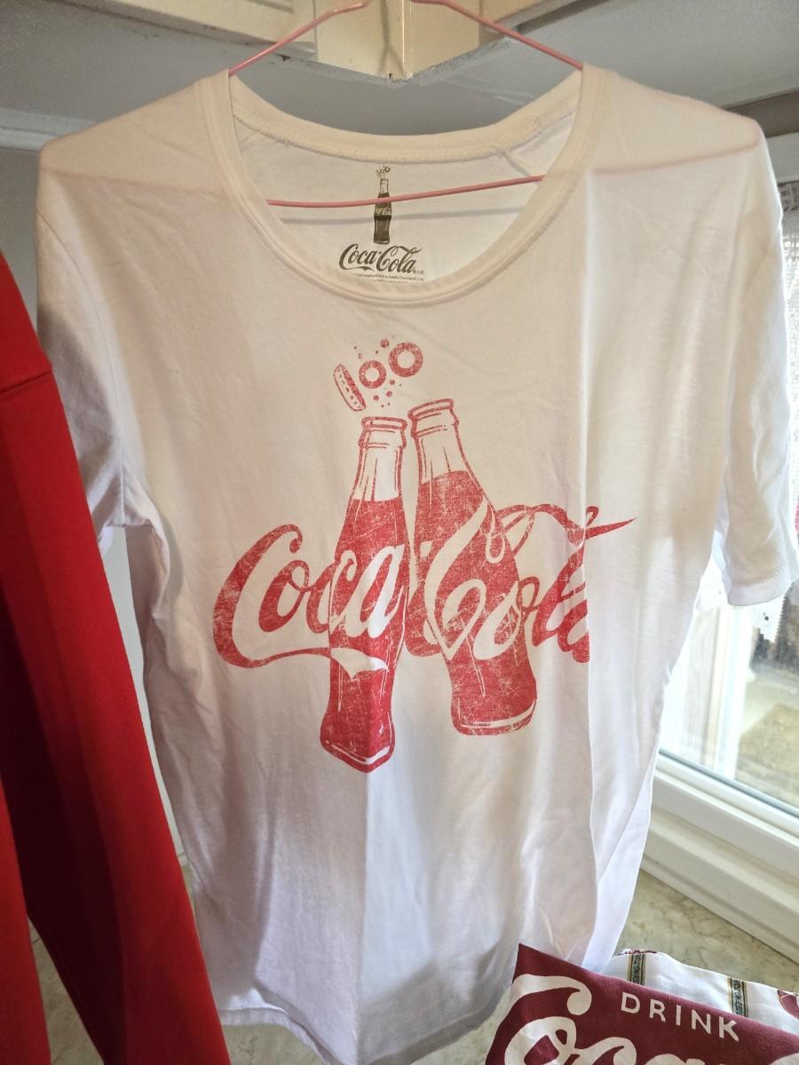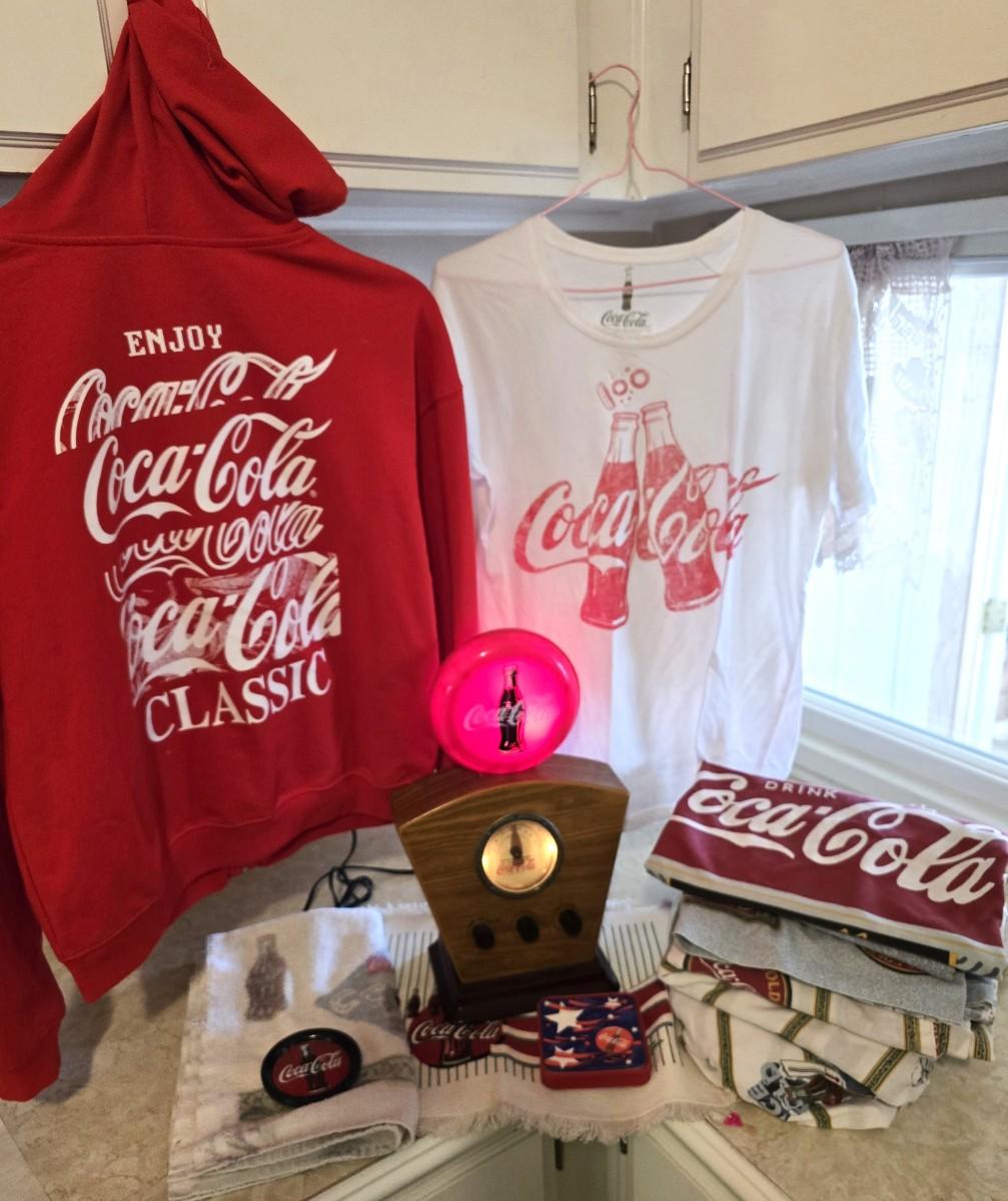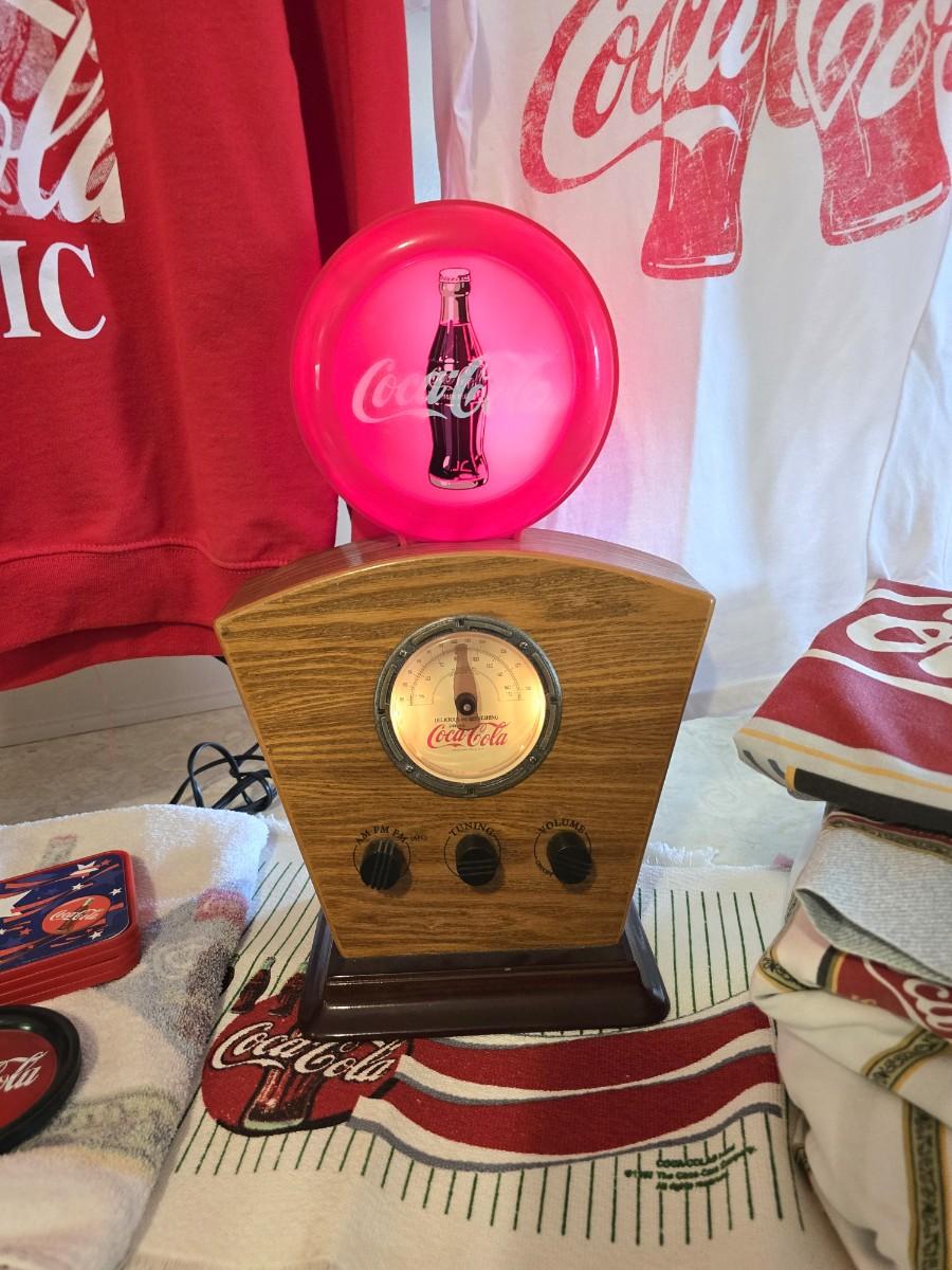 Lot of Misc Coca-Cola collectibles- Vintage Coca-cola radio-Works! White Tshirt size Large, Red Jacket zipup size Medium, Sheet set, coasters