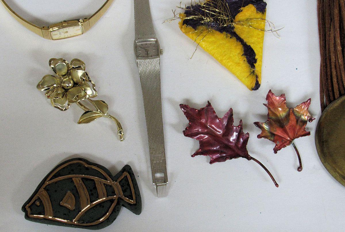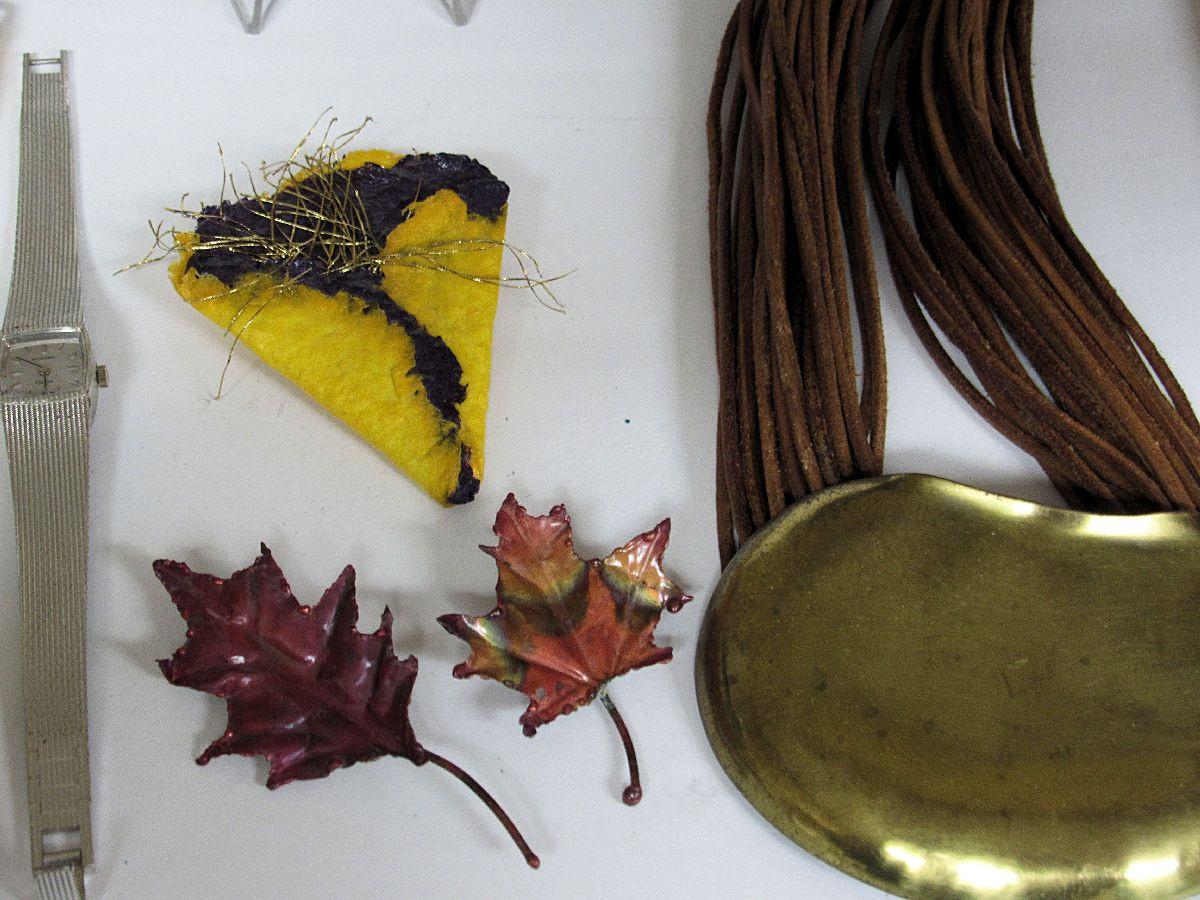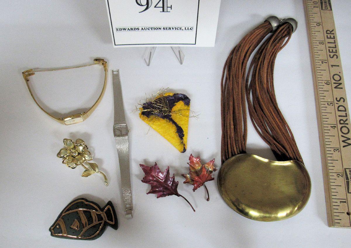 The brass and leather necklace has some wear. Don't know if the watches work or not. The leaf pins and fish pin appear to be hand crafted. Shipping is available at shipping cost plus $5.00 handling fee on one box, $10.00 handling fee on two boxes, $15.00 handling fee on 3 boxes. Helps cover shipping materials and labor cost.