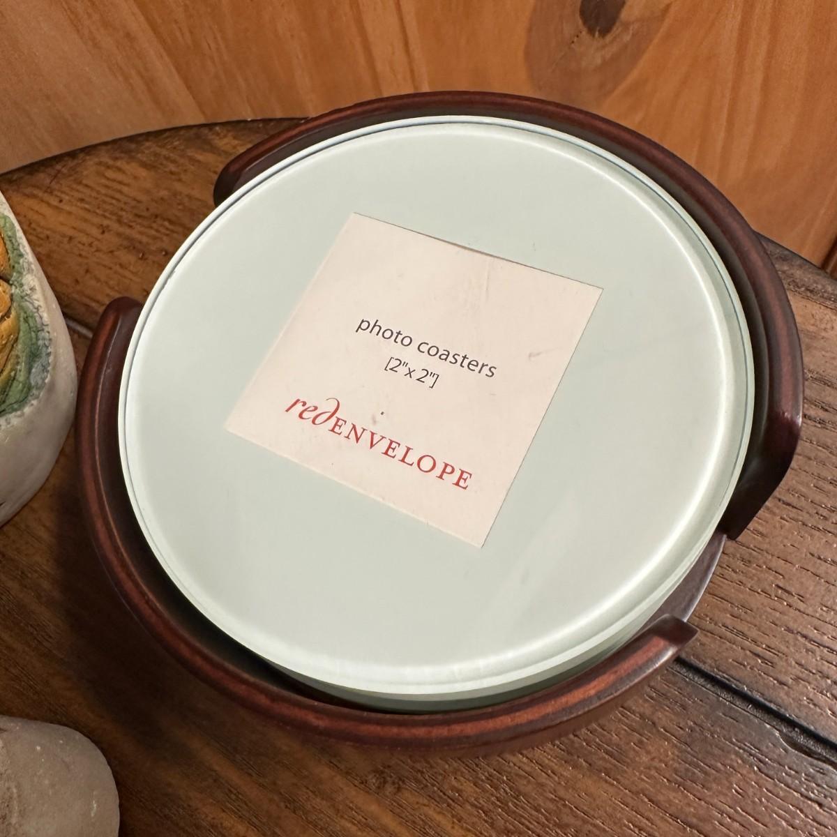 Vase (not ceramic), a cross, coasters, and a nice set of glass photo coasters
