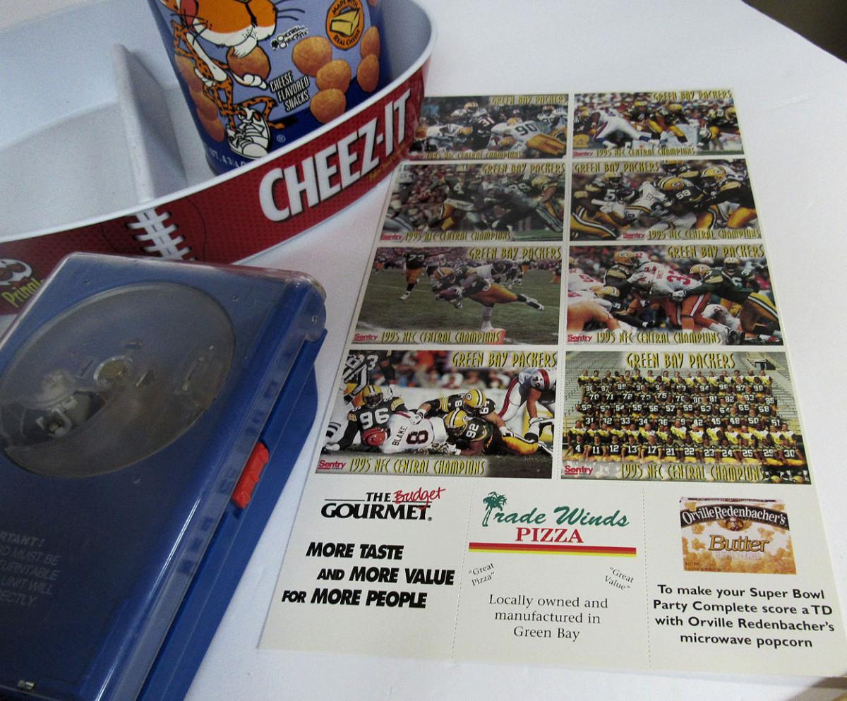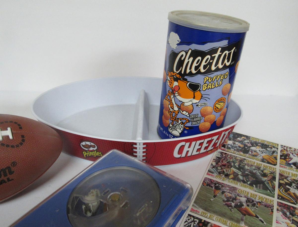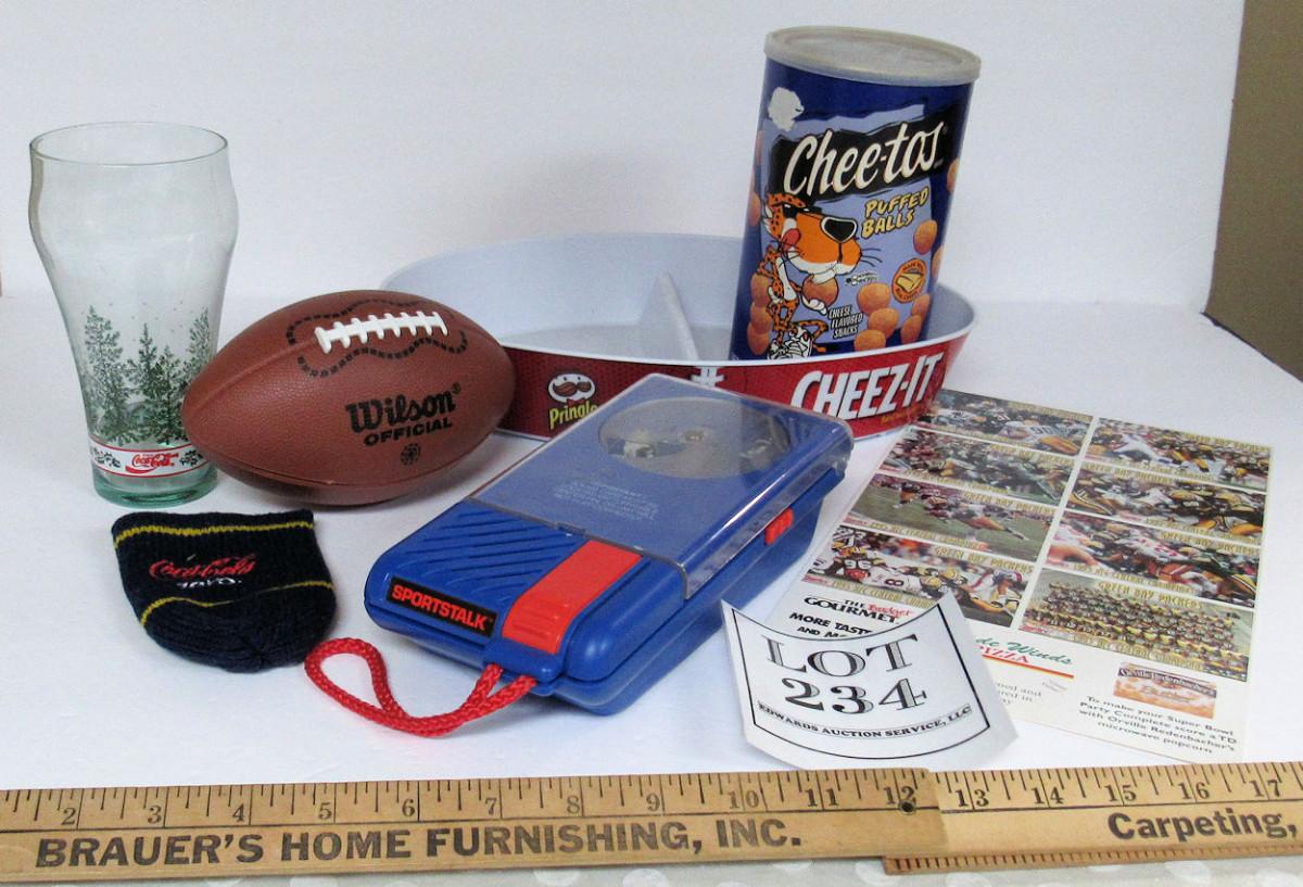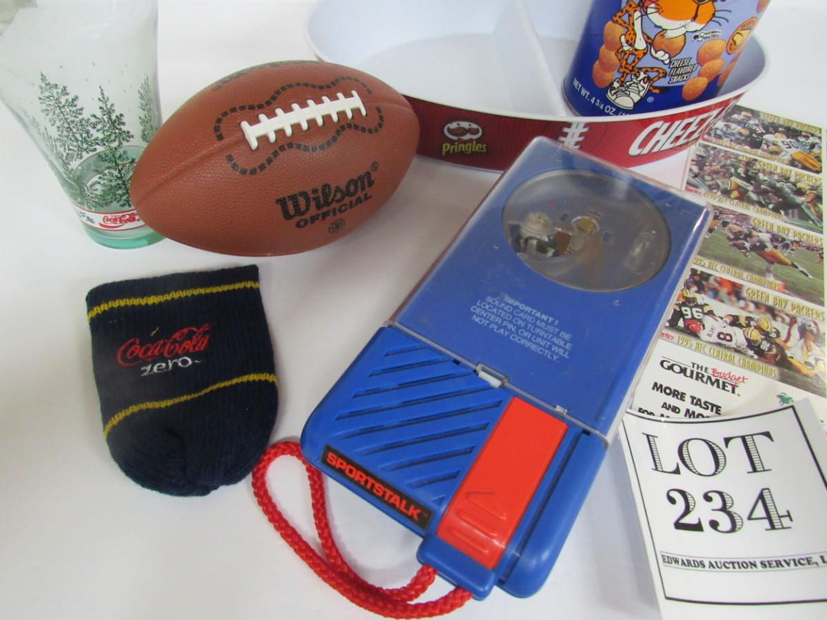 Packers football cards in good shape. Coca Cola glass and little hat in good shape. Cheez-it dish in good shape. Cheetos container has paper missing on upper left. The football radio is not working, did not try it - may need a battery? The Sports Talk we have no way to see if it works or not. Shipping is available at shipping cost plus $5.00 handling fee on up to 8 lots, $10.00 handling fee on 9 or more lots or two boxes.