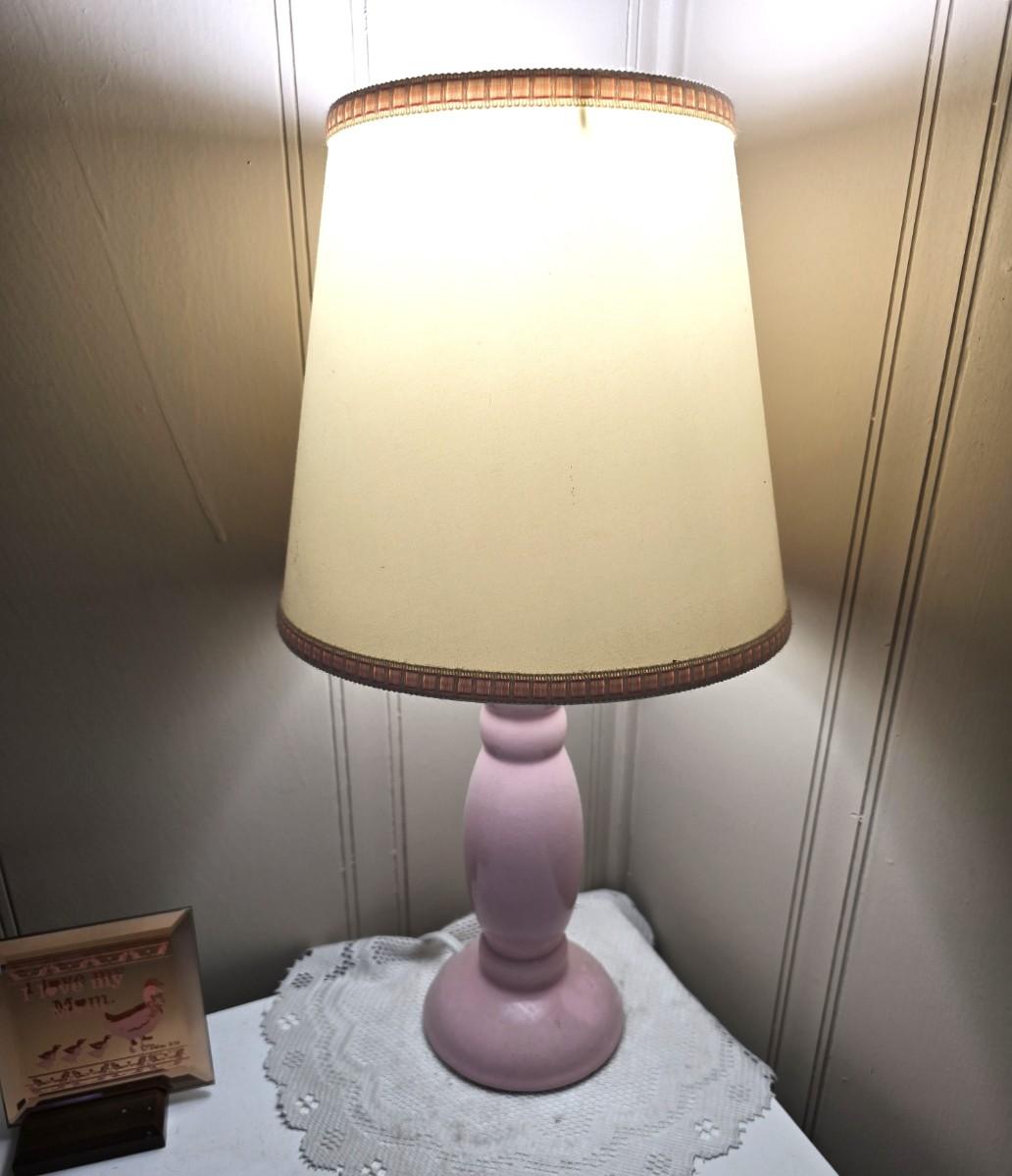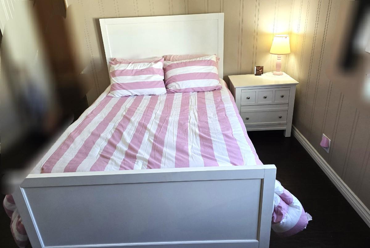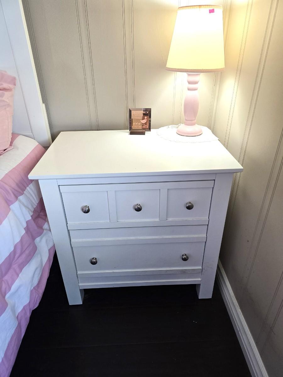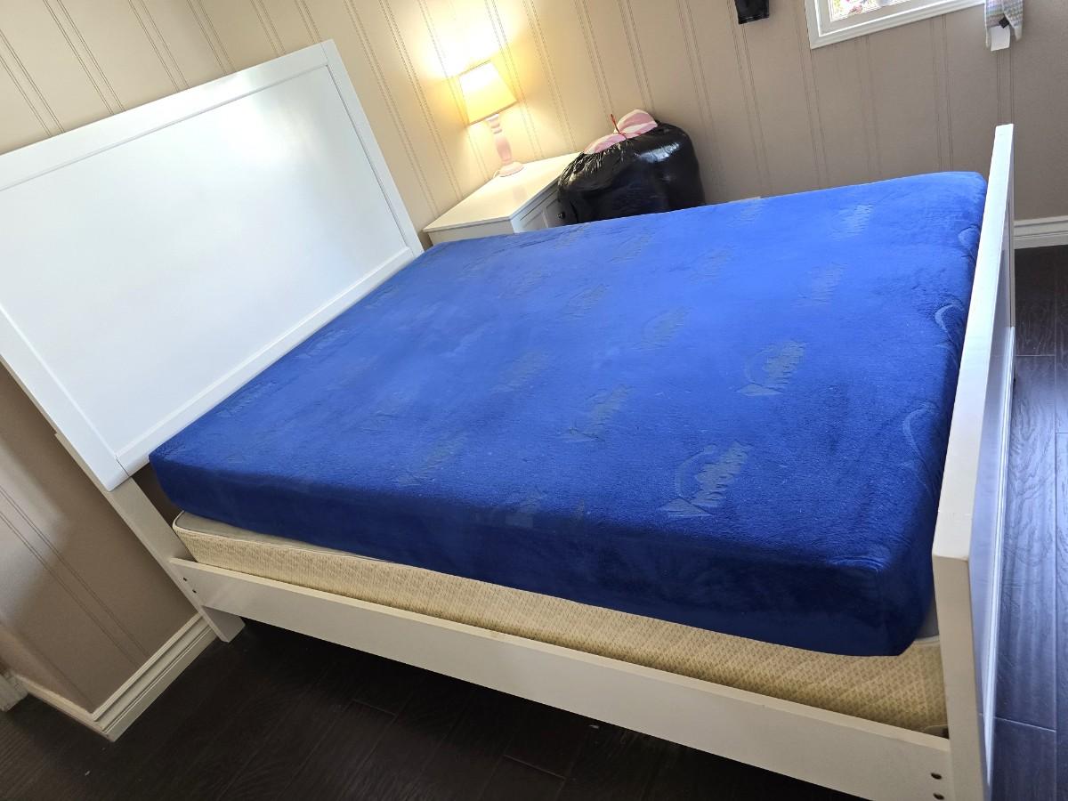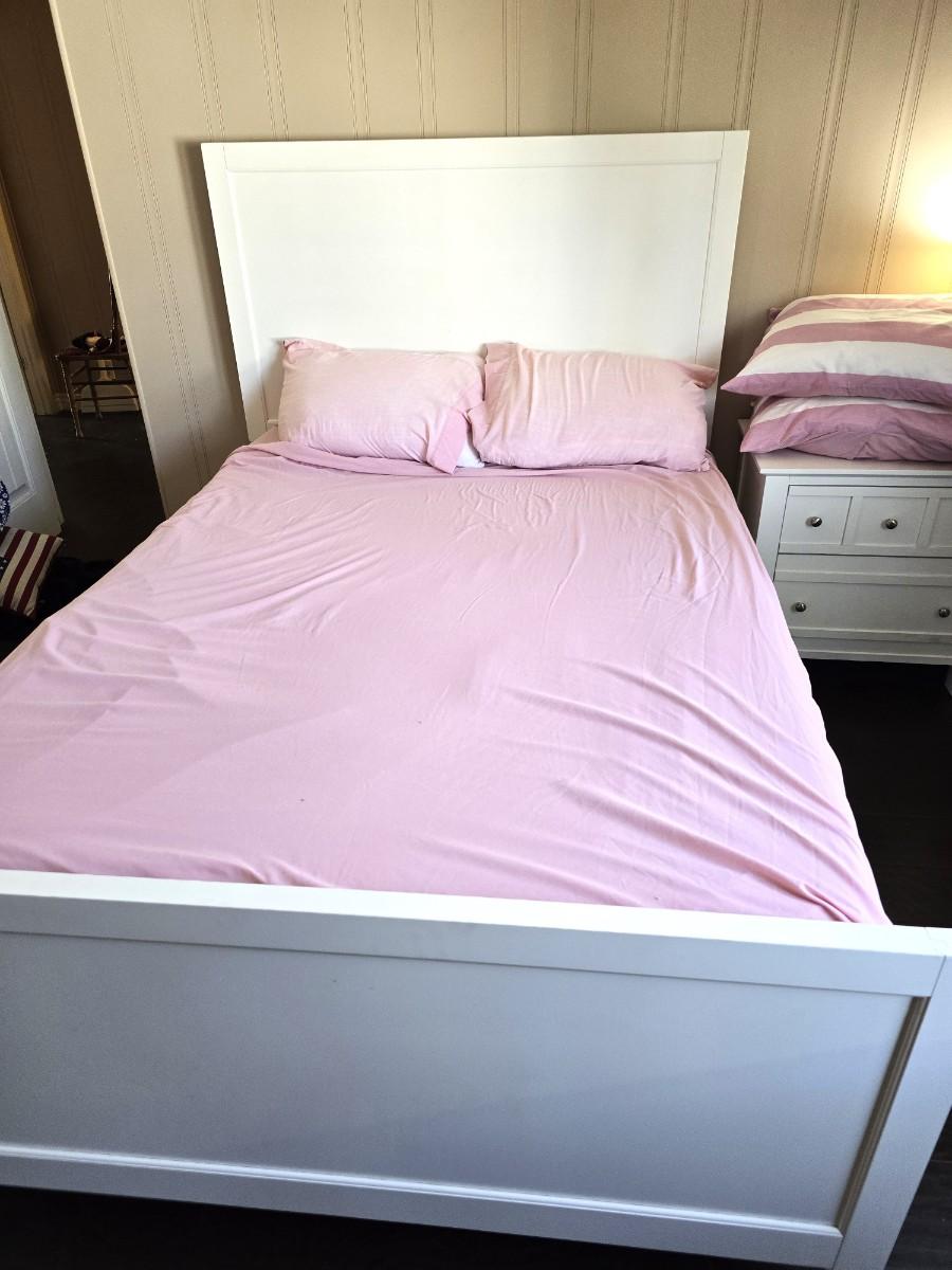 Bed, bedframe that measures 80"LX56.5"W, matching nightstand that measures 26.5LX26.5WX18"deep, and pink lamp