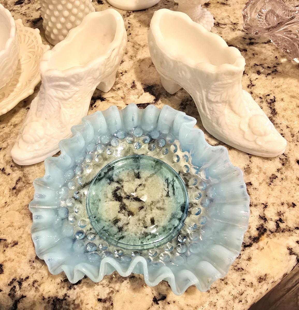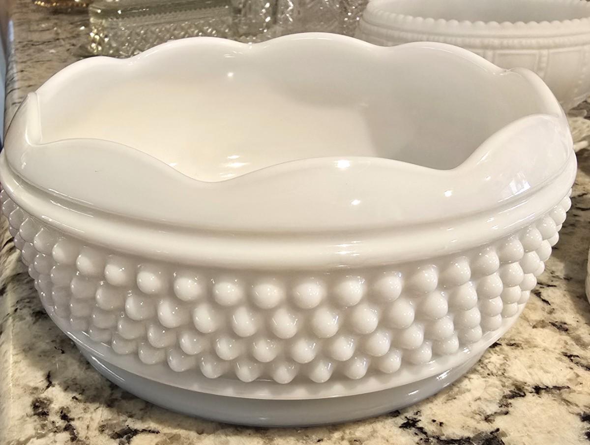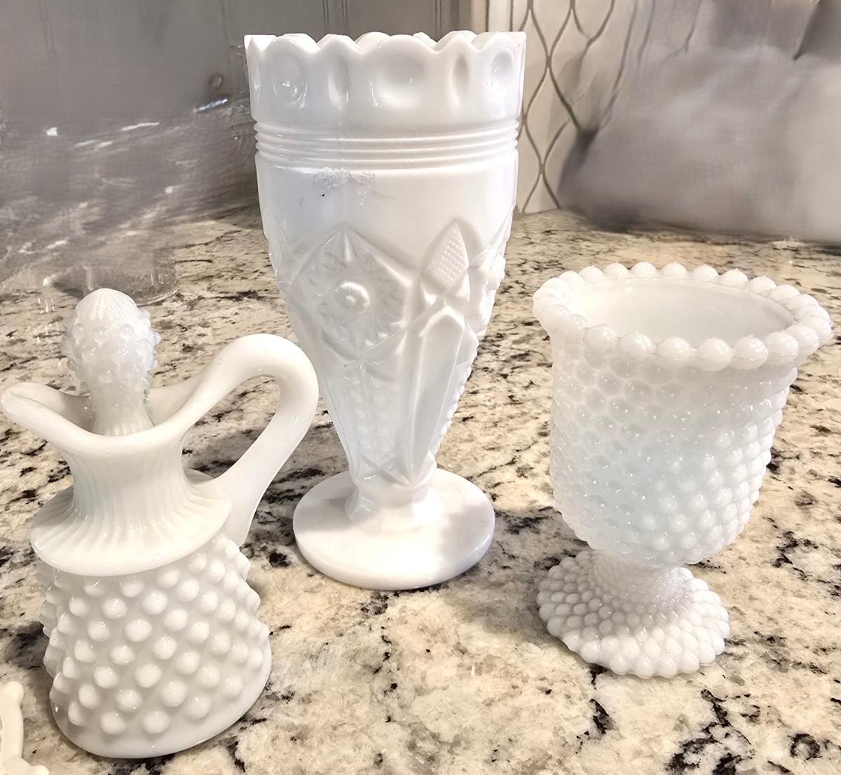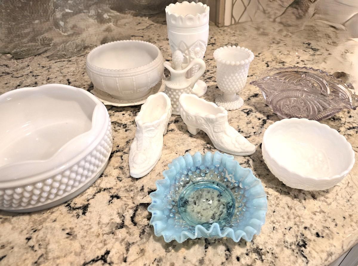 Lof of 11 pieces of glassware. Milk glass, hobnail.