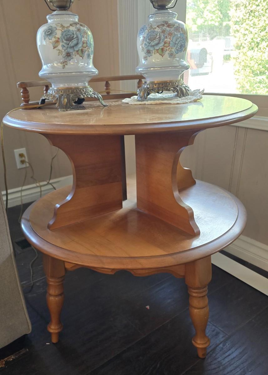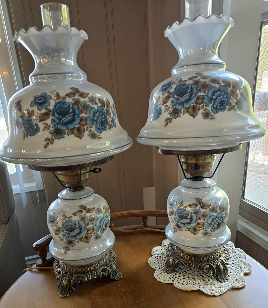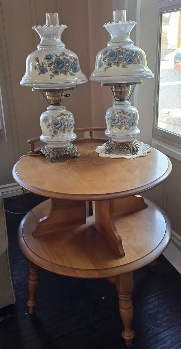 2 Vintage hurricane lamps and End table