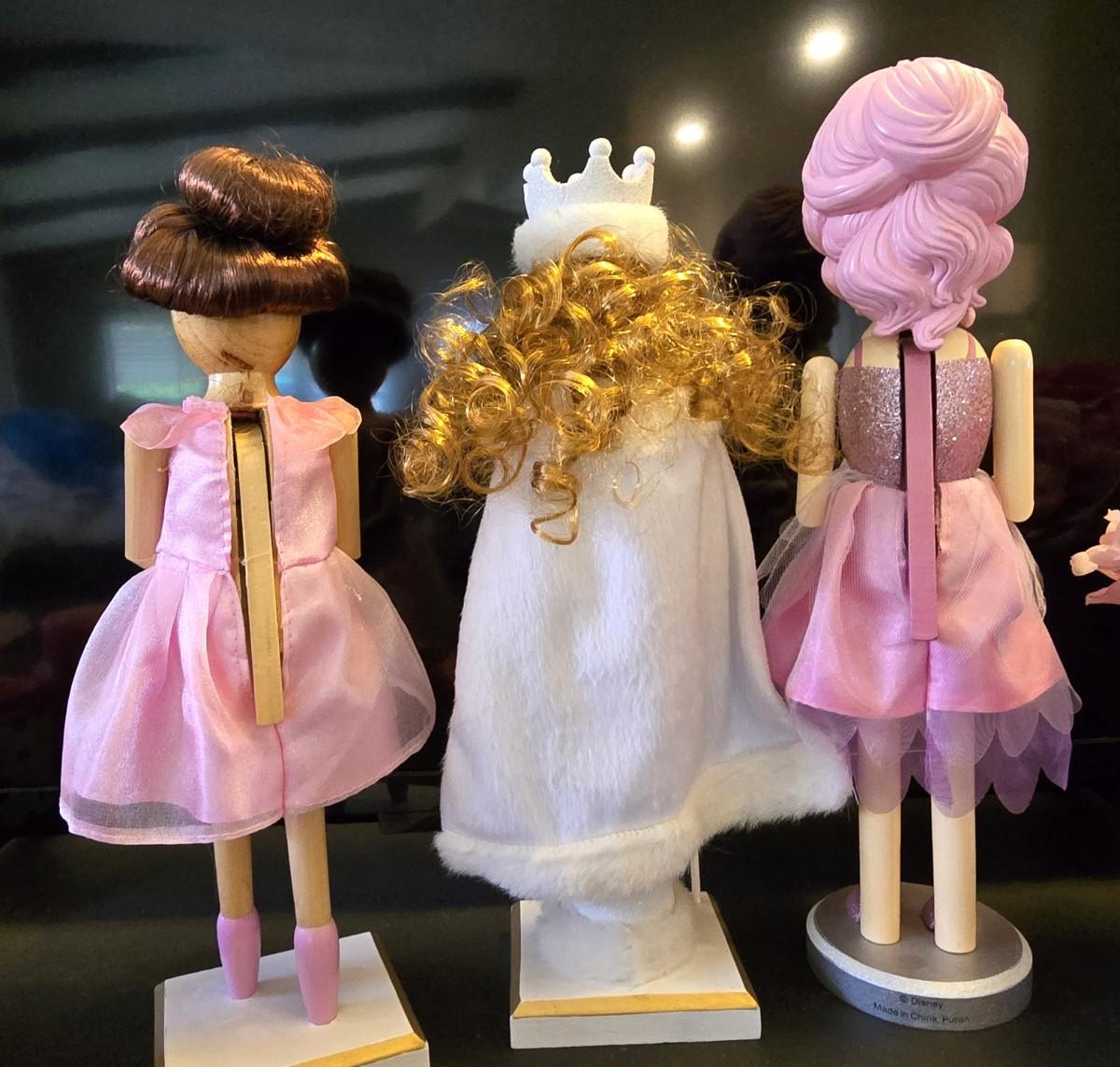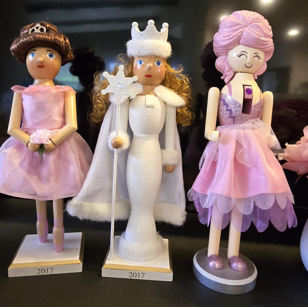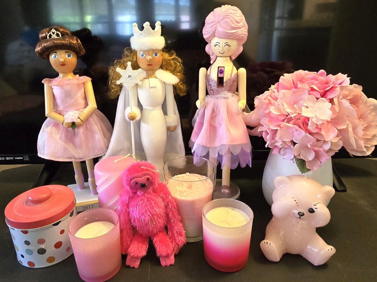 3 nutcrackers, 6 candles, flowers in white vase, & a pink stuffed monkey