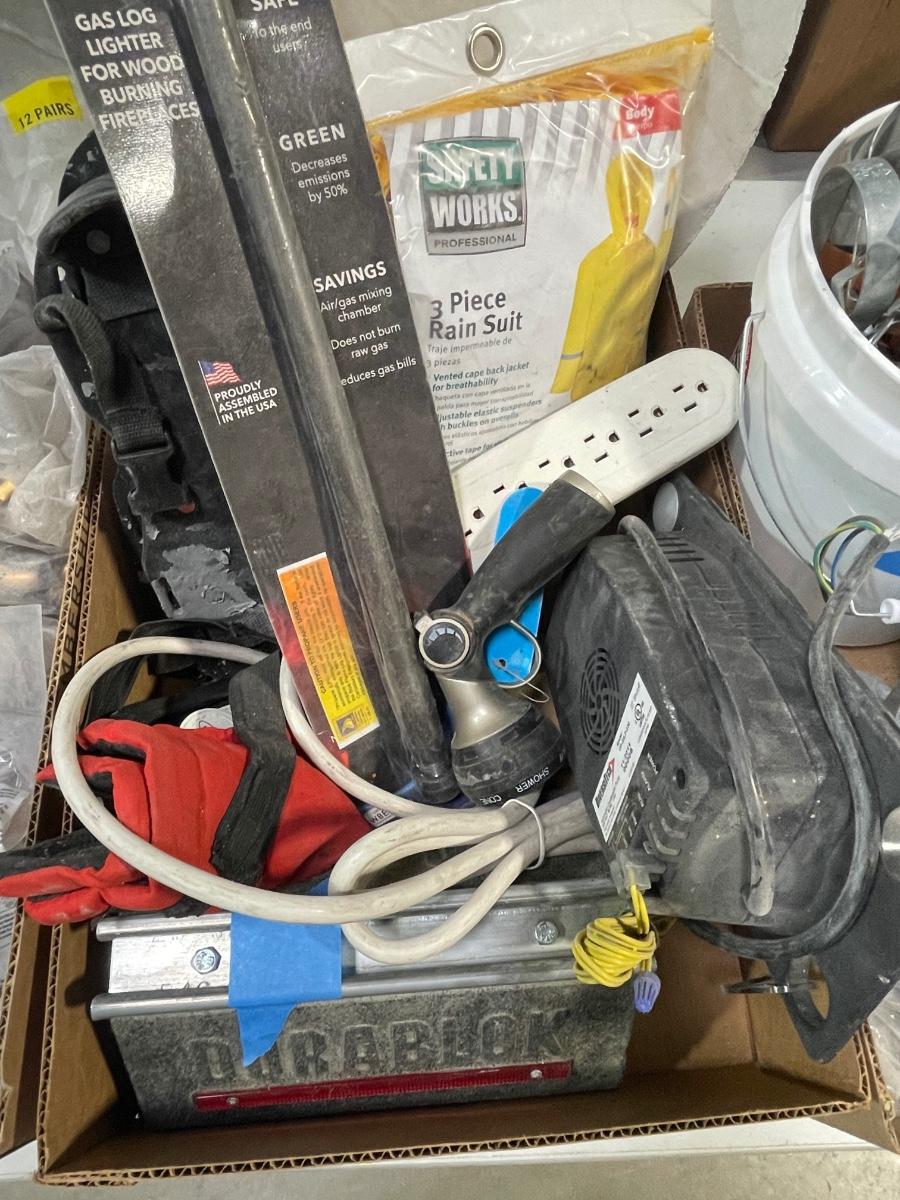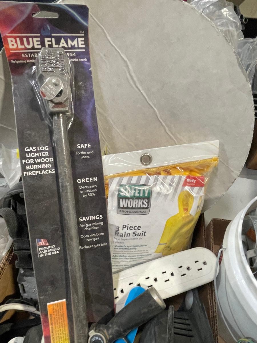 Lot of Misc. Items - floor cleaning pad, blue flame light, 3 pc rain suit, power strip, shoe spikes & More