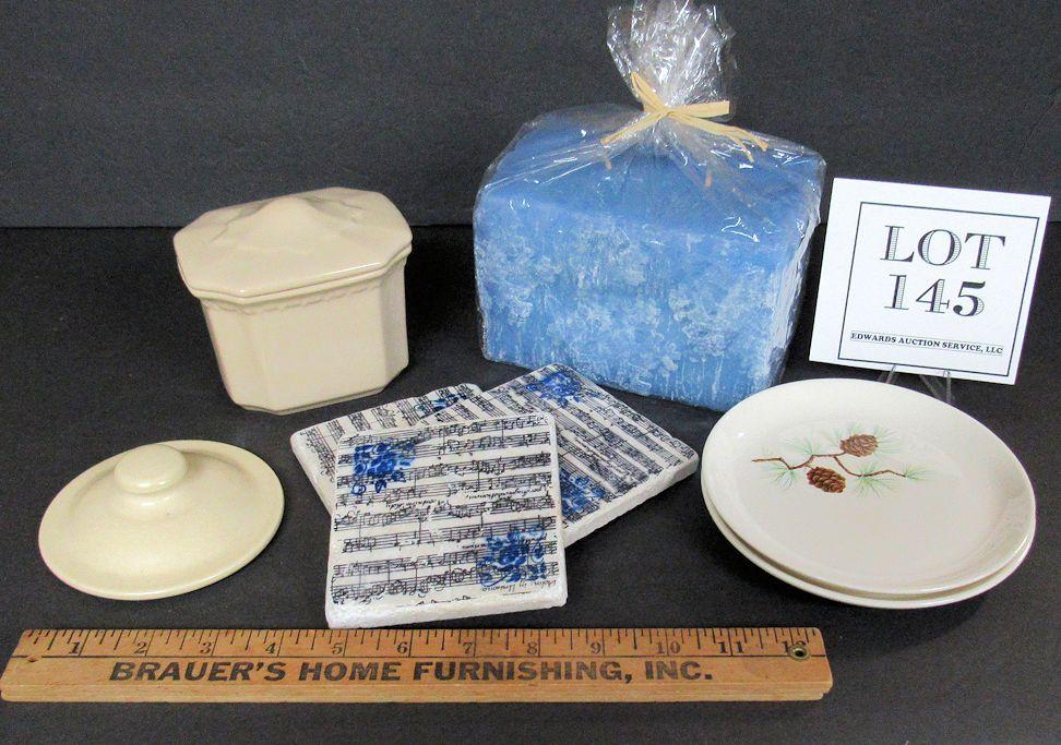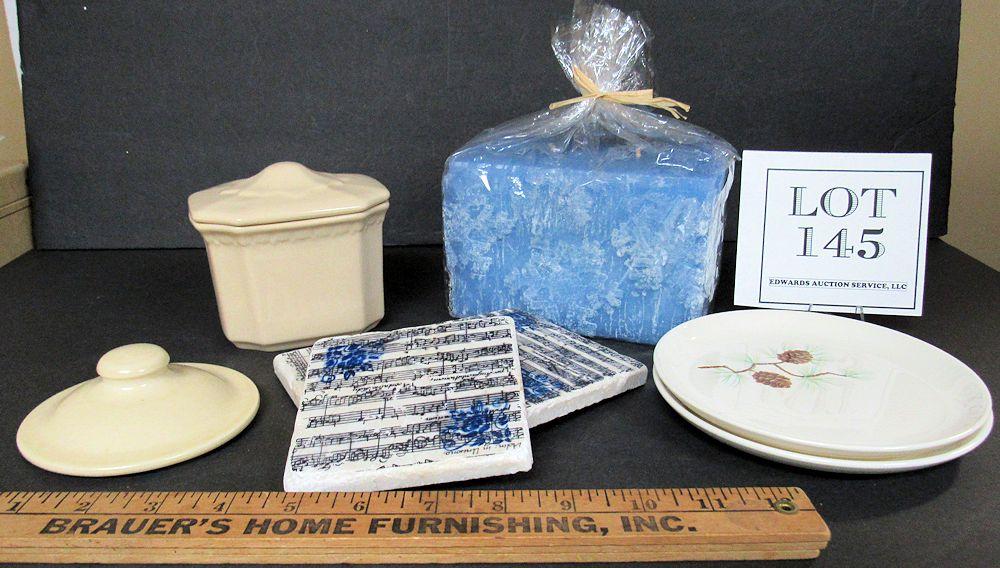 Lot of Misc Kitchen Items, Large Candle, Stone Coasters
