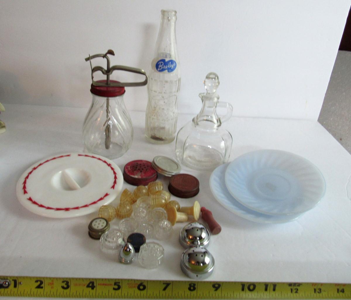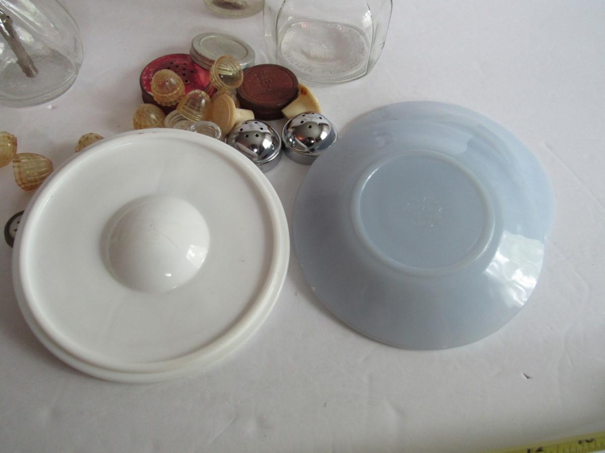 The white cover has small chips, some covers are rusting, bottle has debris inside. Fireking saucers, curet with original stopper. Shipping is available at actual shipping cost plus $5.00 handling fee per box for supplies/labor. See our terms for details. All sales are final. Condition notes may not be all inclusive, we may miss some issues as most vintage items are not in mint condition and have some degree of wear, paint loss, etc, but we always try to note obvious damage.