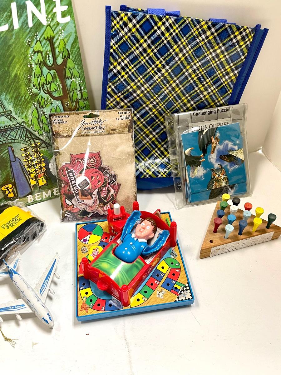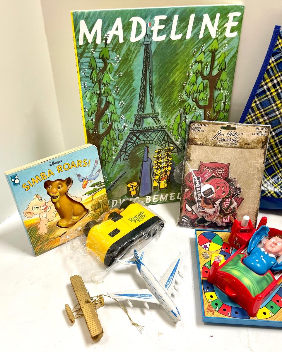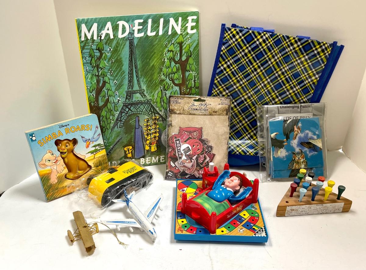 Lot of Miscellaneous Trinkets Toys Books Madeline Simba Airplanes Games