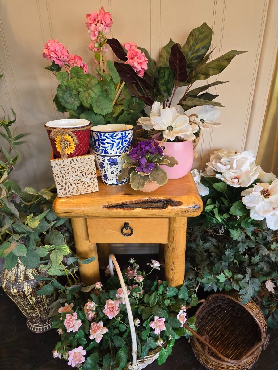solid wood accent table measures 18"wide X 24.5"tallX18"deep , 1 tall bamboo plant, and 8 other plants, 5 planter pots, stroller basket.