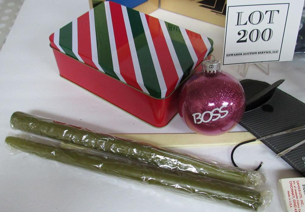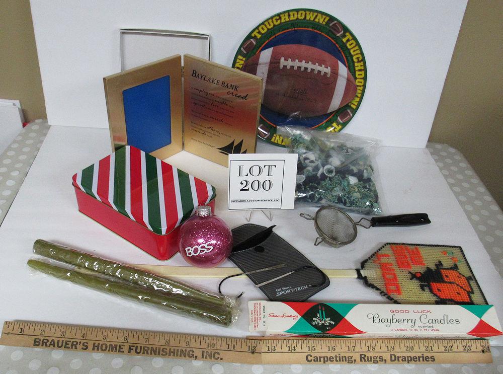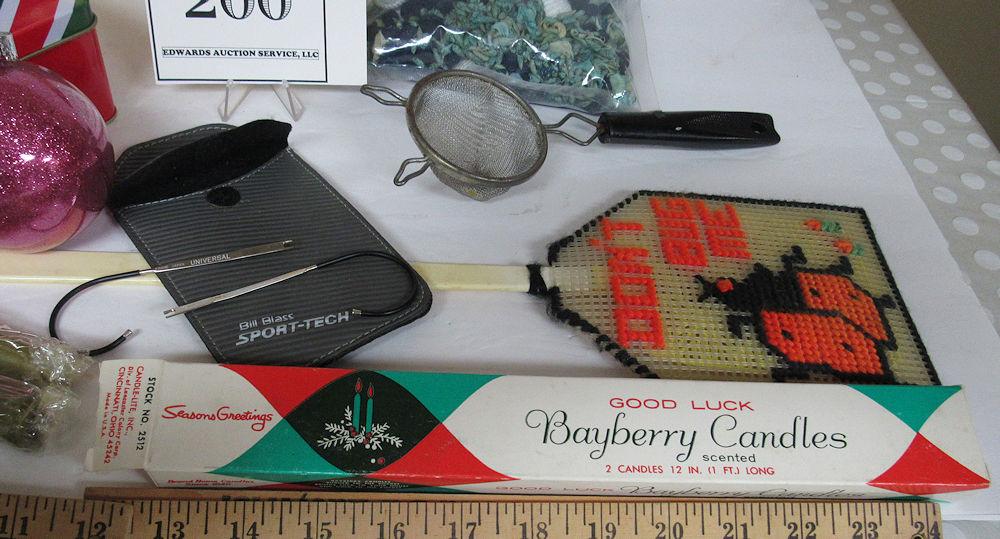 Lot of Misc Stuff, Picture Frame, Unused Candles, Fly Swatter, Shells and Potpourri, Plastic Plate More
