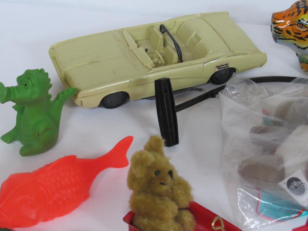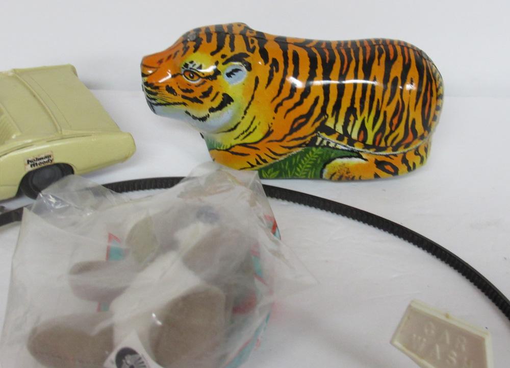 The tin tiger does not wind. Car is plastic and seems to be ok. Hot wheels plastic pull thingy. Shipping is available at shipping cost plus $5.00 handling fee on up to 8 lots, $10.00 handling fee on 9 or more lots or two boxes. You will receive exact item as pictured, no refunds, returns not accepted.