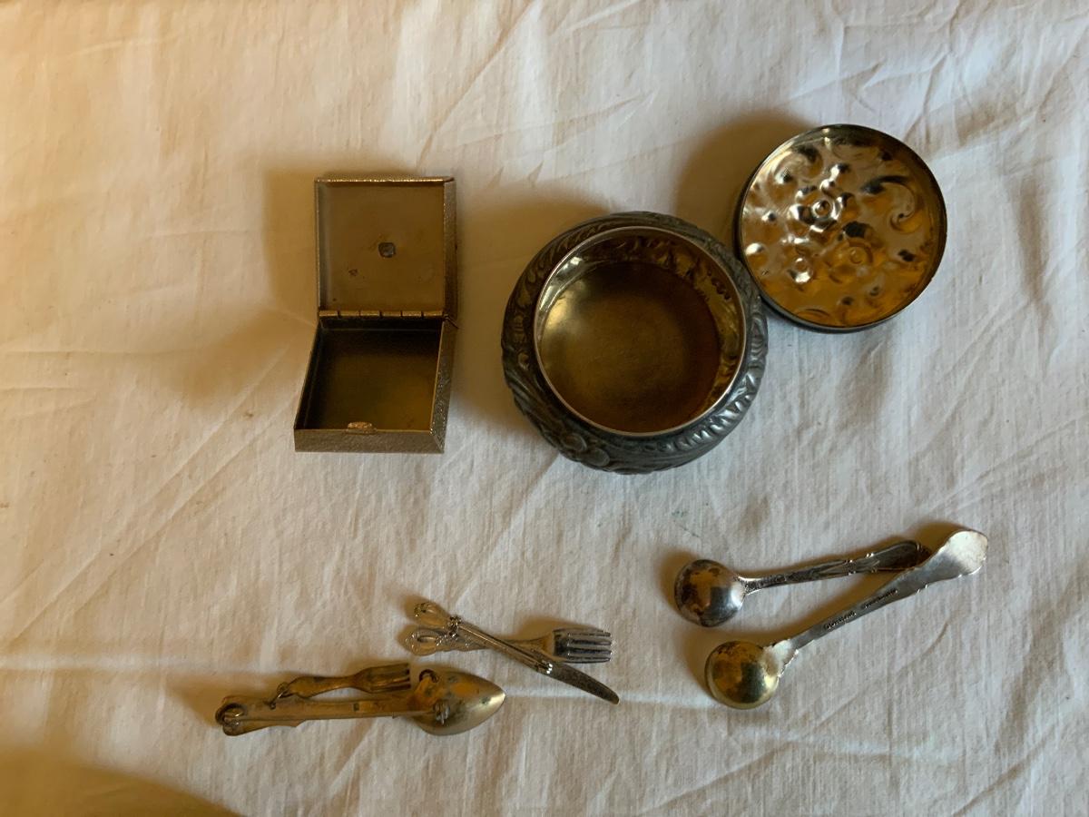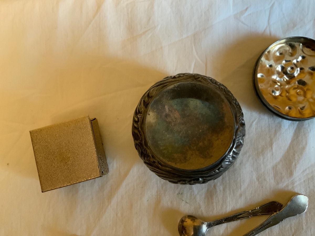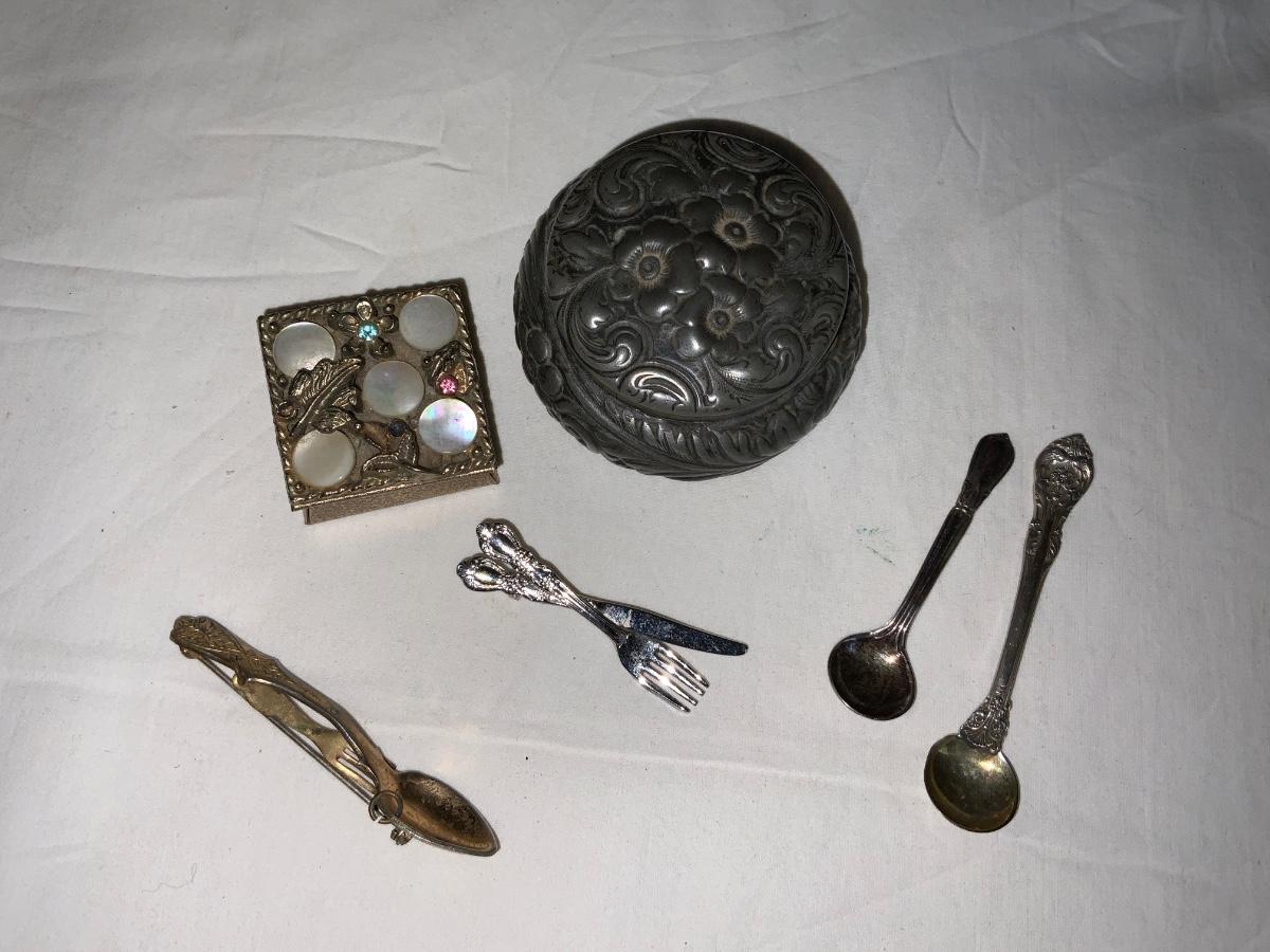 Lot of misc Trinket boxes and spoons. Large trinket box marked silver plate. 2 items are Pins. Not tested for verified. Please see photos for condition