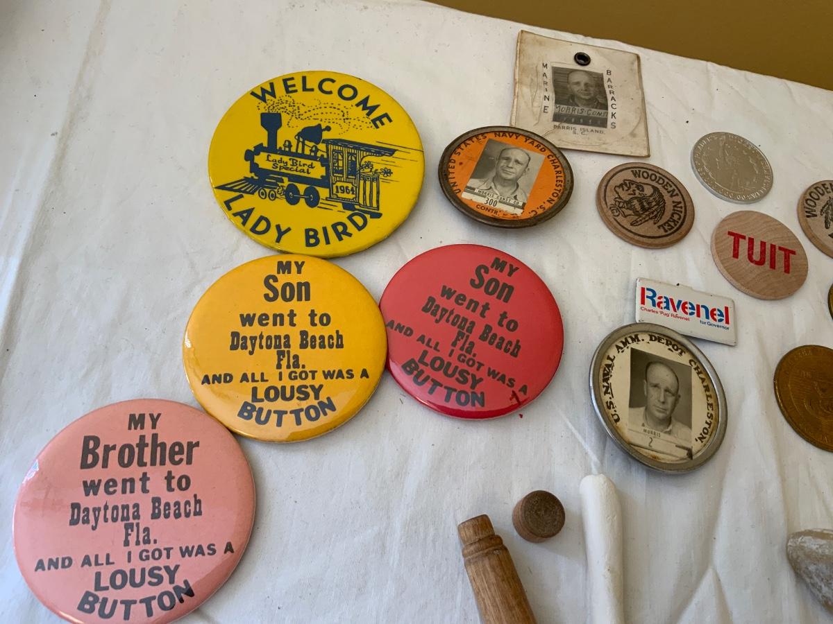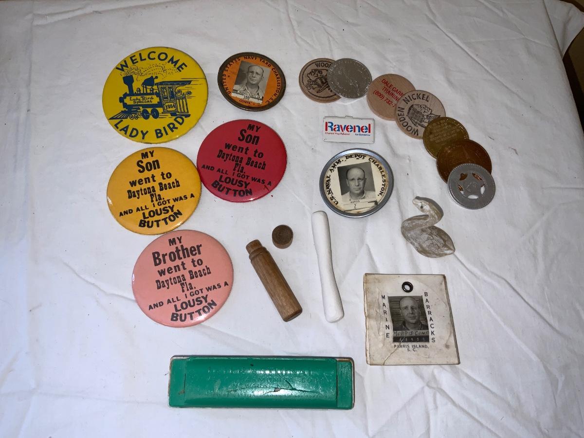 Lot of vintage items including buttons, Old Navy Buttons. Misc Coin collectibles. See pics for condition