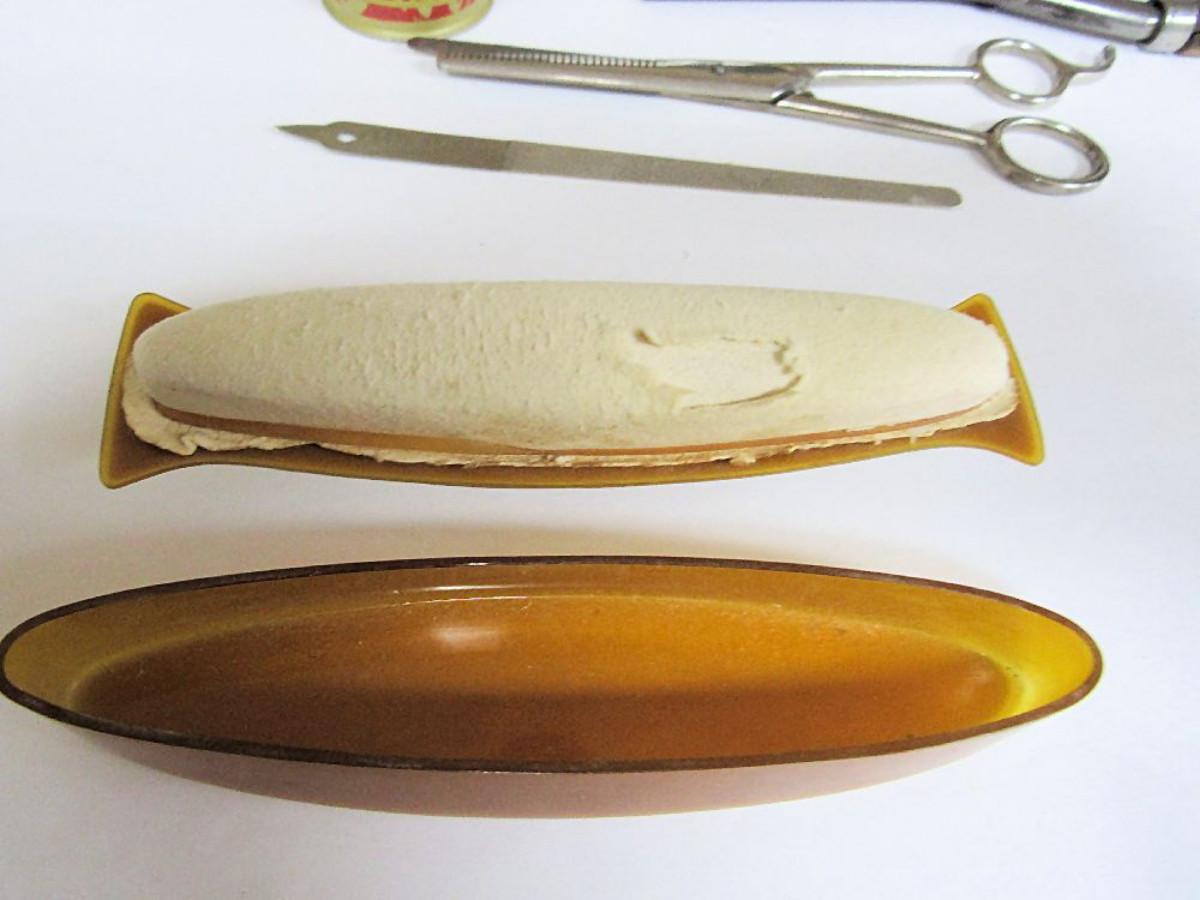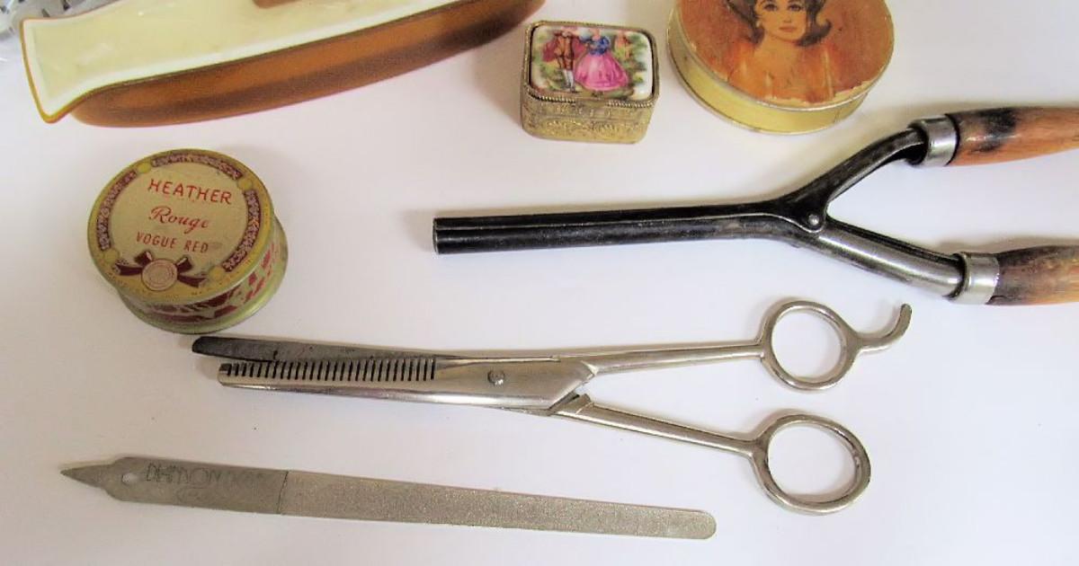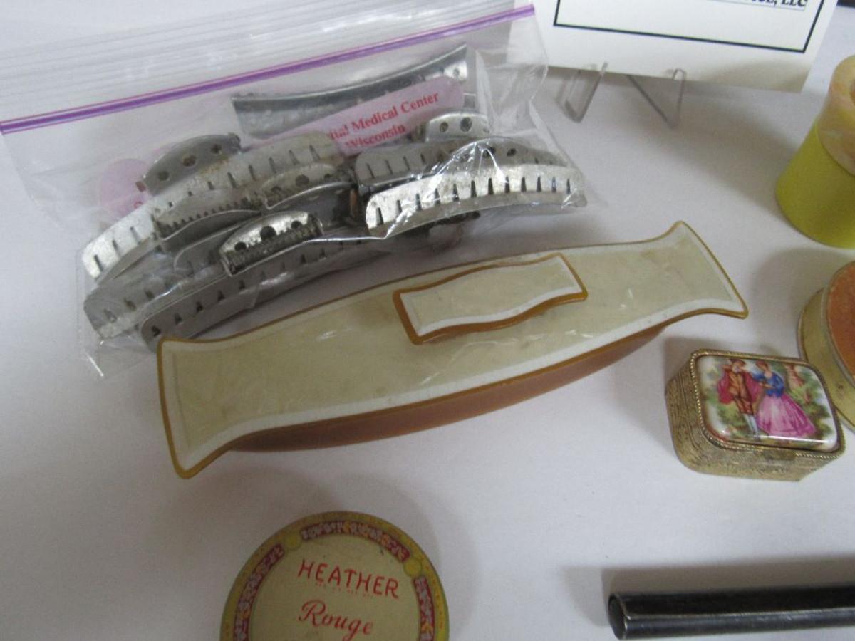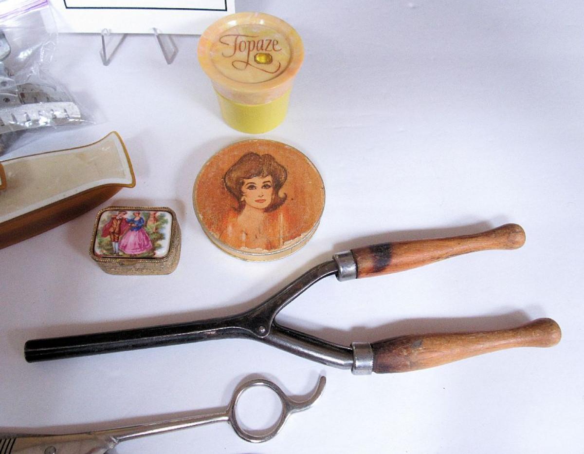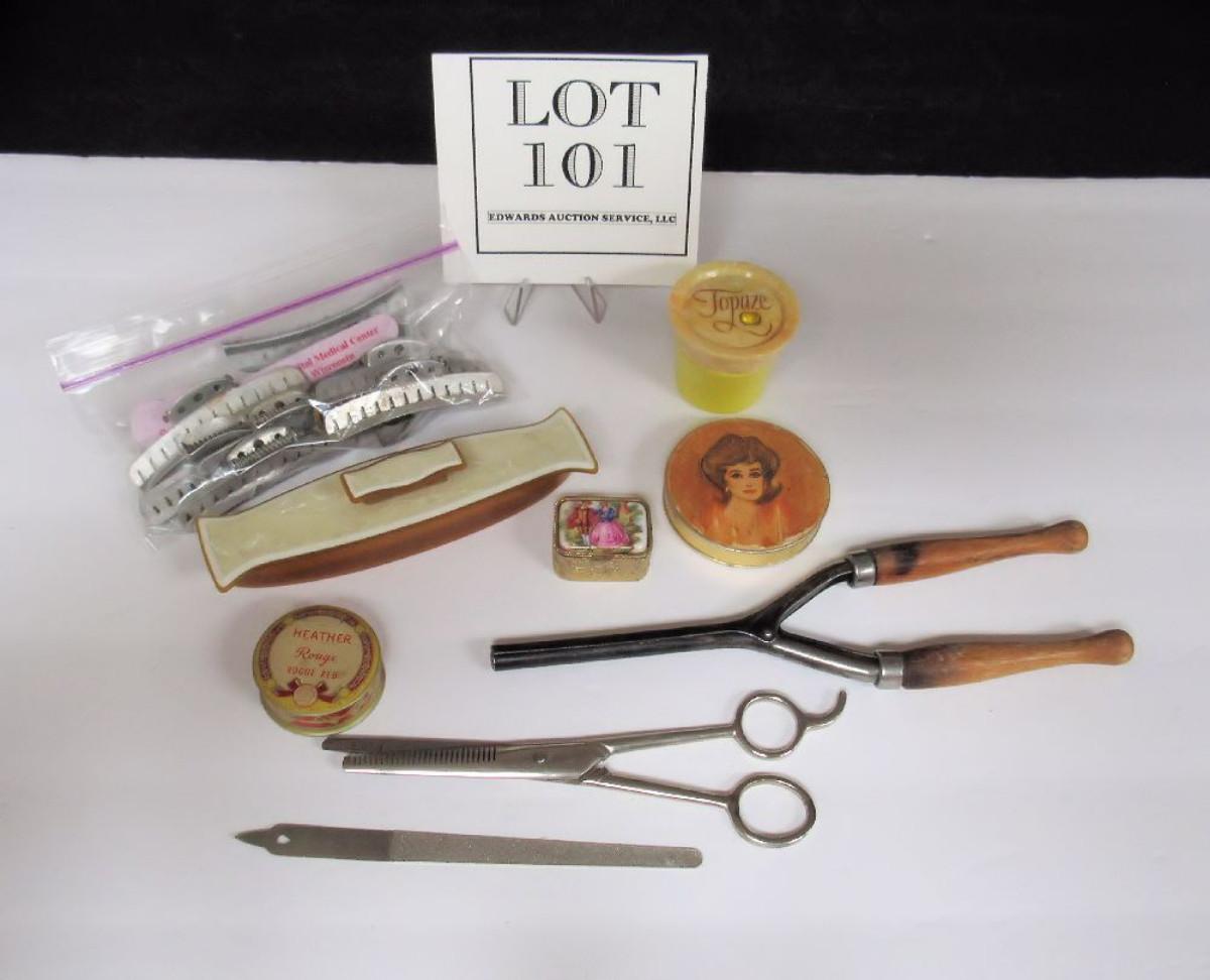 Old curling iron, hair clips, compact, rouge tin, empty Topaz jar, celluloid box. The celluloid box cover swede is torn as seen in photo. Shipping is available at shipping cost plus $5.00 handling fee on one box, $10.00 handling fee on two boxes, $15.00 handling fee on 3 boxes. Helps cover shipping materials and labor cost.