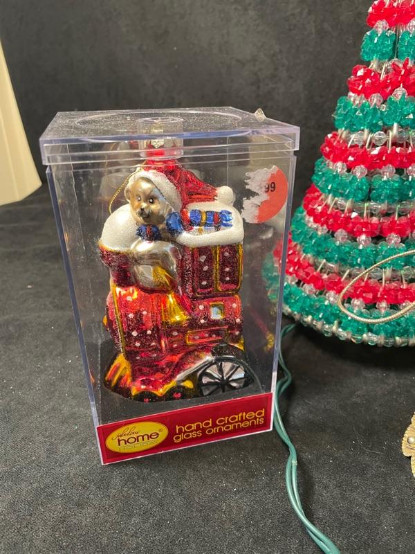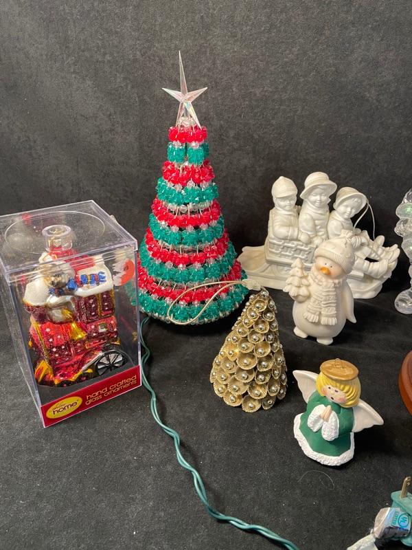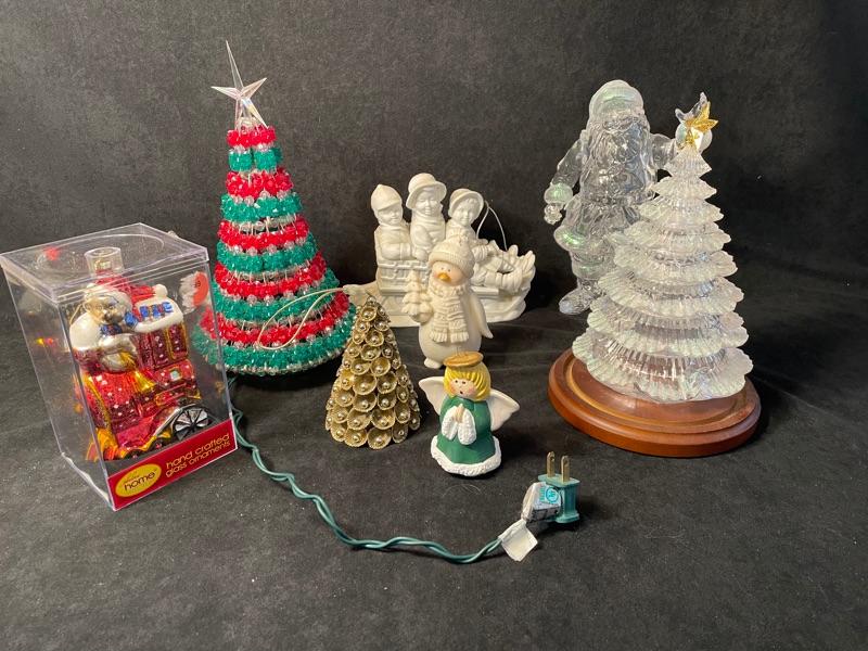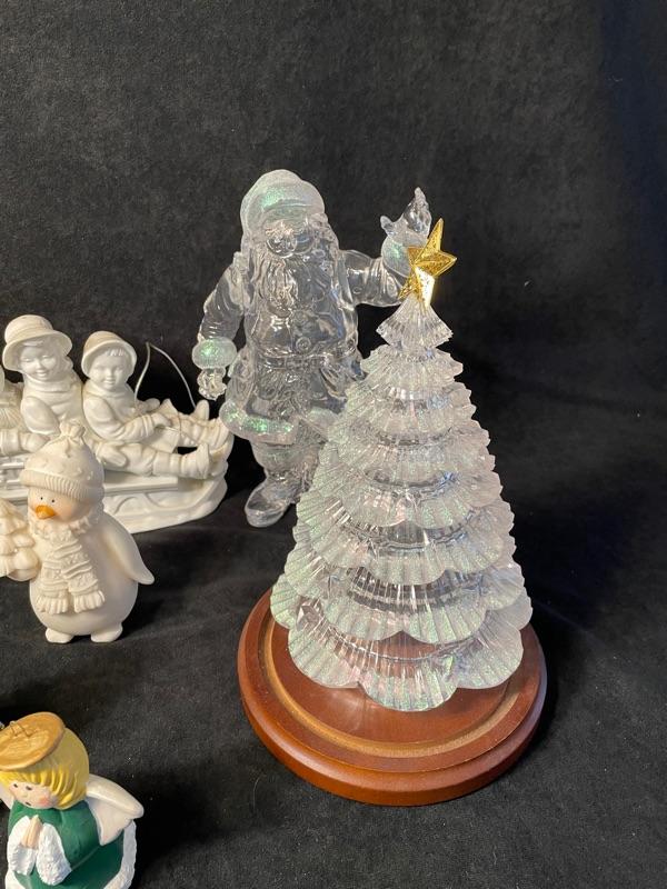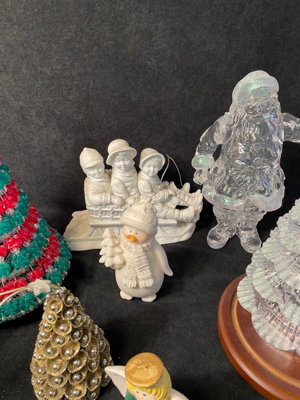 Dept 56 sleigh figurine, two Christmas trees (6"), clear acrylic Santa figurine, tree-shaped ornament and angel ornament