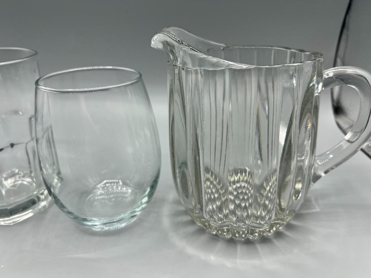 Lot of Miscellaneous Kitchen Glassware, Thick Glass Pitcher, Drinking Cups, & More