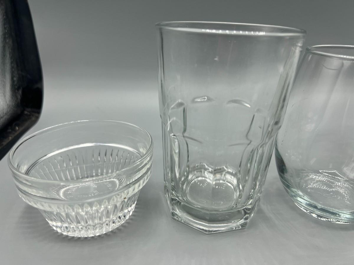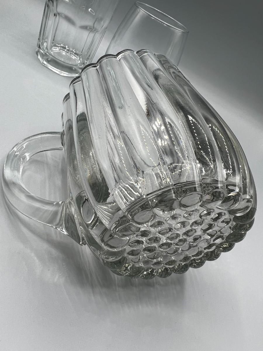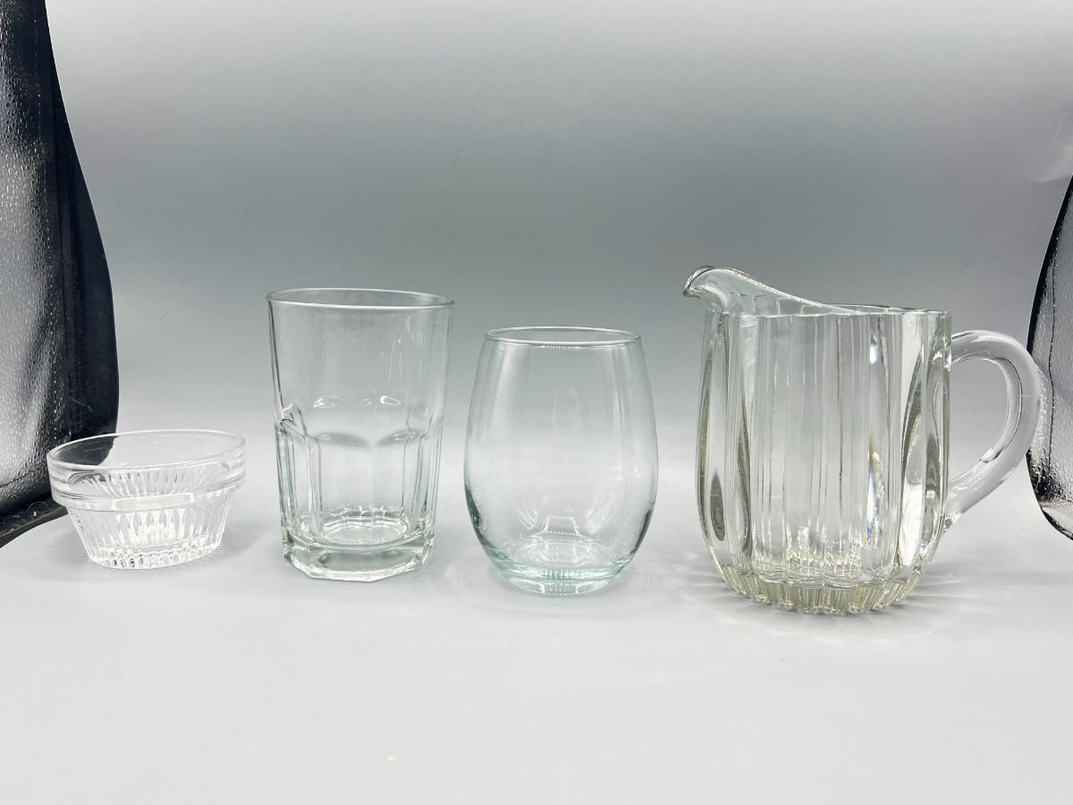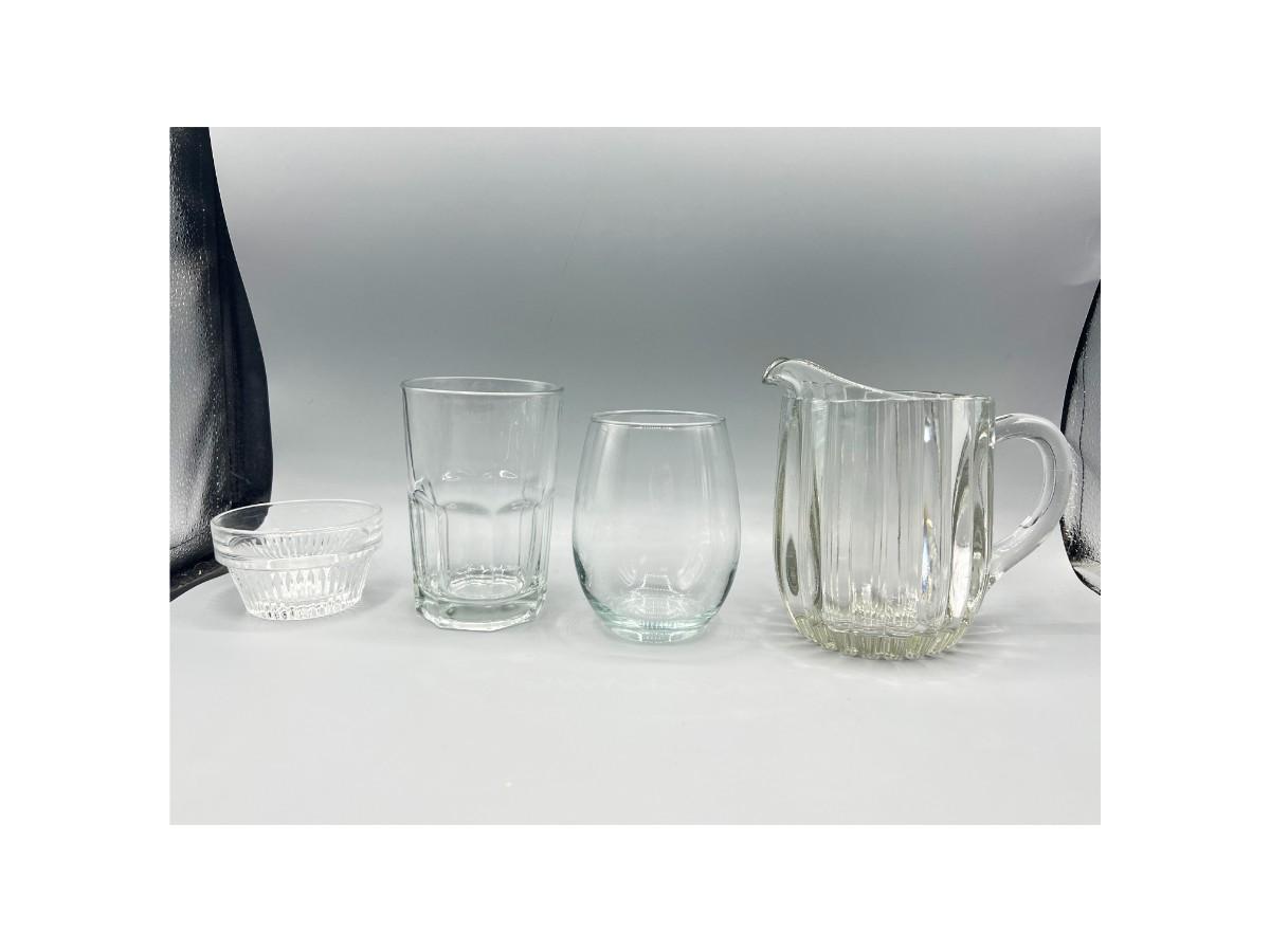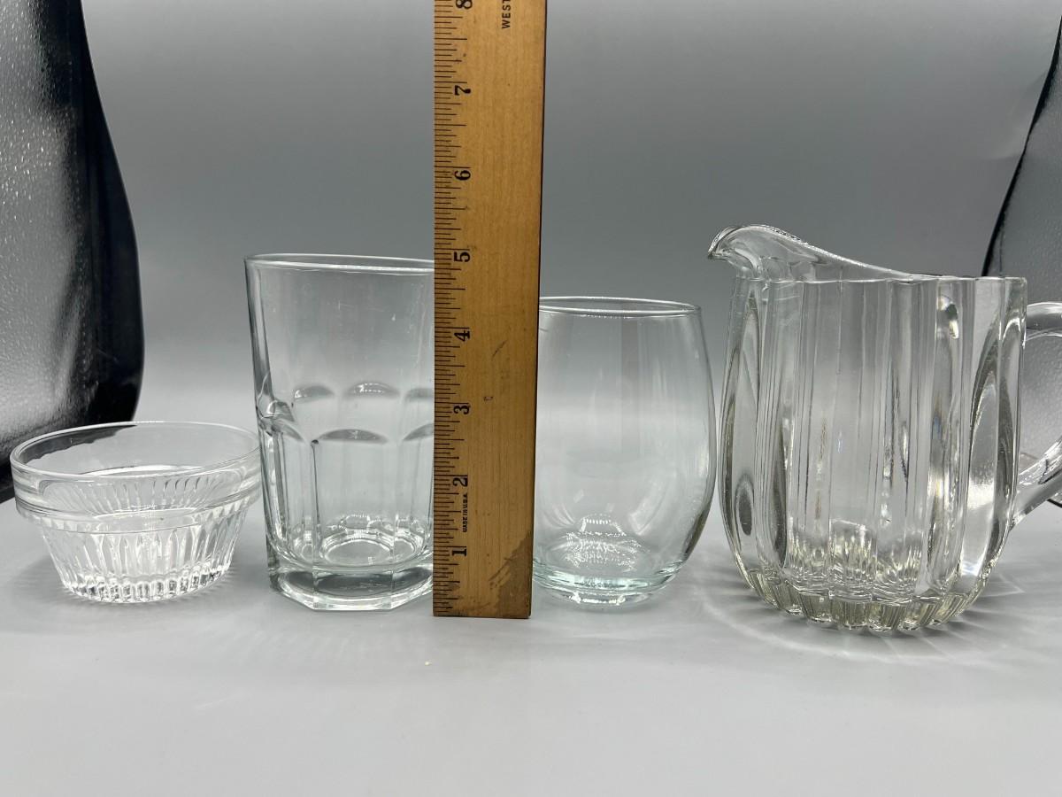 Lot of Miscellaneous Kitchen Glassware, Thick Glass Pitcher, Drinking Cups, & More, there is no significant cracks or chips to any of the pieces included in the lot and is in good useable condition. Check pictures for more details and for sizing.
