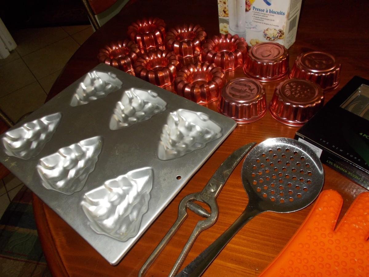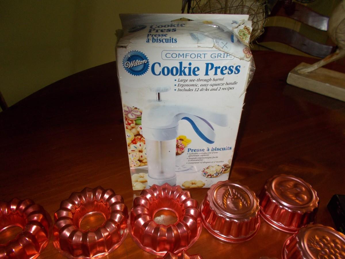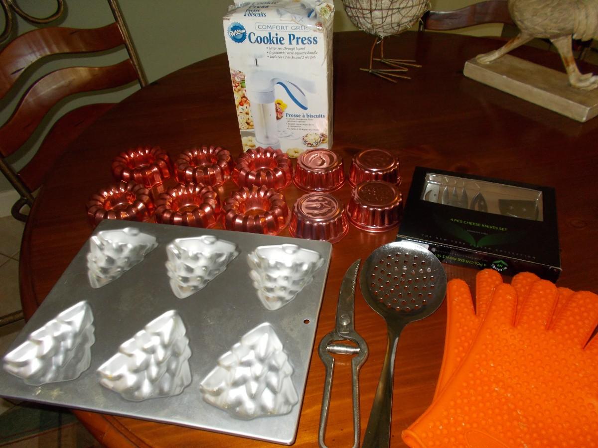 This lot includes a Wilton 6 tree cake pan, a wilton cookie presss, a set of cheese cutters, kitchen shears, large stainless steel straining spoon, 10 mini molds (four solid decorative moldsand 6 mini bundt pans.
