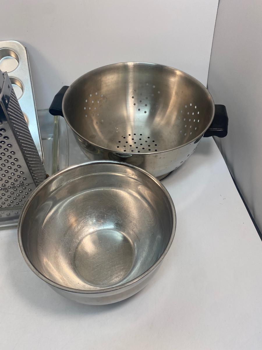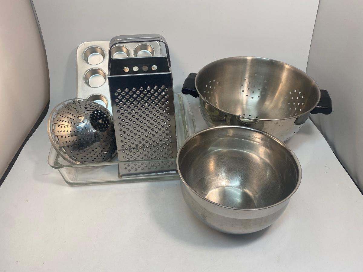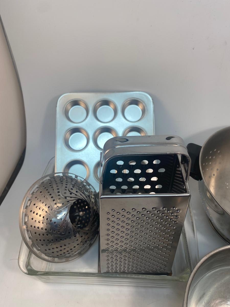 Lot of Miscellaneous Kitchenware Cheese Grater, Muffin Tin, Strainer & More
