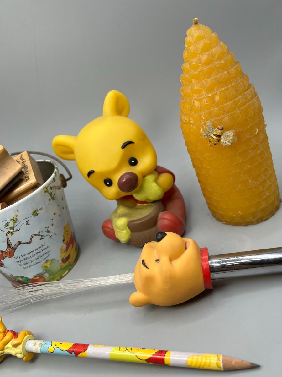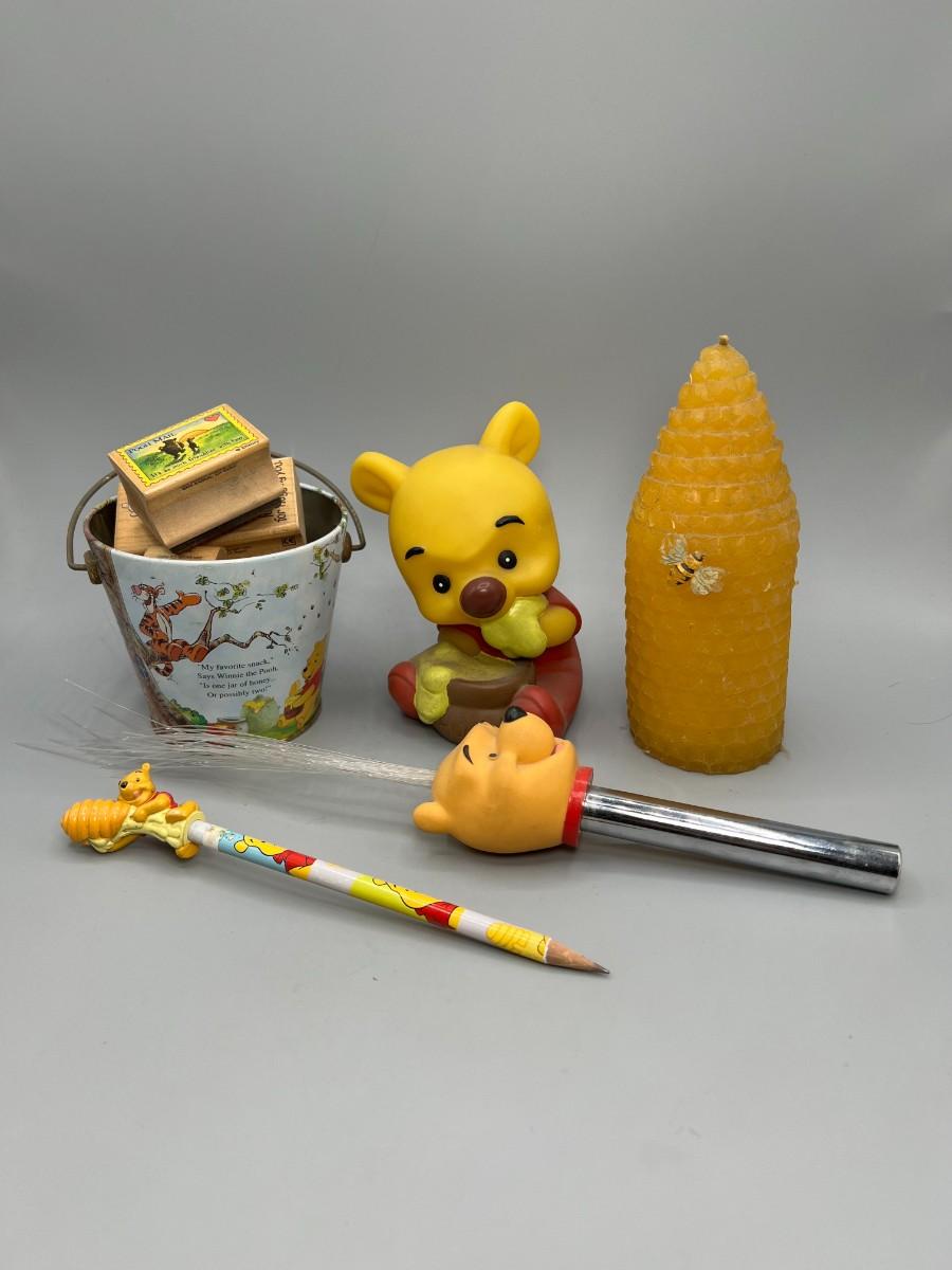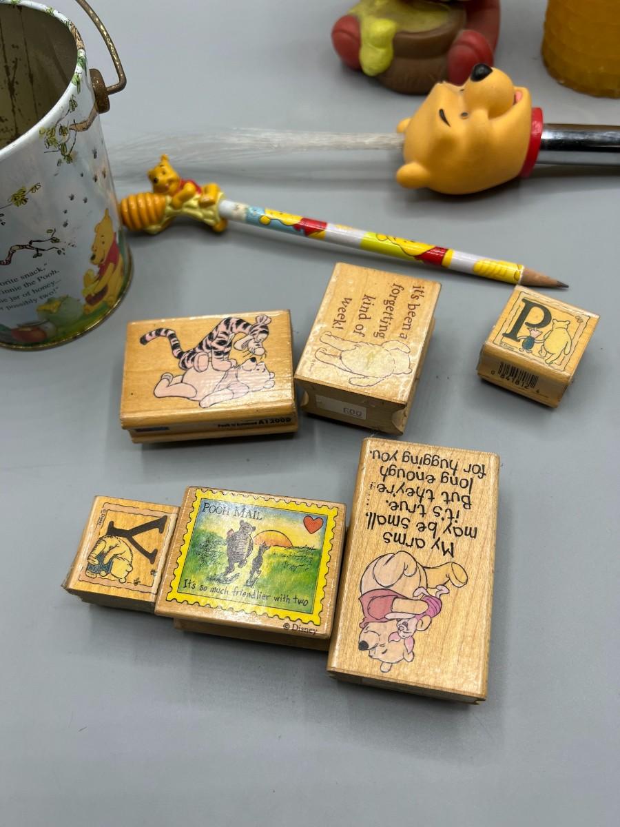 Lot of Miscellaneous Winnie the Pooh Items Plastic Figurine, Tin Bucket, Stamps, & More