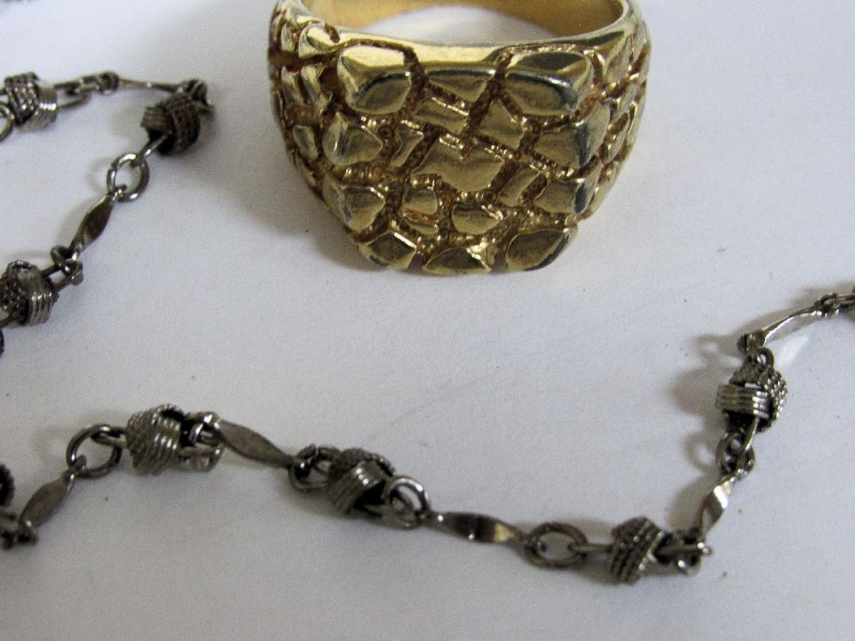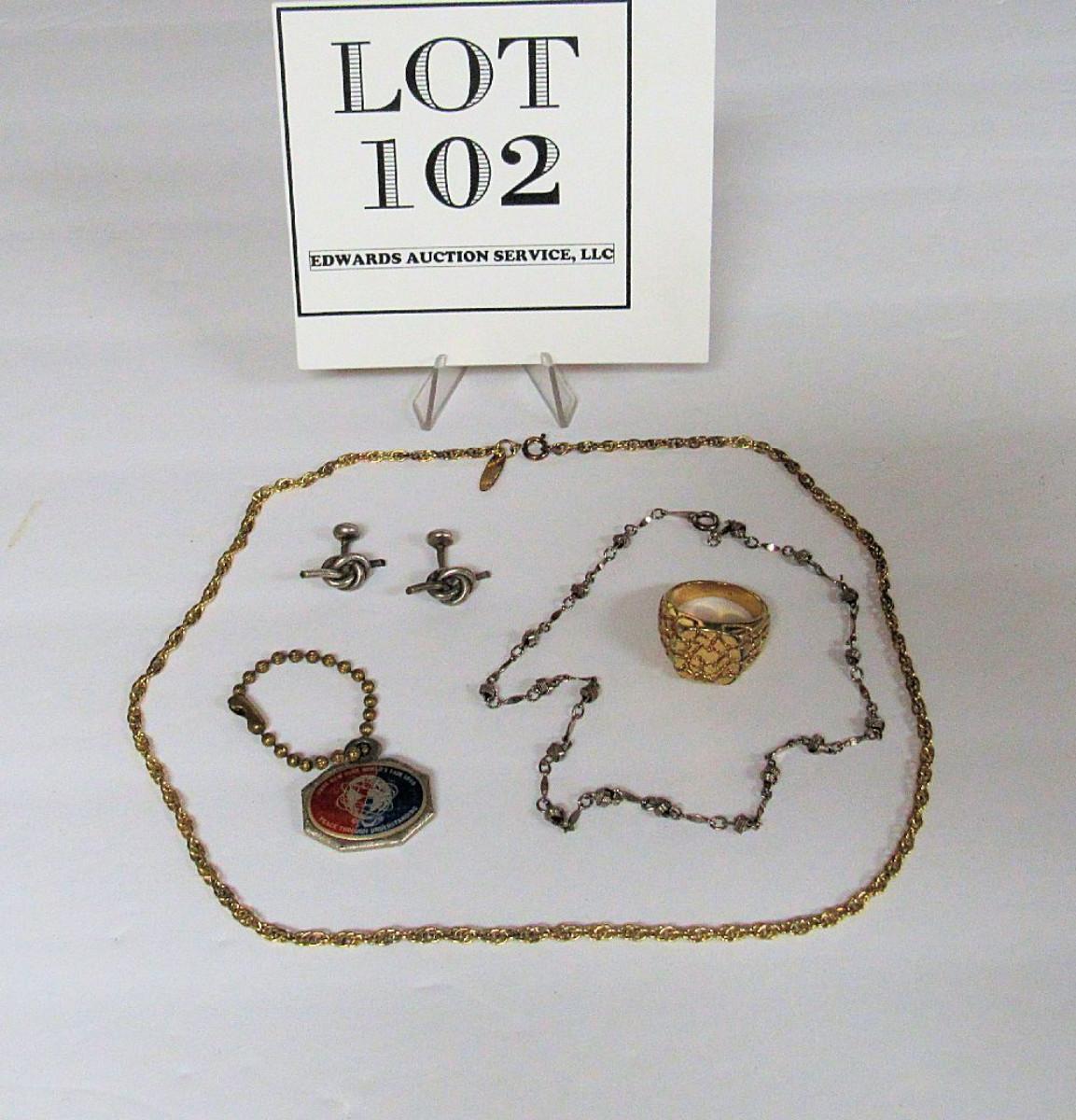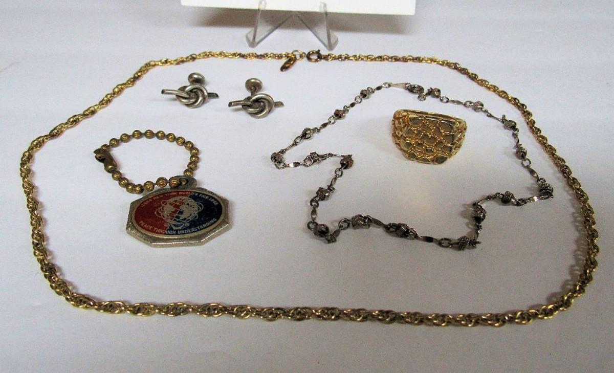 Lot of Mixed Jewelry, Whiting and Davis Gold Tone Chain, Men's 12K GF Ring, New York World's Fair Key Ring, More