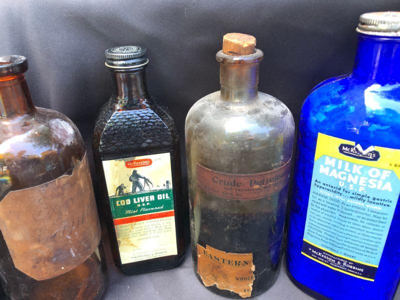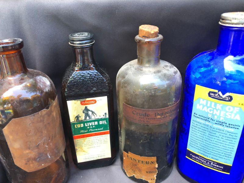 Lot of Mixed Large Glass Bottles. Includes, Early Blue Milk of Magnesia Bottle, Cod Liver Oil, Crude Petroleum, AQ Destill, and AQ Ment. PH. Bottles Consistent with Age. Tallest Bottle 10". NOT FOR CONSUMPTION>