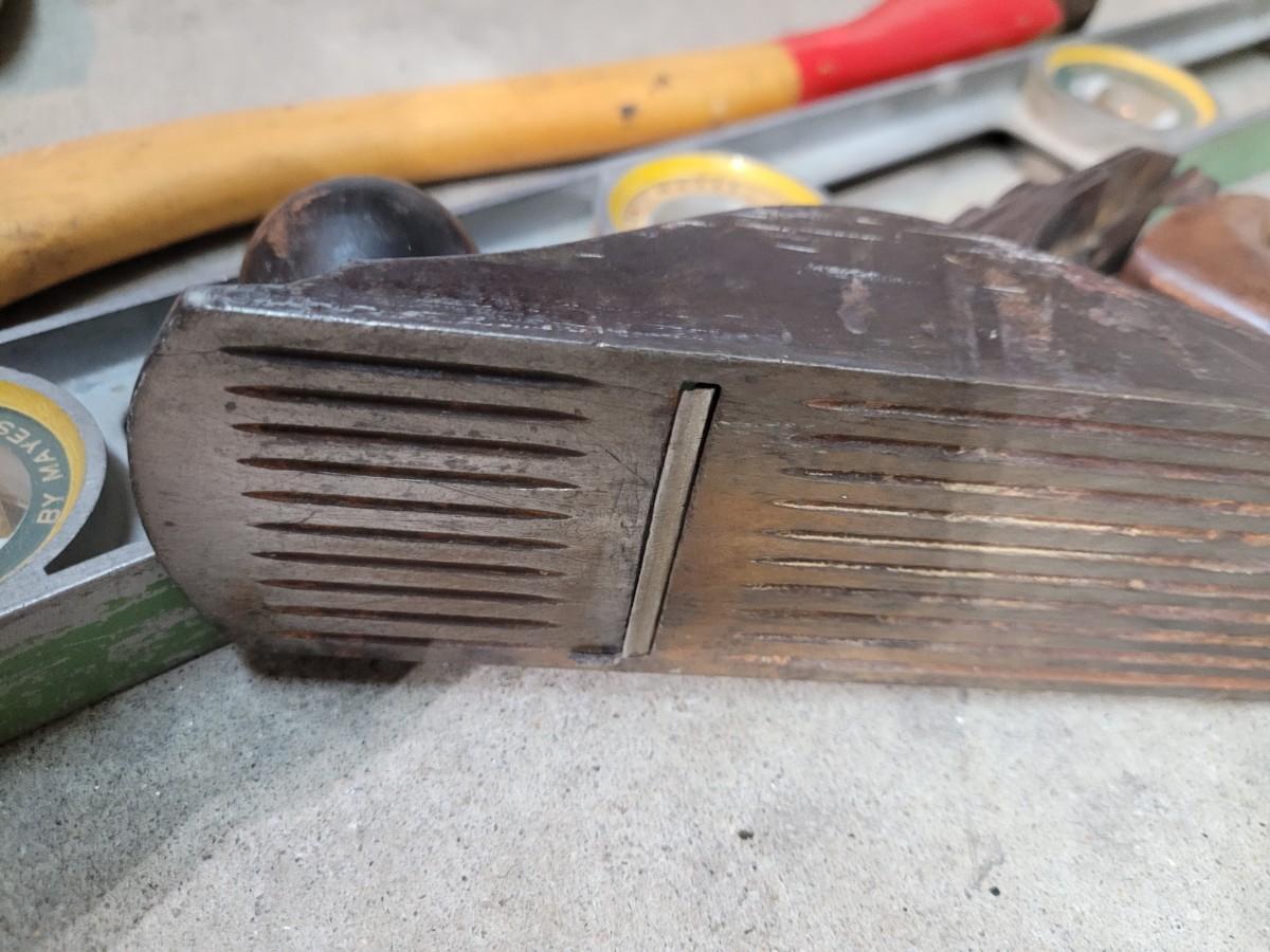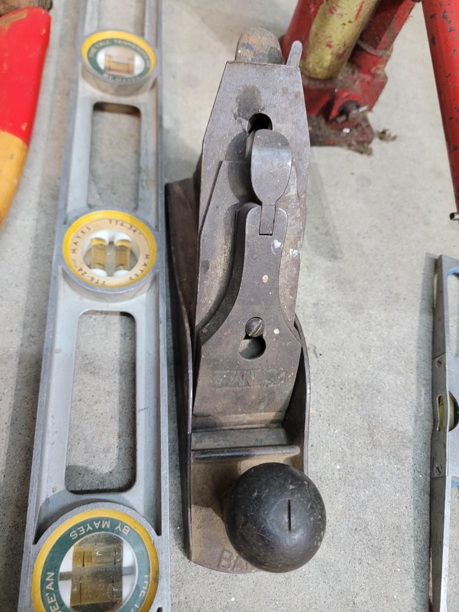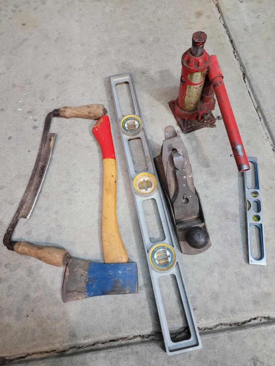 As pictured, 2 levels, a hatchet, 2 planers and a bottle jack, in garage