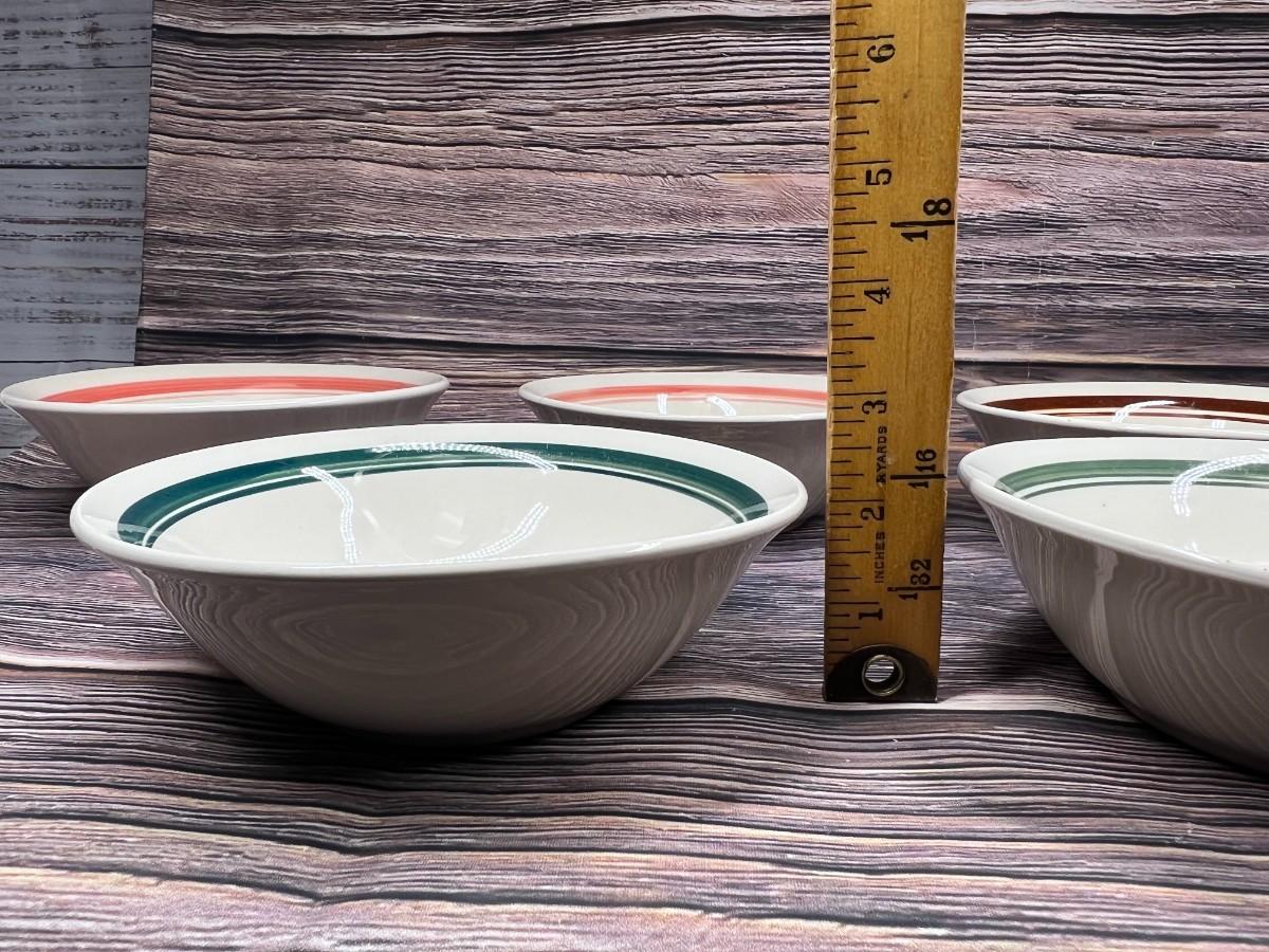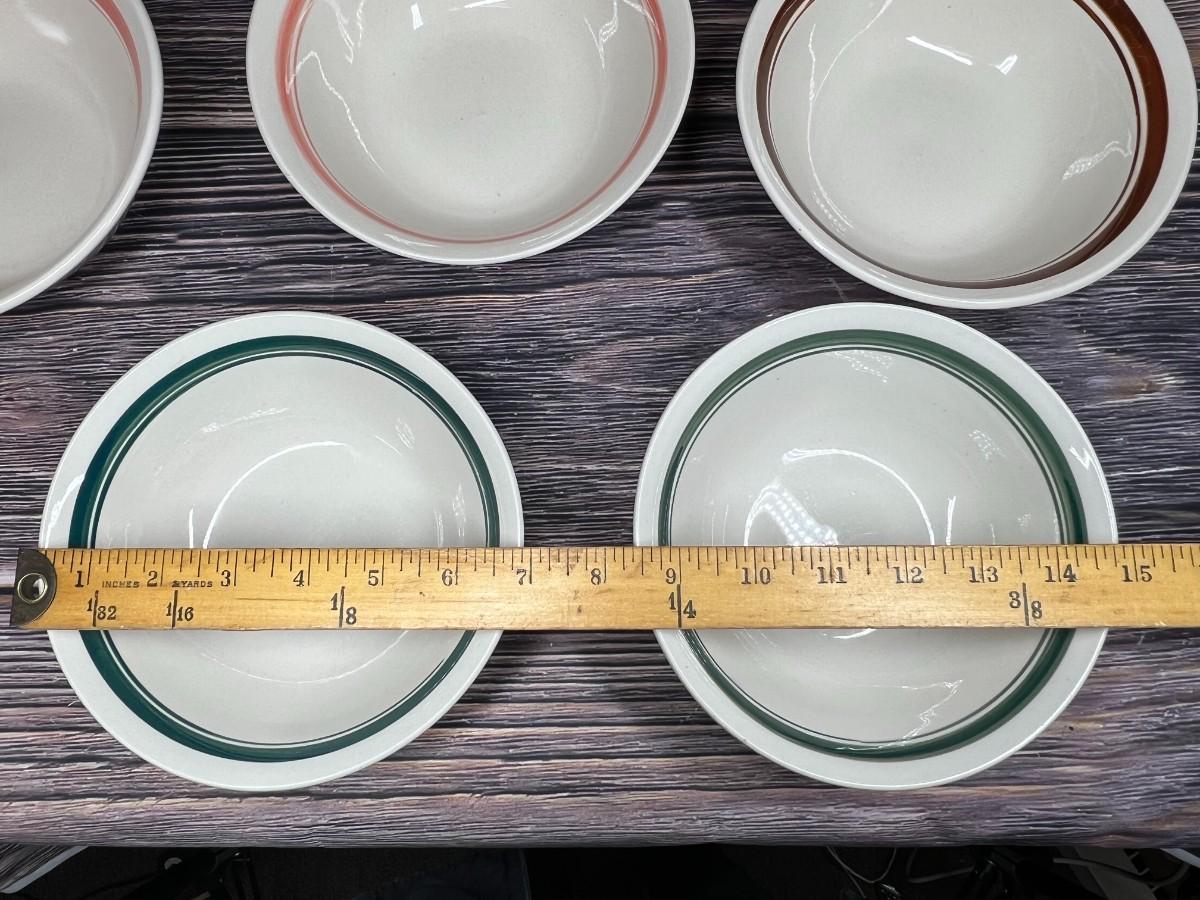 Lot of Multiple Color Band Ceramic Soup Serving Bowls, there is no significant damage to any of the soup bowls and is in good useable condition. Check pictures for more details and for sizing.