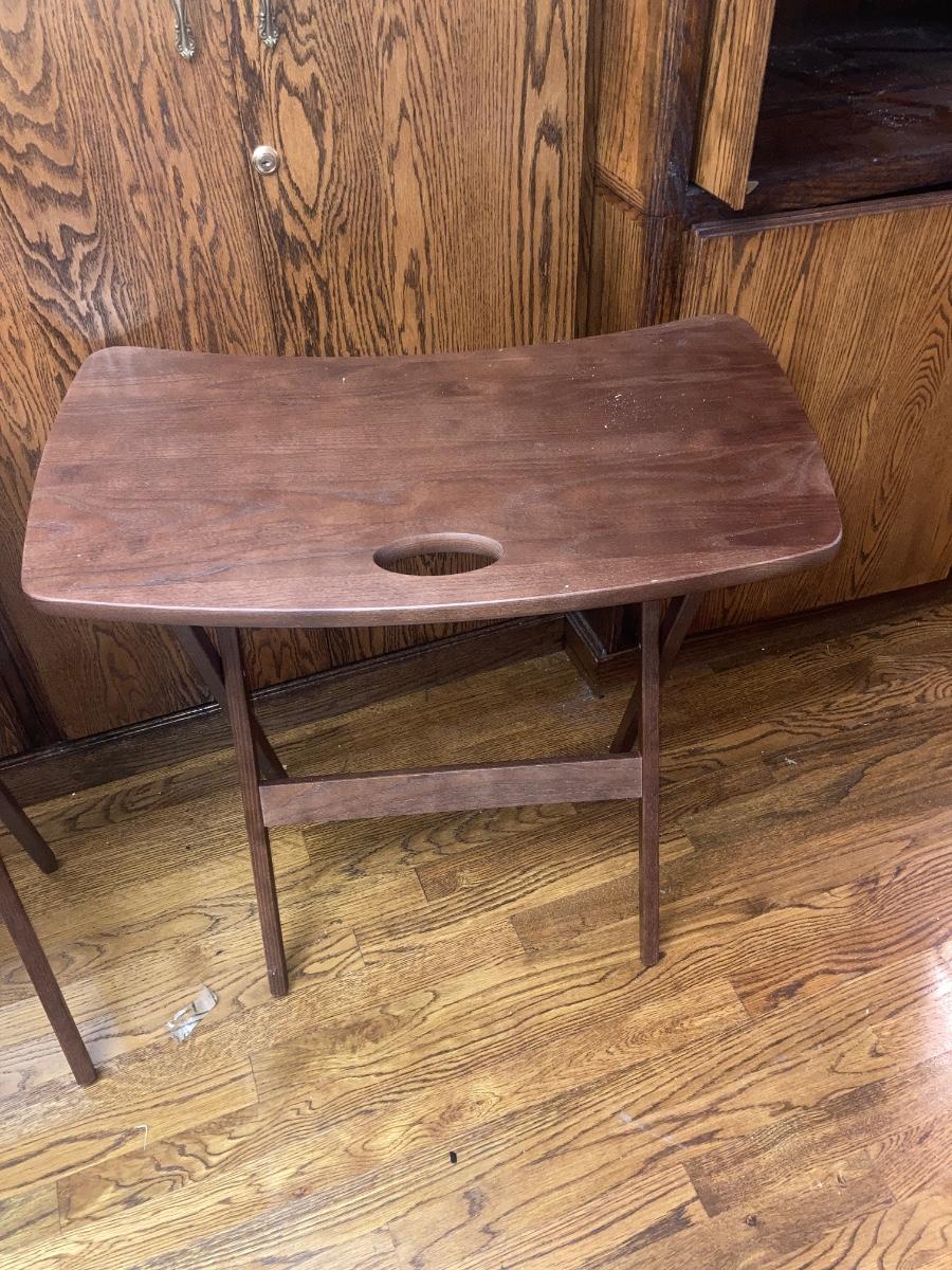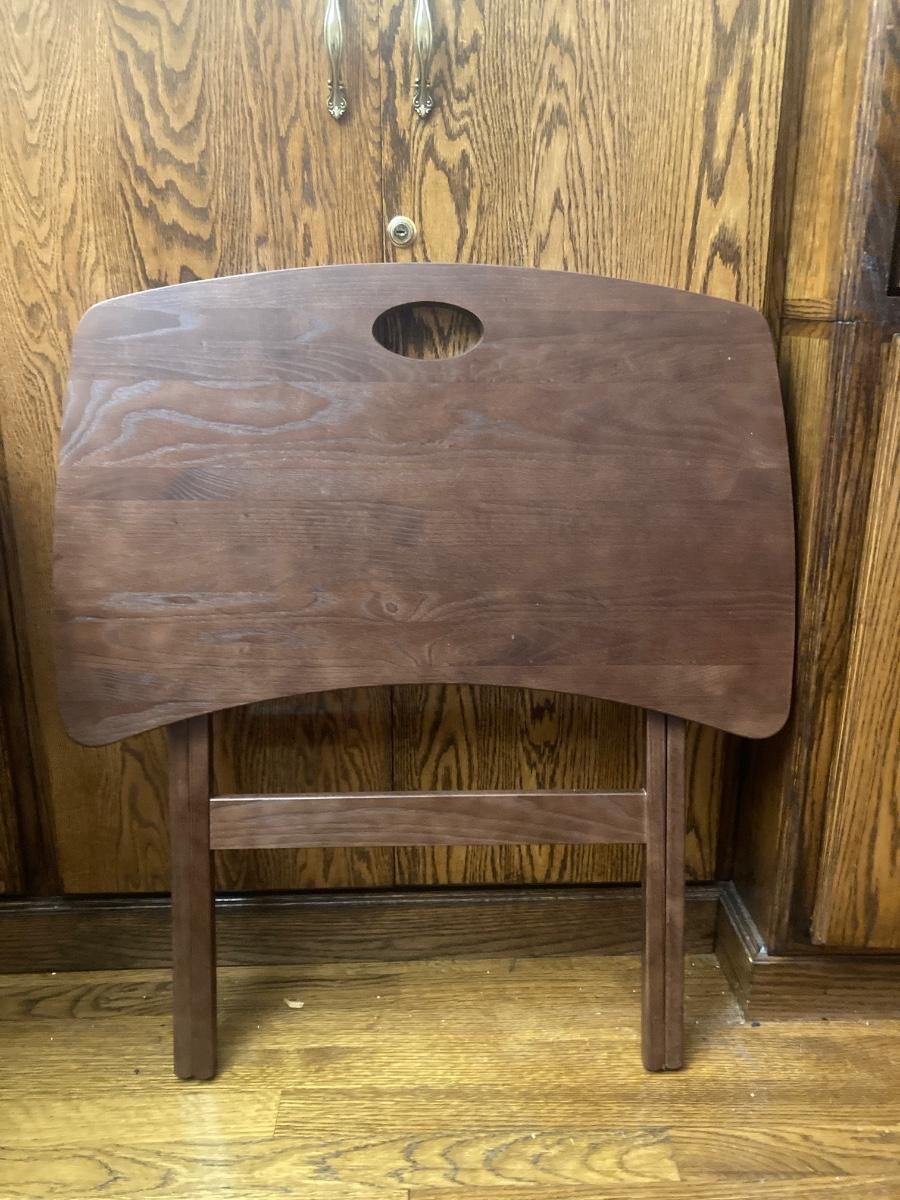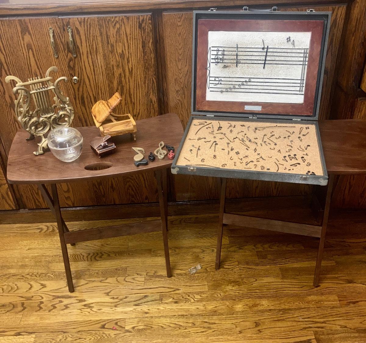 Pair of folding wood trays 25” x 26” 2 cast brass music notes 4”
