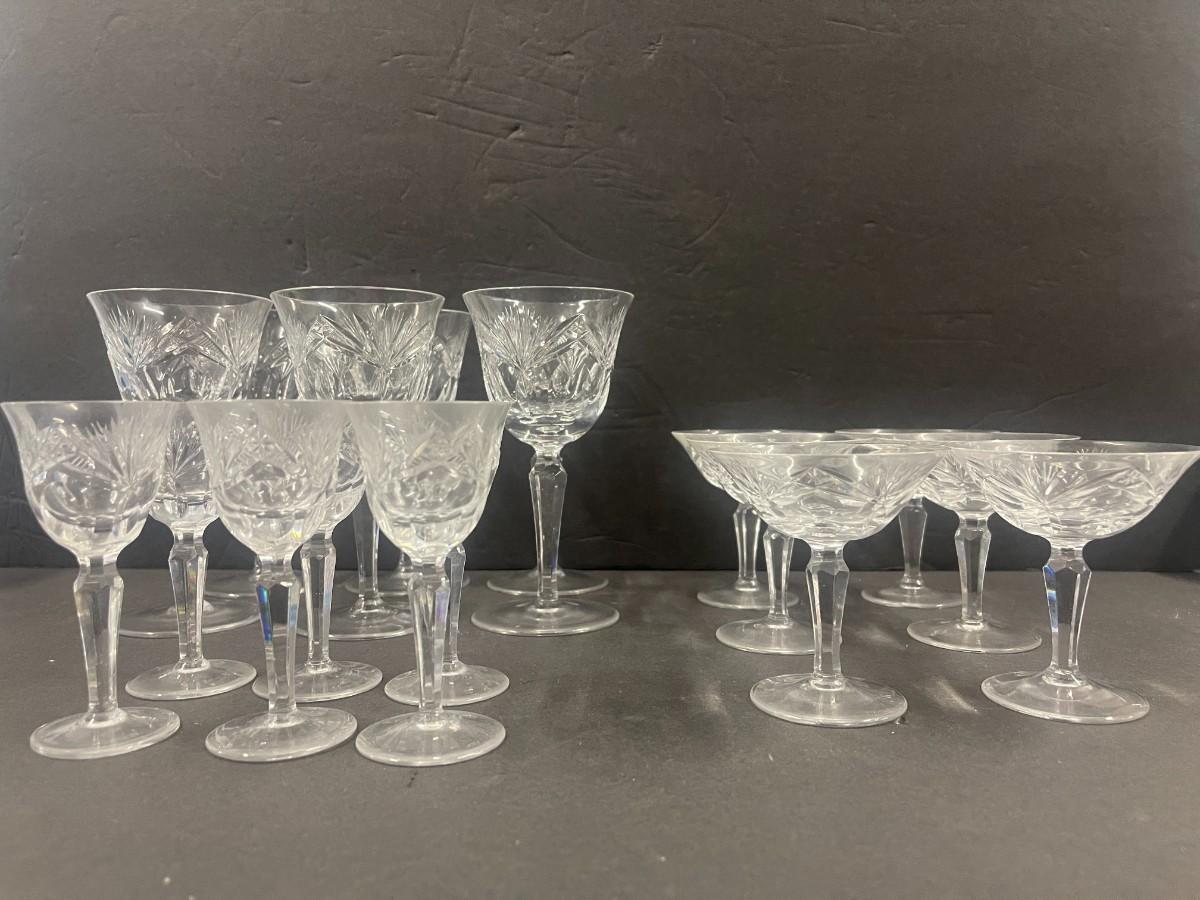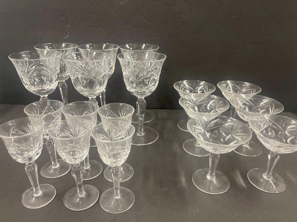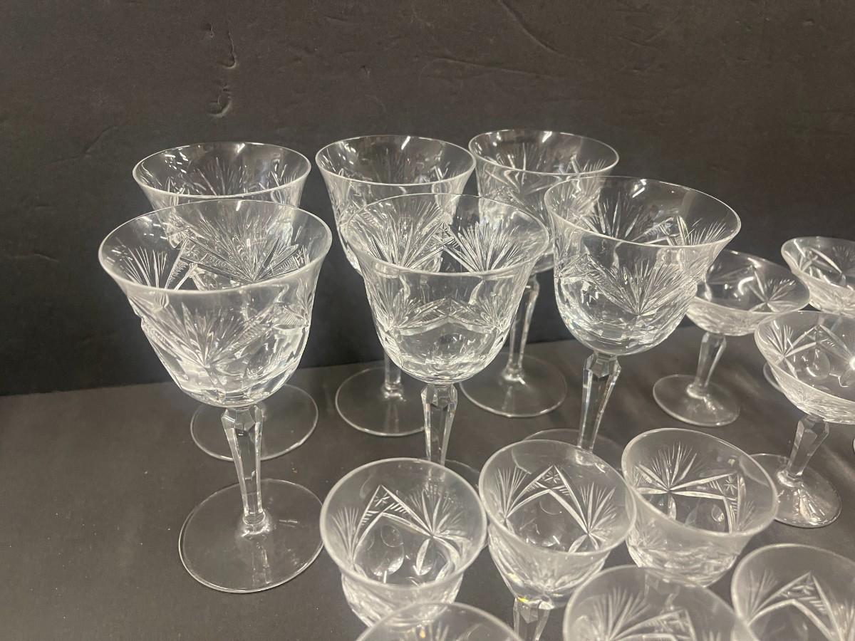 Lot of Nachtmann Andernach Clear Thumbprint Fans Stars Germany Stemware. Includes 6 wine glasses, 6 cordial glasses and 6 wide rim cocktail glasses. All excellent condition.