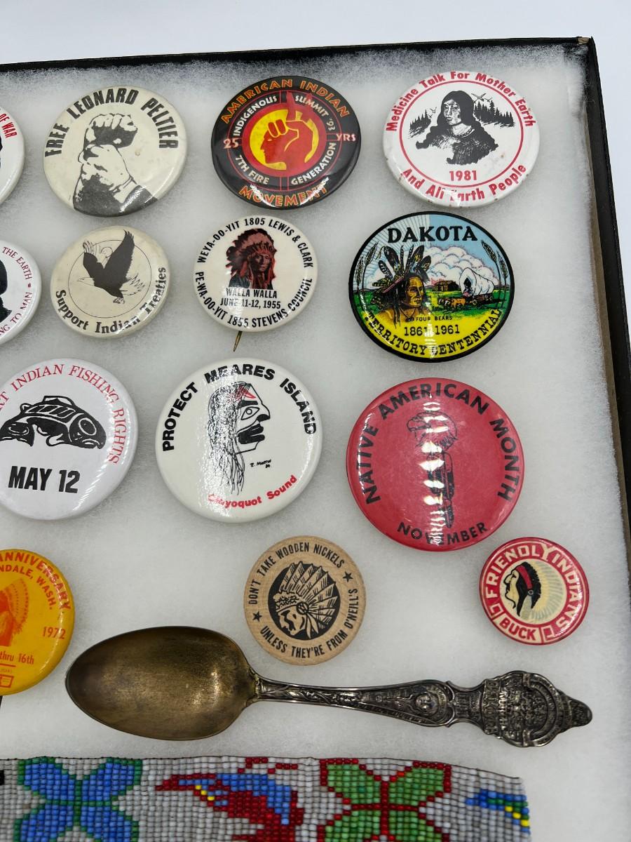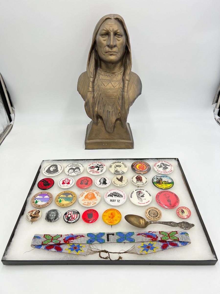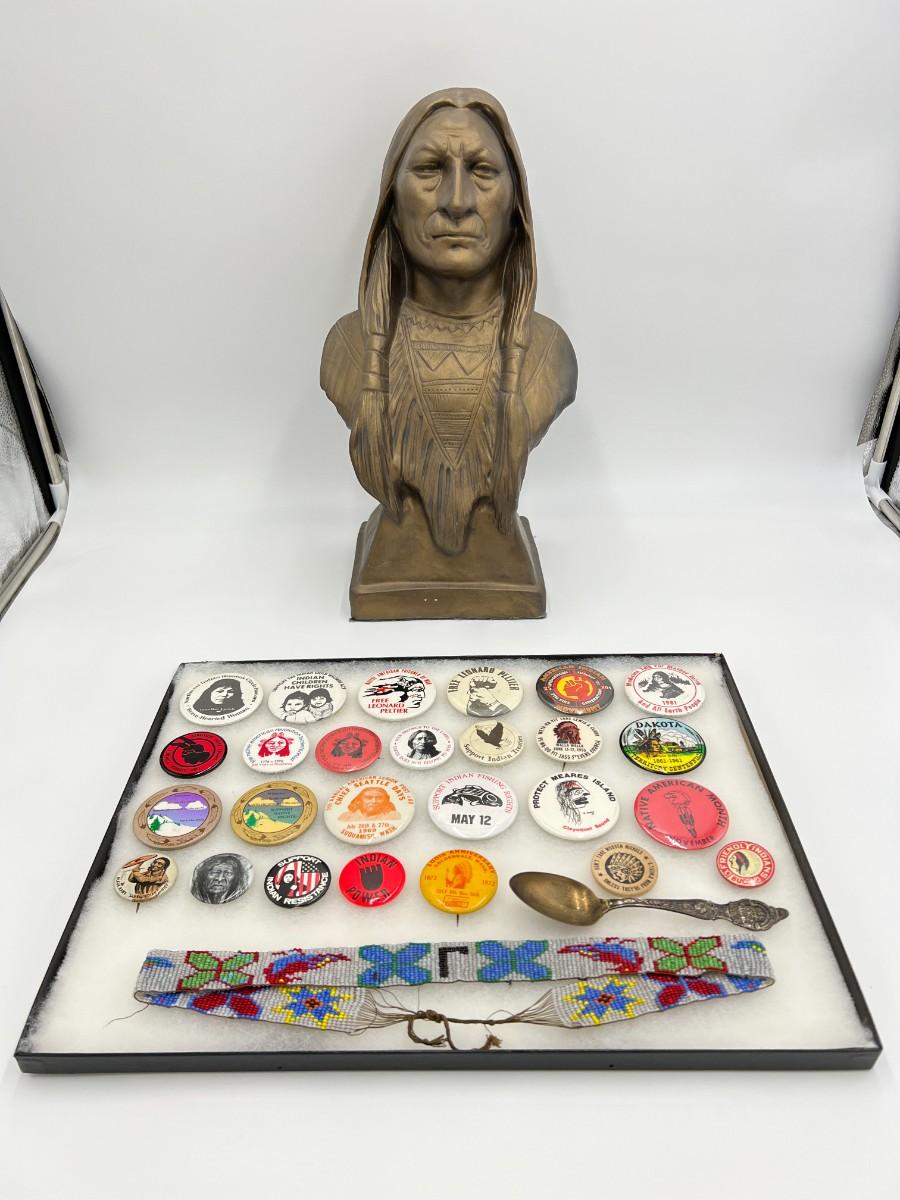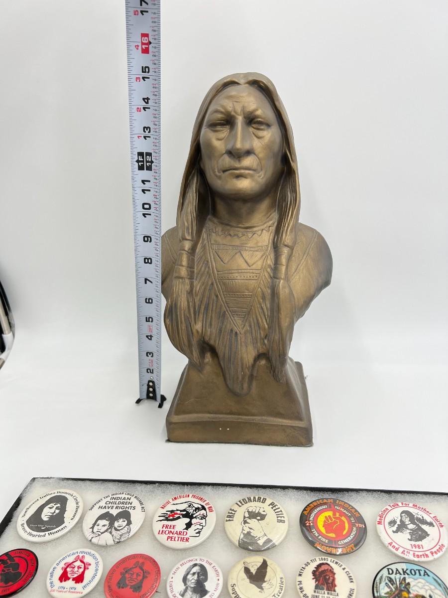Lot of Native American Buttons Statue and Collectibles. Includes a variety of vintage button pins related to Native American Indian causes and events from the 1950s onward. Lot also includes a beautiful portrait bust statue (appears to be Sitting Bull), beaded necklace, and collectible antique spoon featuring "Indian Squaw" from North Dakota.