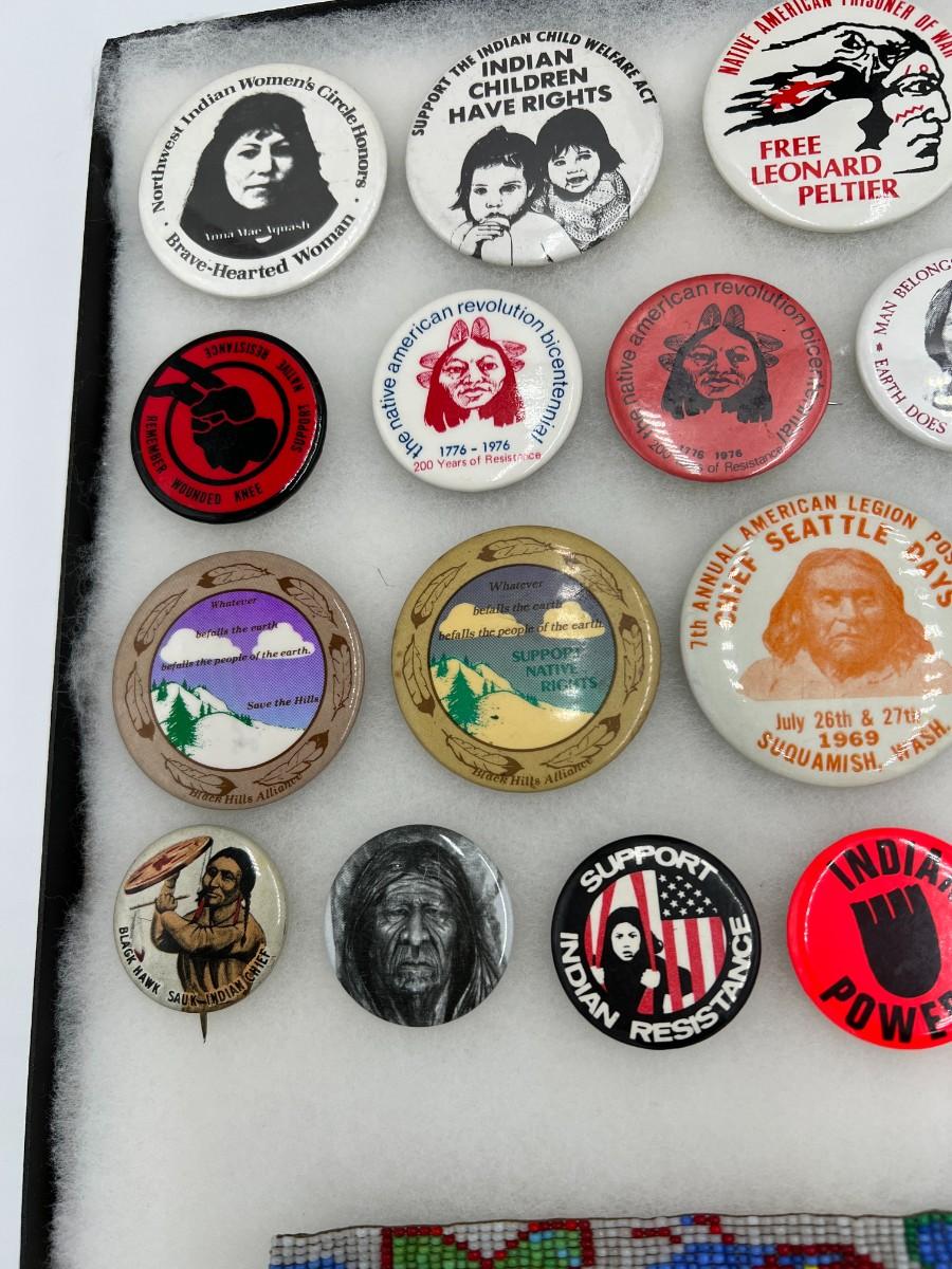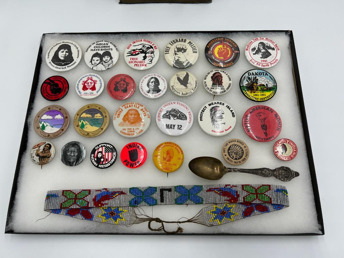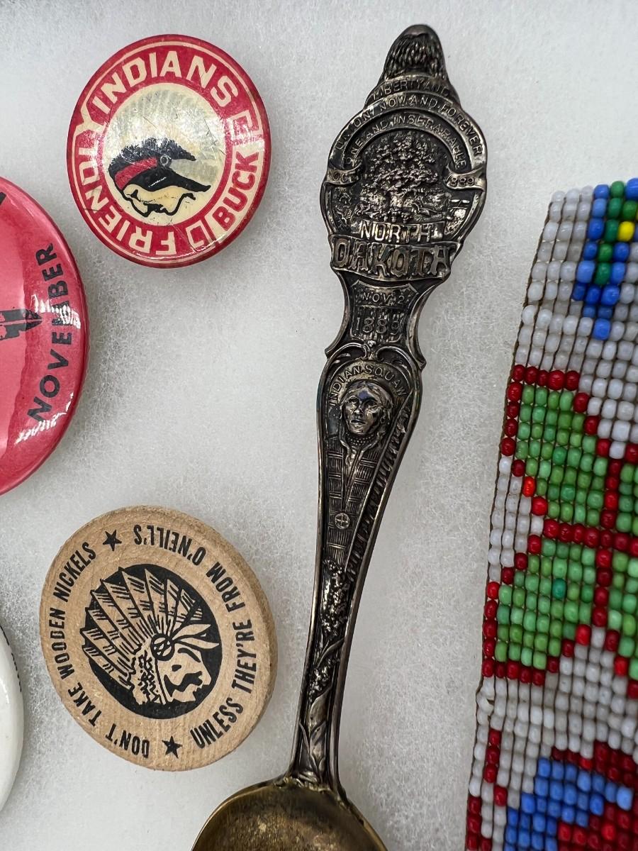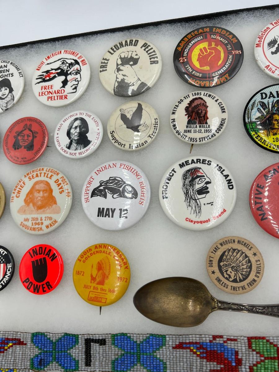 Lot of Native American Buttons Statue and Collectibles. Includes a variety of vintage button pins related to Native American Indian causes and events from the 1950s onward. Lot also includes a beautiful portrait bust statue (appears to be Sitting Bull), beaded necklace, and collectible antique spoon featuring "Indian Squaw" from North Dakota.