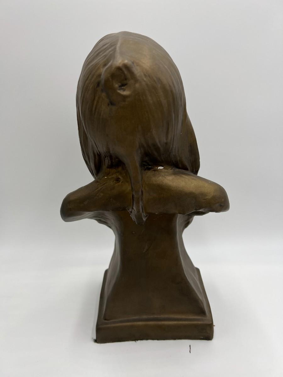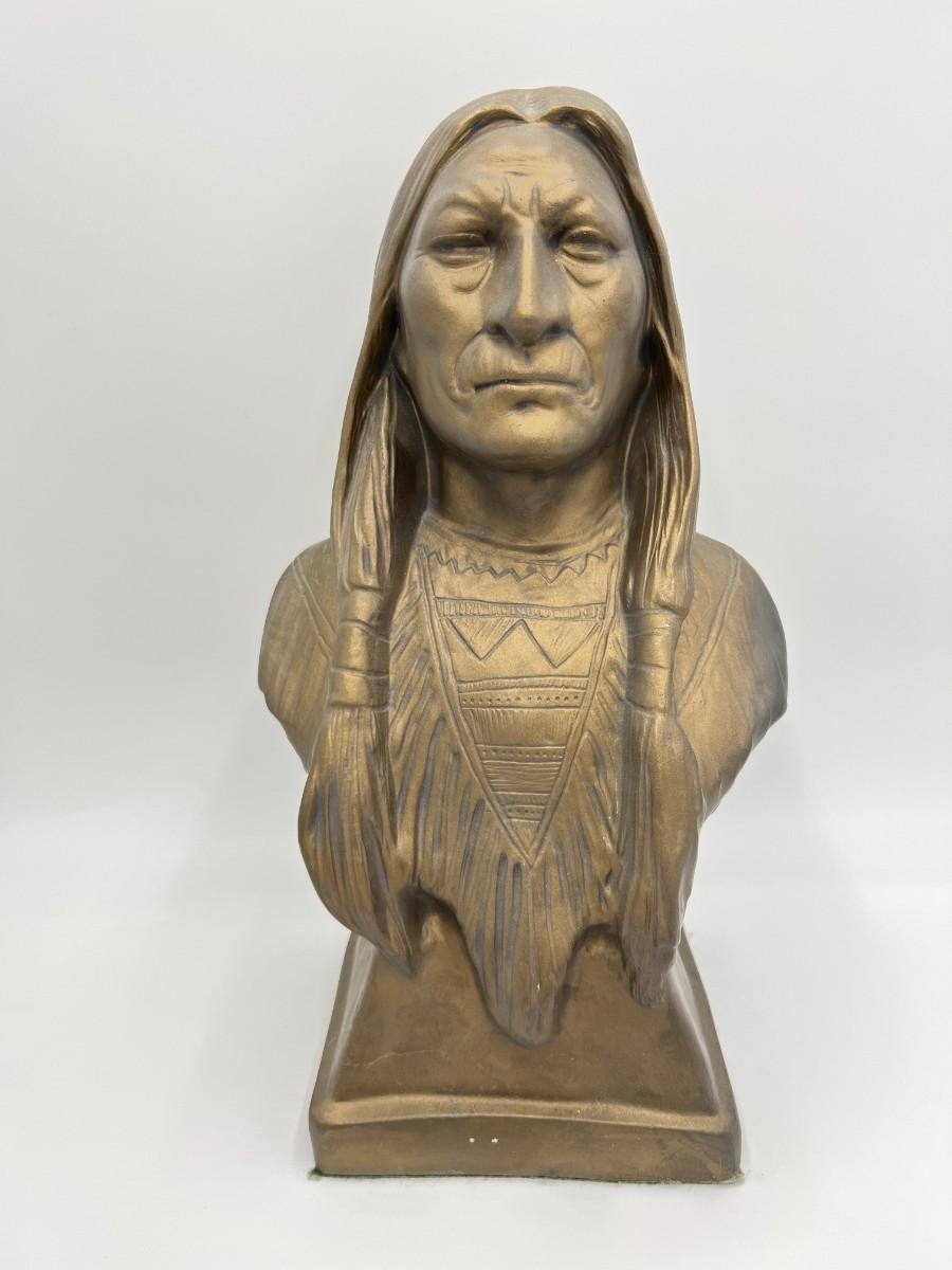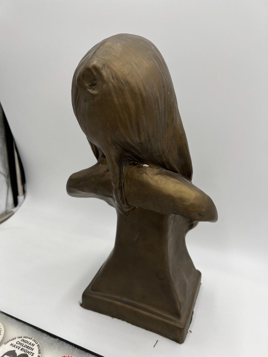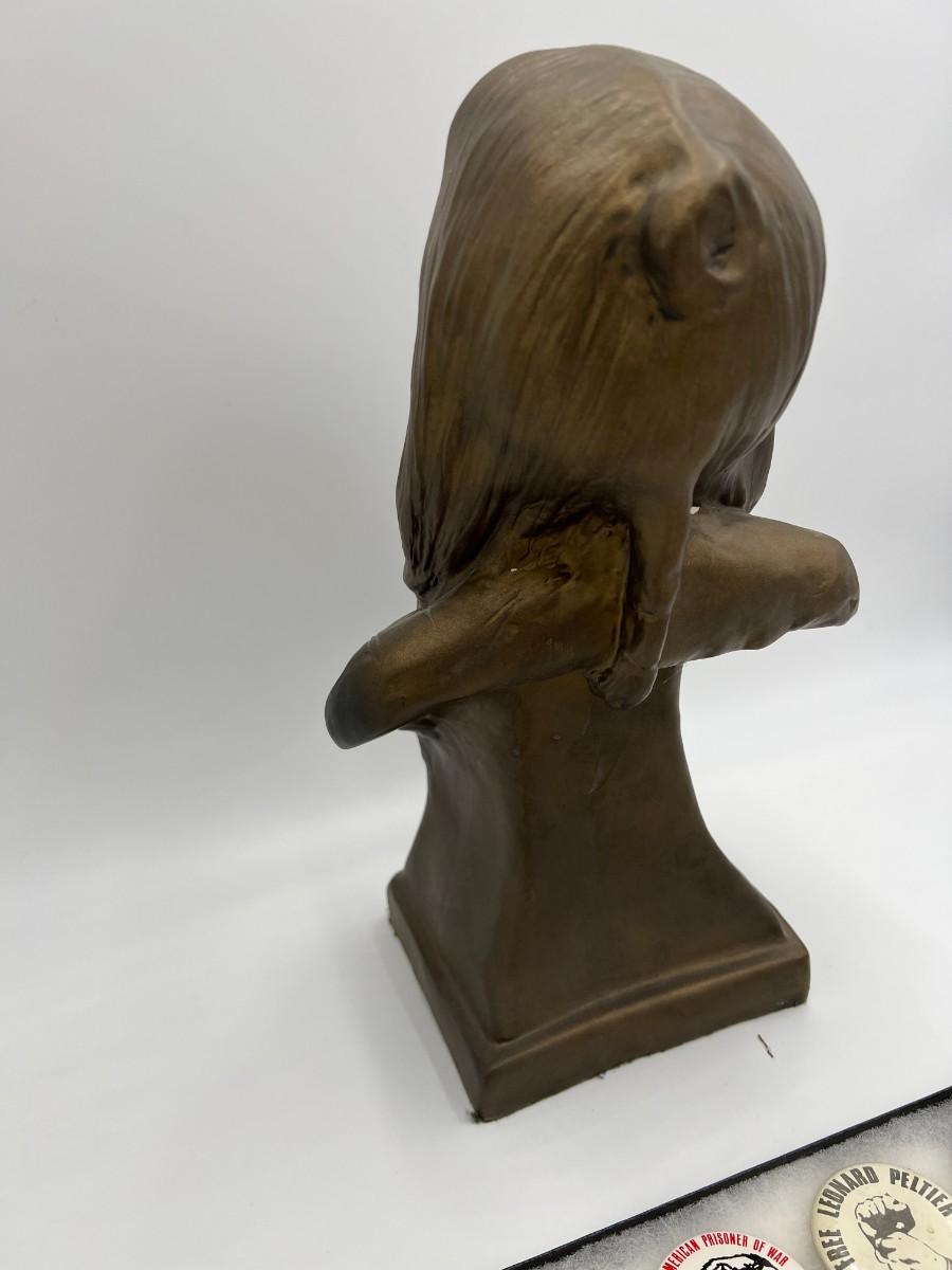 Lot of Native American Buttons Statue and Collectibles. Includes a variety of vintage button pins related to Native American Indian causes and events from the 1950s onward. Lot also includes a beautiful portrait bust statue (appears to be Sitting Bull), beaded necklace, and collectible antique spoon featuring "Indian Squaw" from North Dakota.