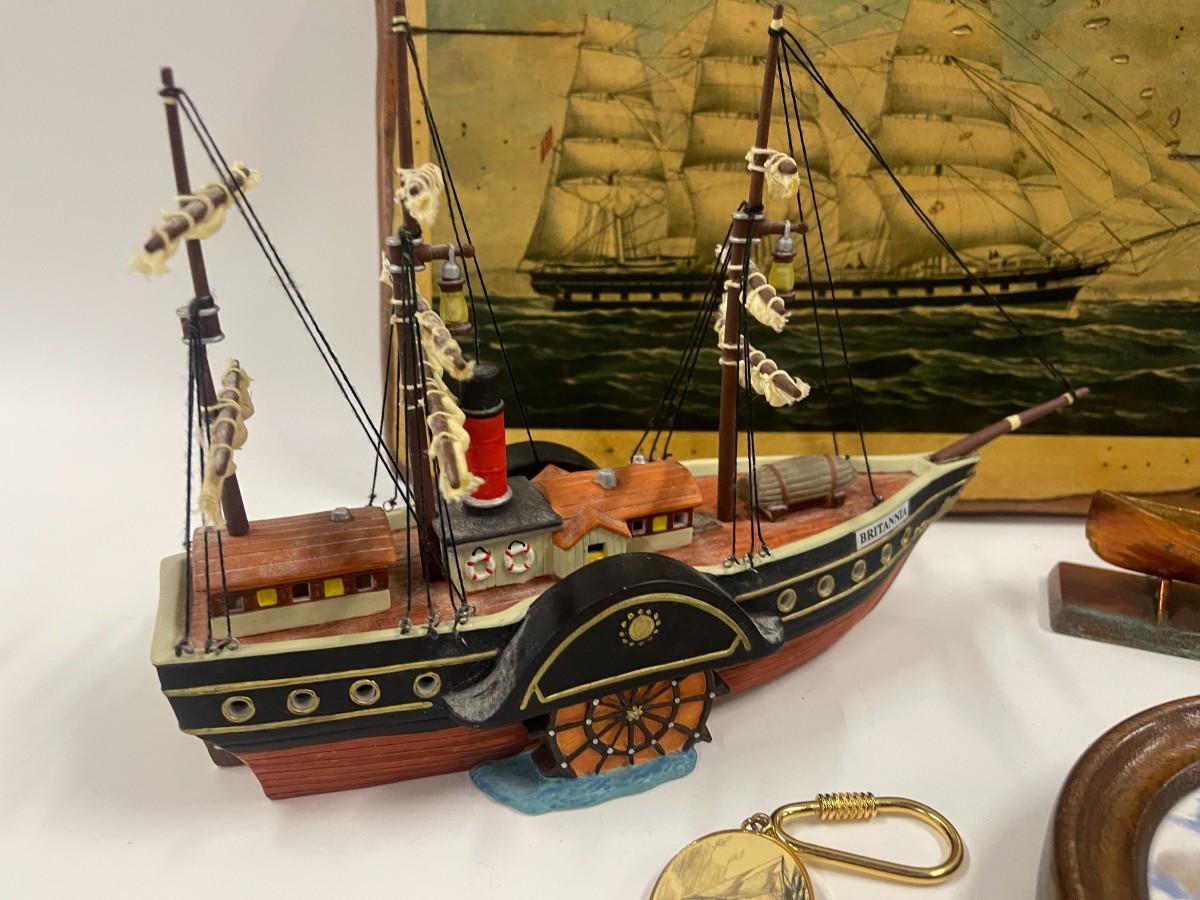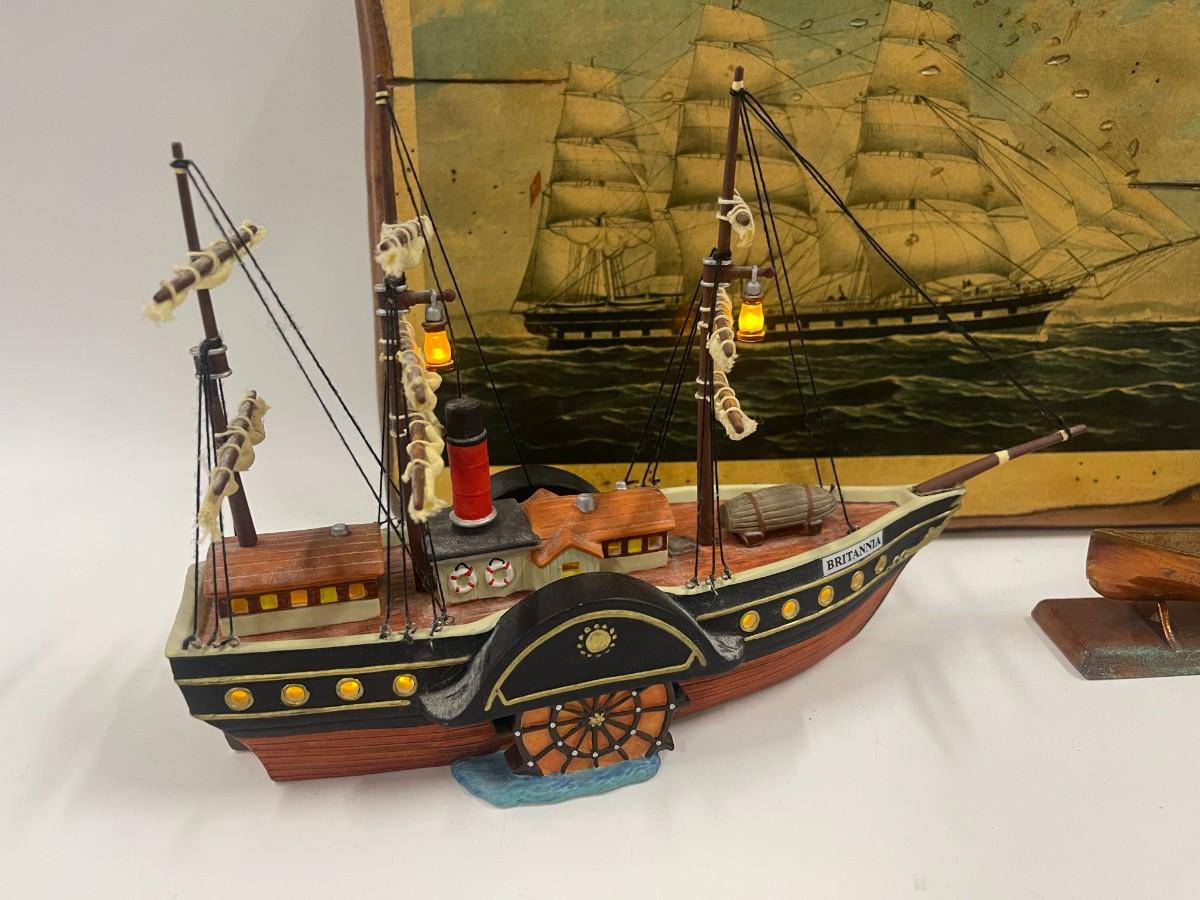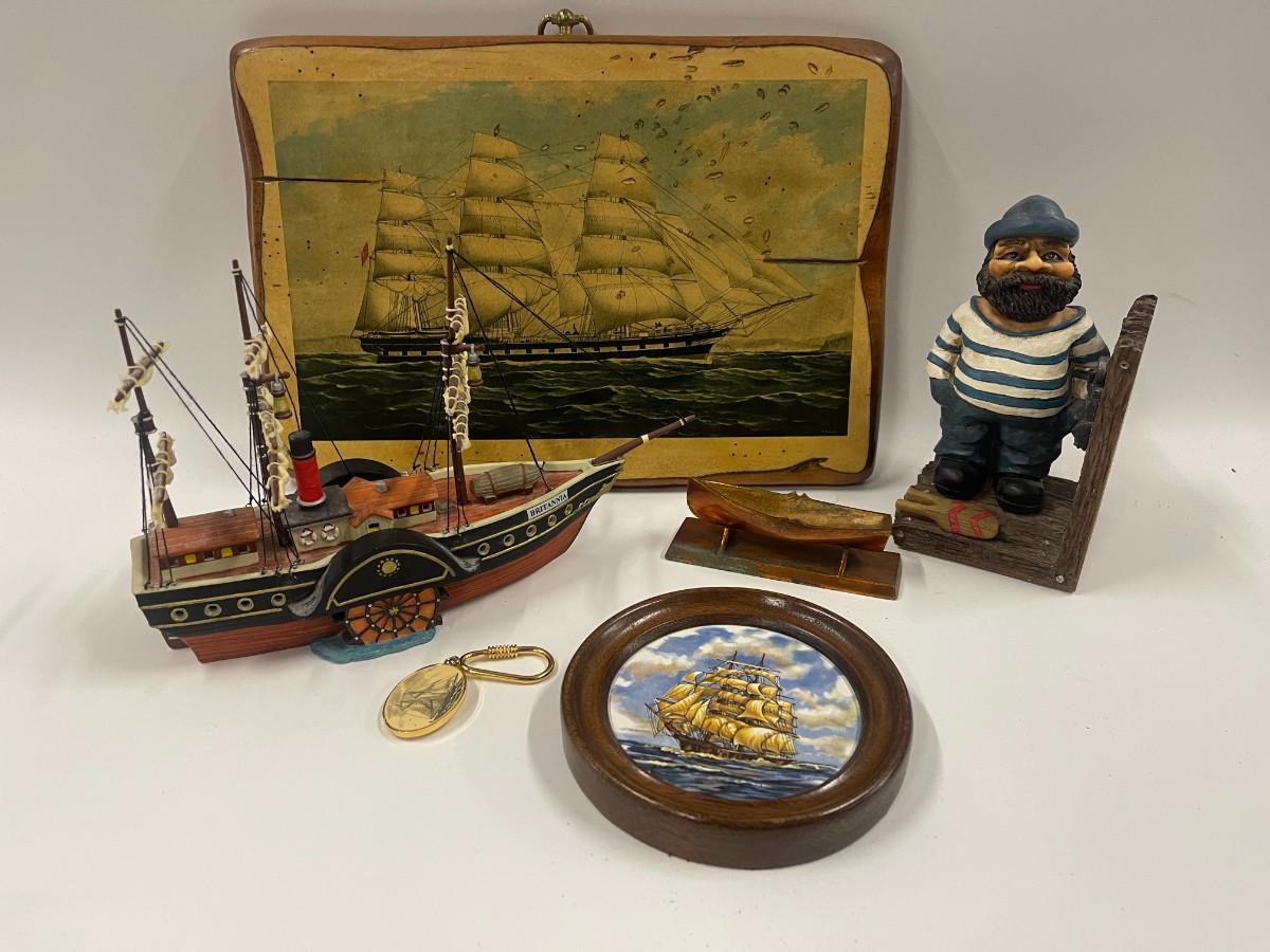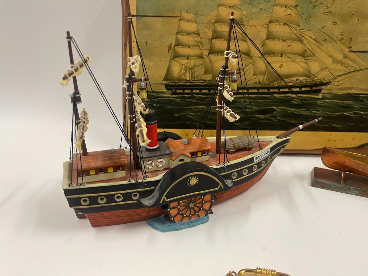 Includes: wooden ship print, round framed ship picture, Department 56 HMS Britannia ship from Dickens Village (repaired and battery cover missing but the ship does light up), metal ship, ship key chain, nautical bookend.