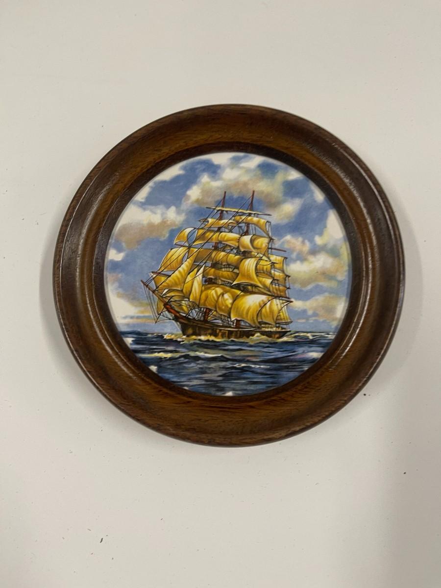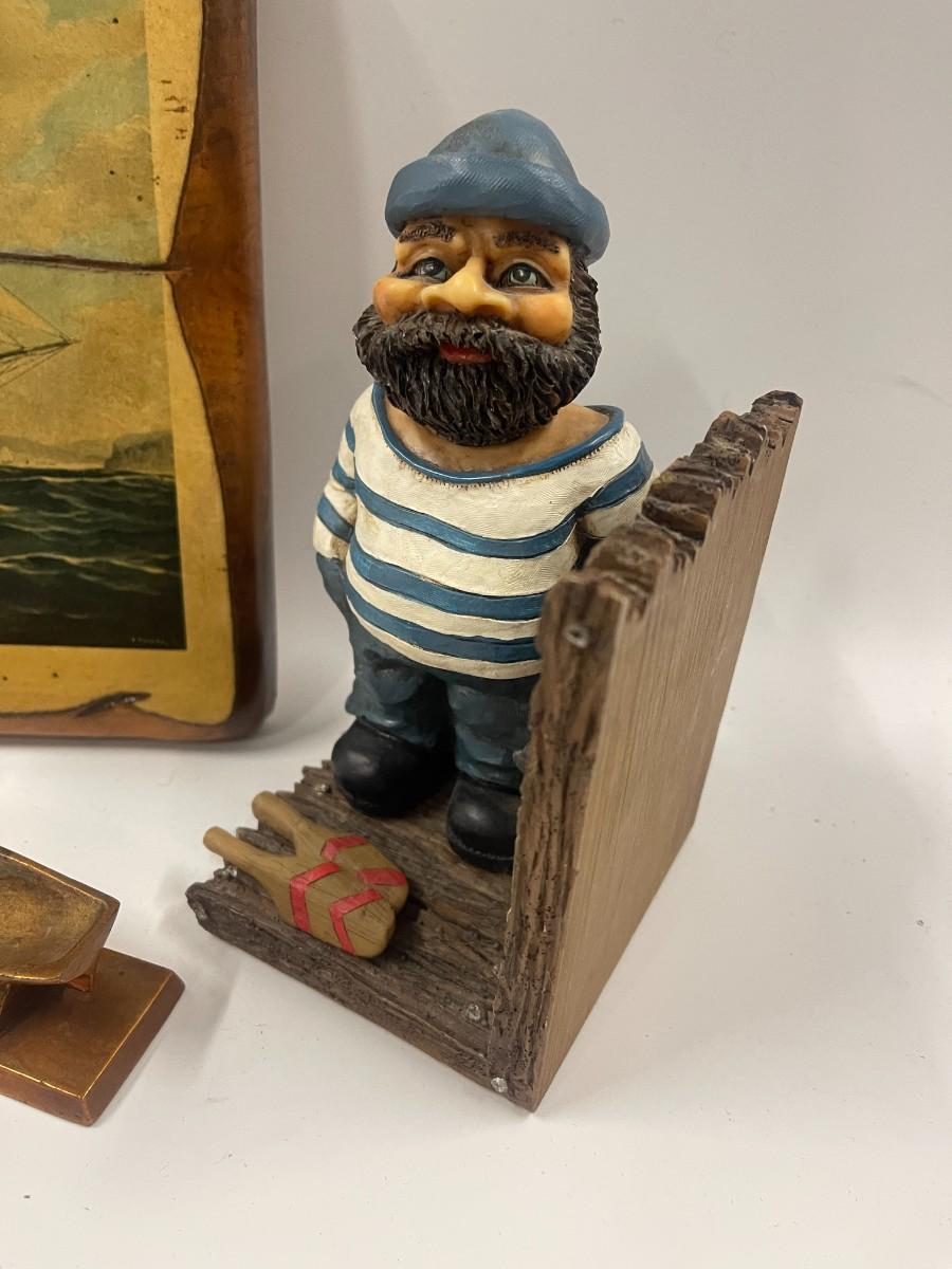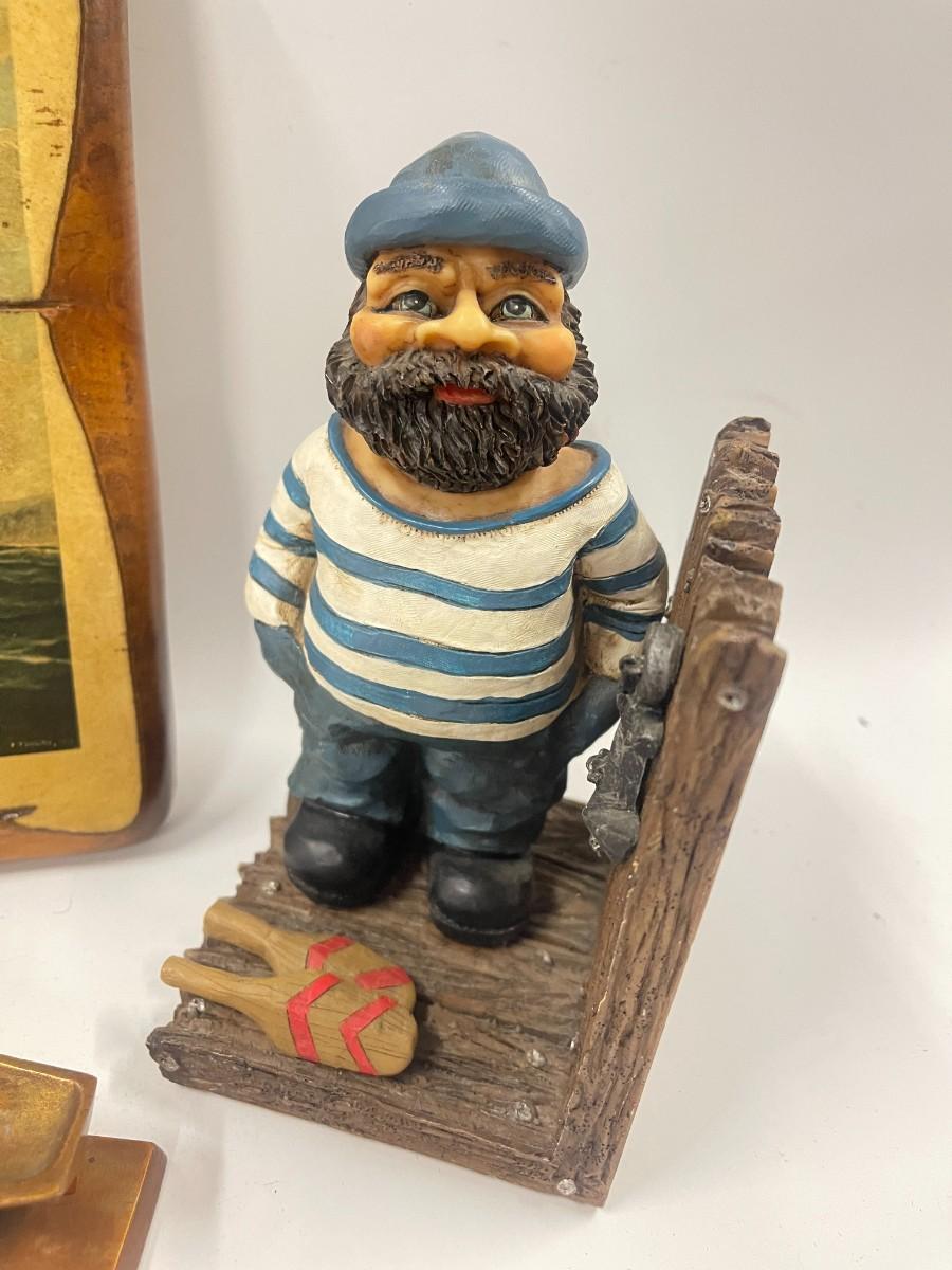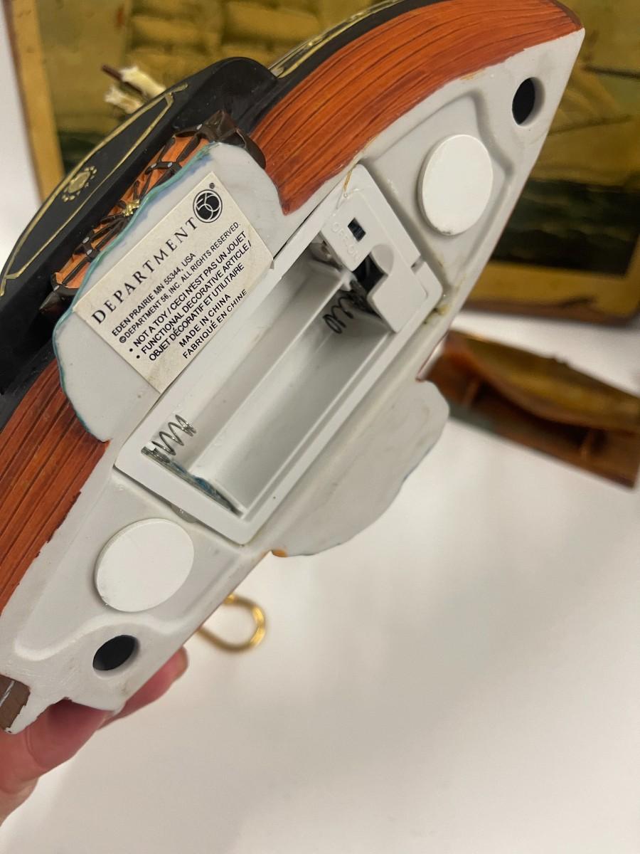 Includes: wooden ship print, round framed ship picture, Department 56 HMS Britannia ship from Dickens Village (repaired and battery cover missing but the ship does light up), metal ship, ship key chain, nautical bookend.