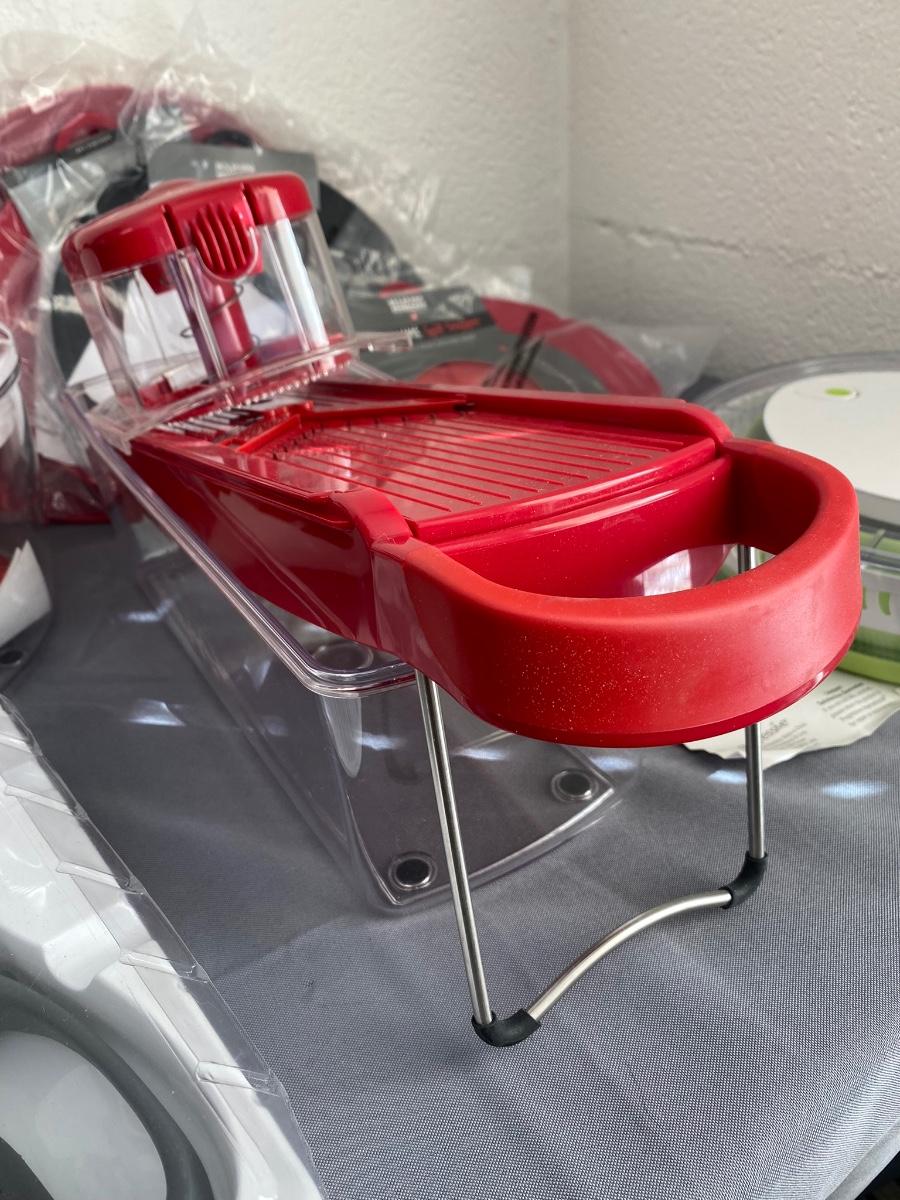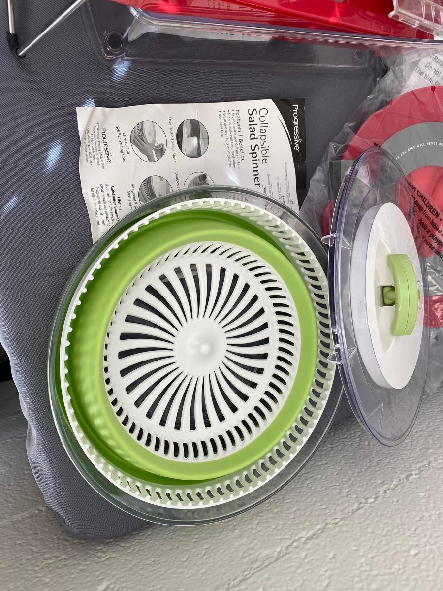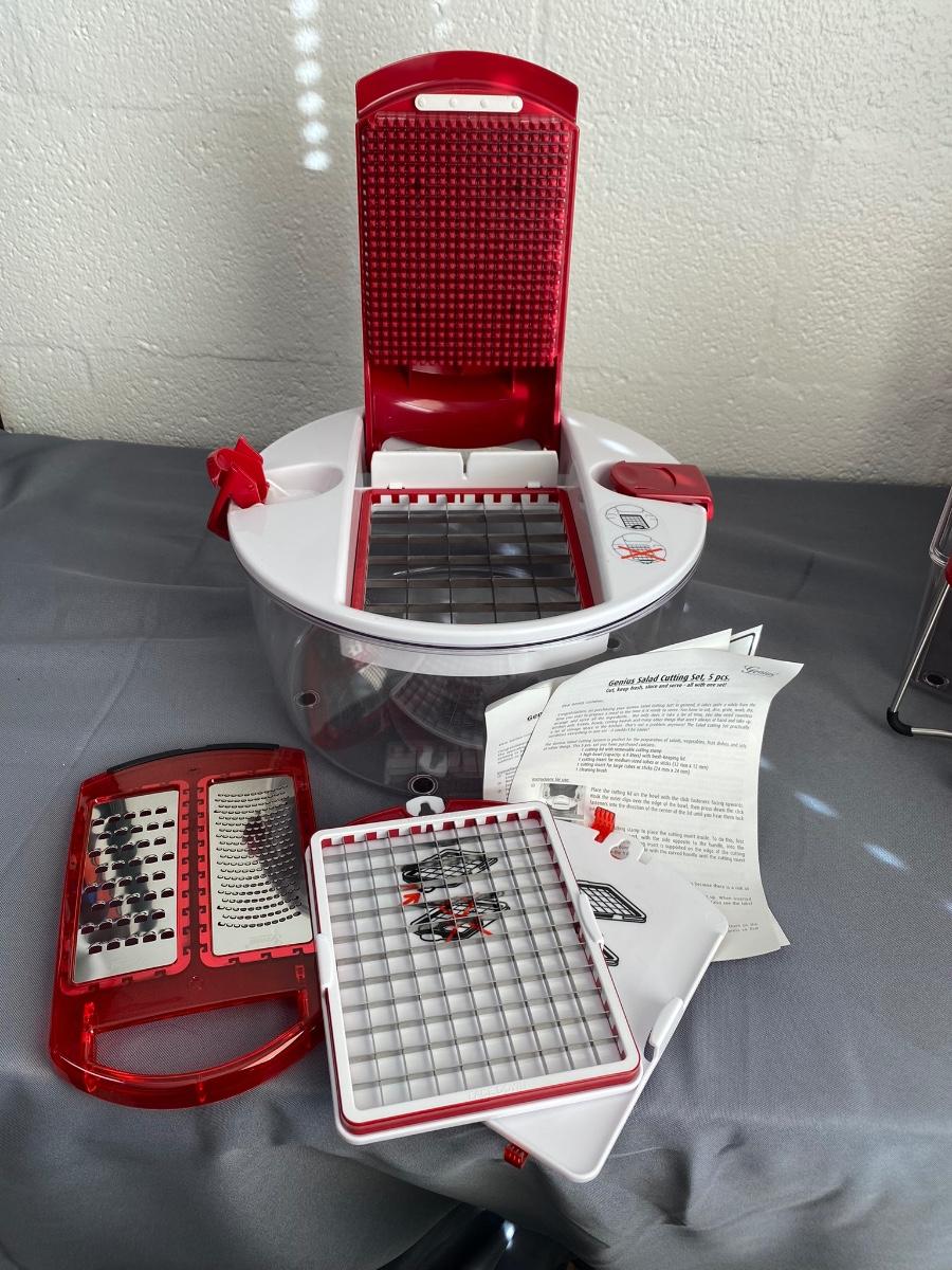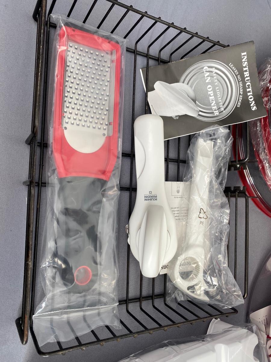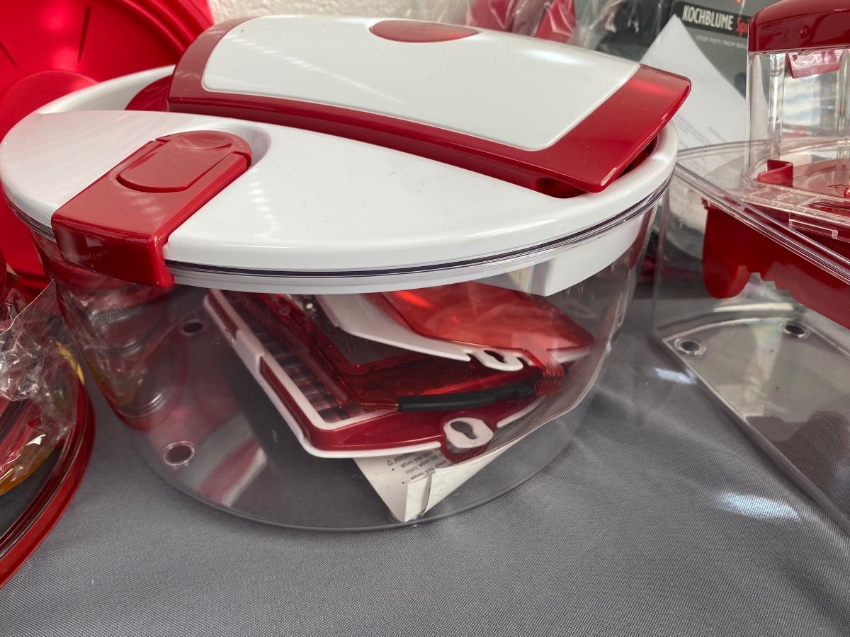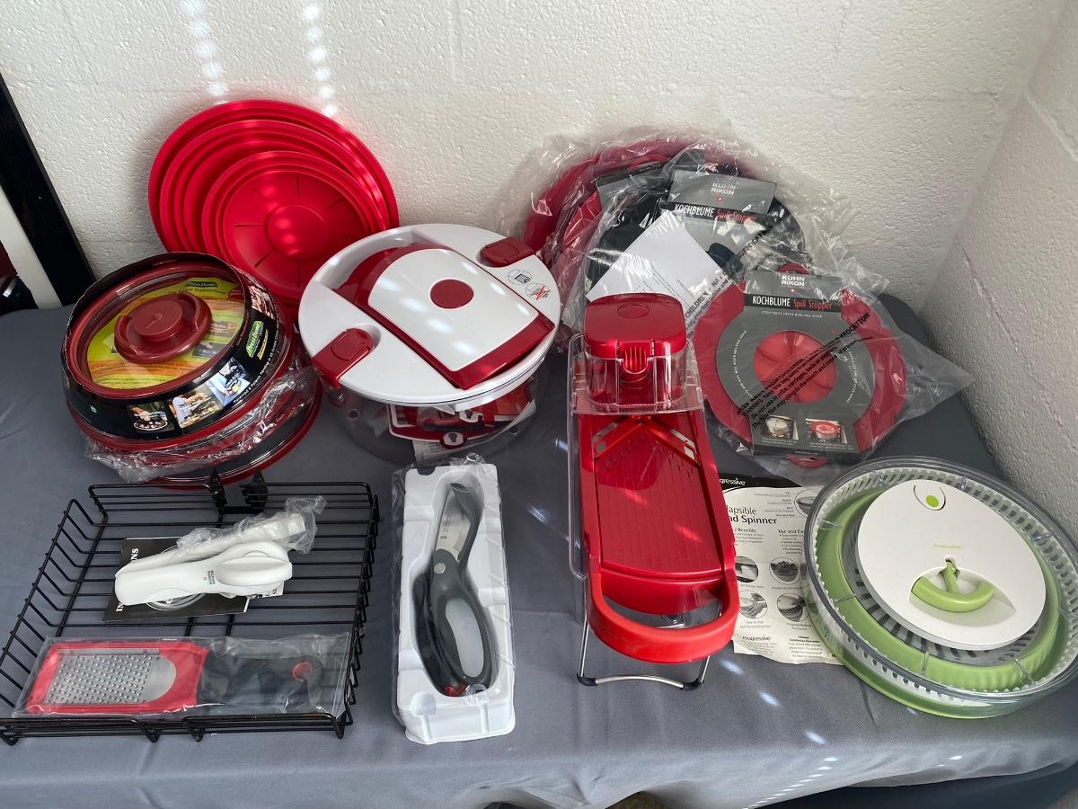 Metal Grill Basket, SilverMark Scissors, Plastic Can Opener, Black Handled Red Grater, Mandolin, Collapsible Salad Spinner, Genius Salad Cutter Kit, 4 Press Domes, 3 handled lids, & 4 Kochblume Spill Stoppers