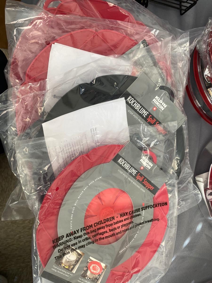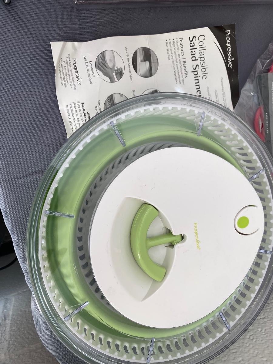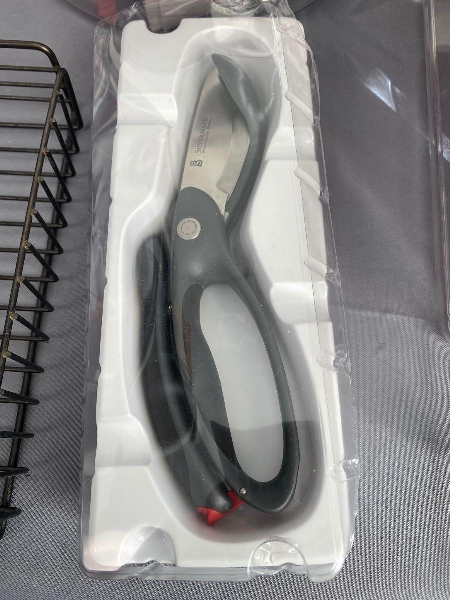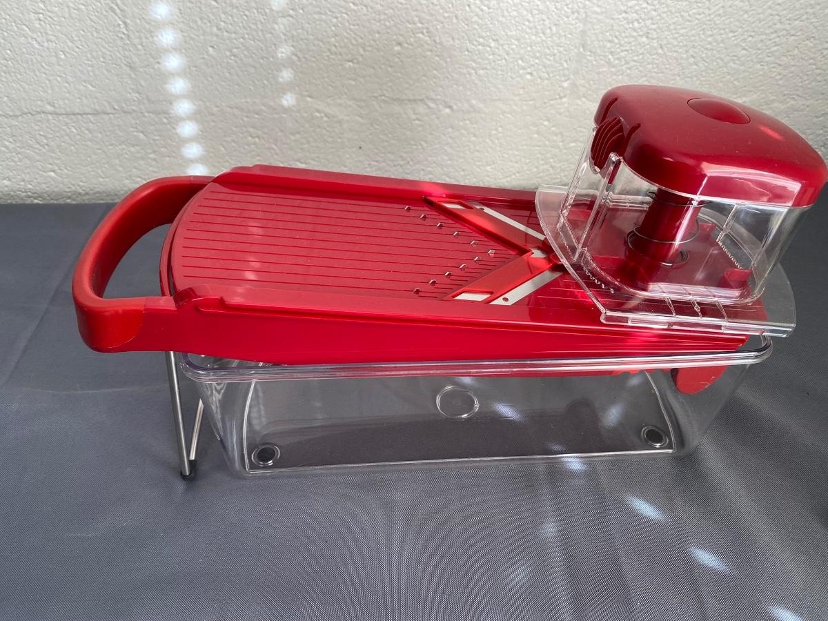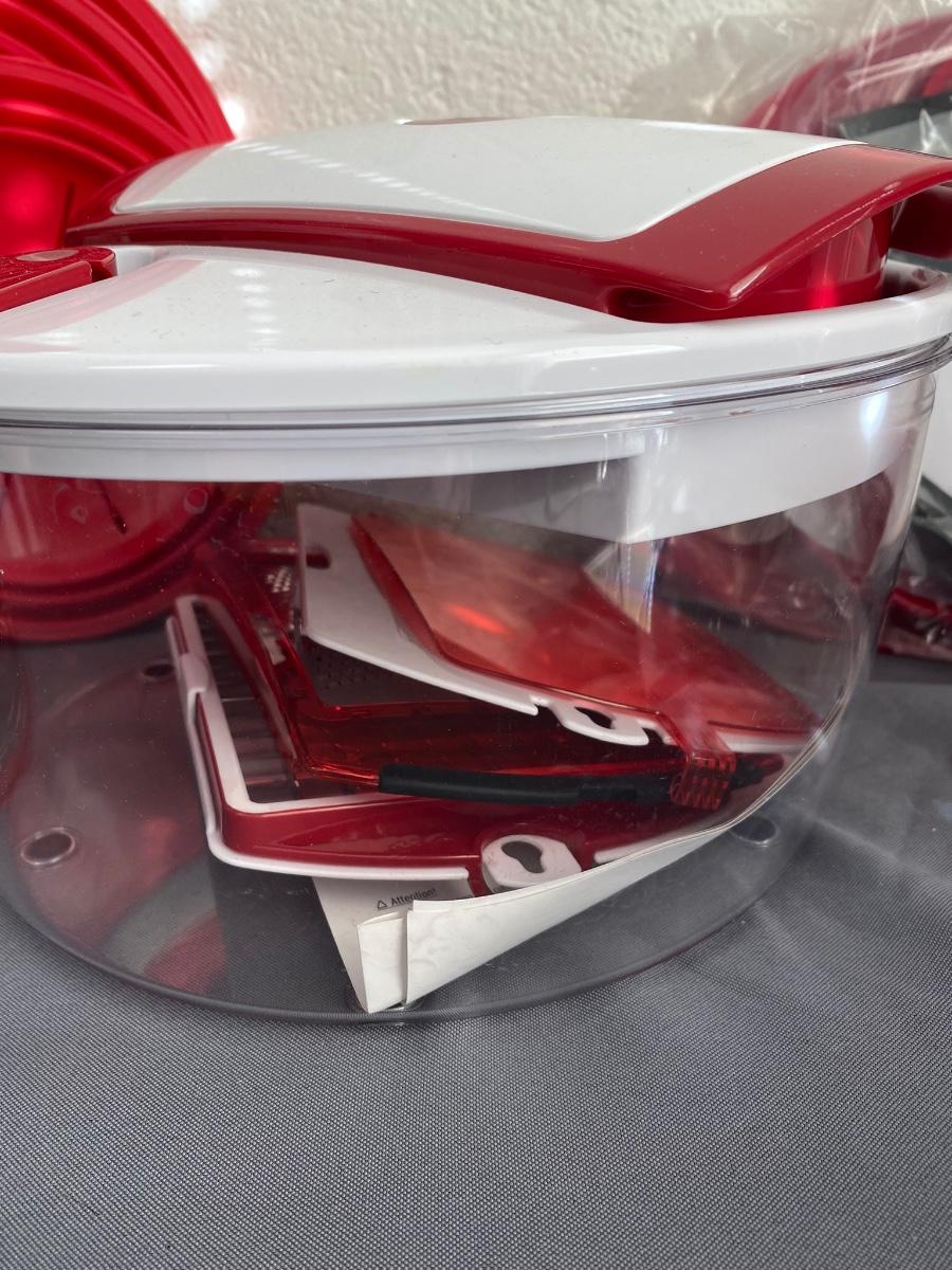 Metal Grill Basket, SilverMark Scissors, Plastic Can Opener, Black Handled Red Grater, Mandolin, Collapsible Salad Spinner, Genius Salad Cutter Kit, 4 Press Domes, 3 handled lids, & 4 Kochblume Spill Stoppers