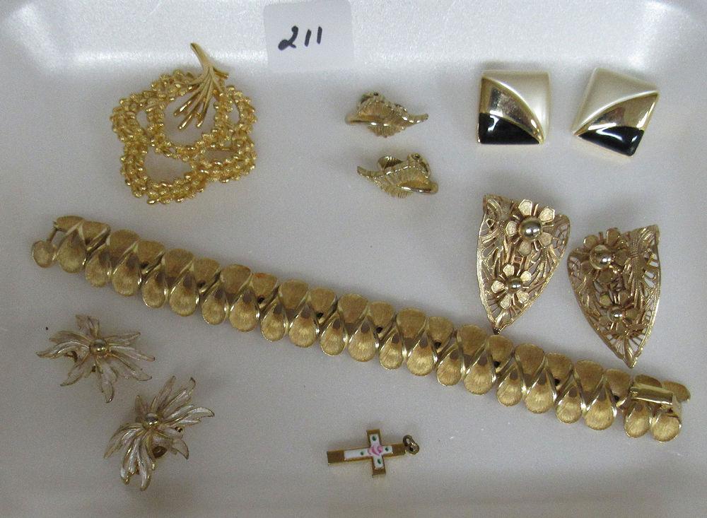 Trifari pin, Monet leaf earrings, Napier earrings, Parkland leaf earrings, Kramer bracelet, all in very good condition. Shipping is available at shipping cost plus $5.00 handling fee on up to 8 lots, $10.00 handling fee on 9 or more lots.