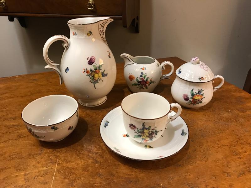 Very nice collection of Nymphenburg china pieces with hand painted Dresden style flowers and burgundy trim and accents. Set includes covered pot de creme, demitasse with saucer, cream and open sugar, and small pitcher (5" x 4"x 6" H).
