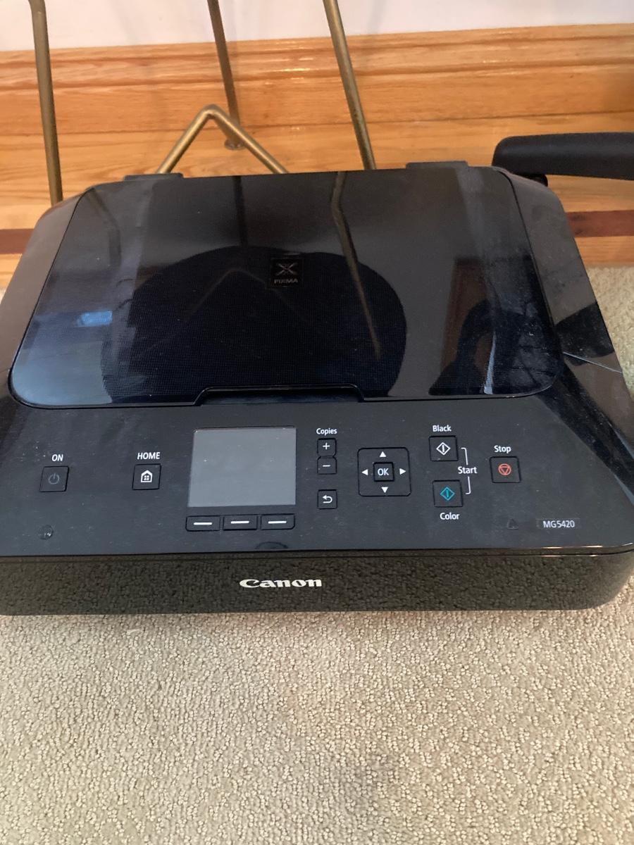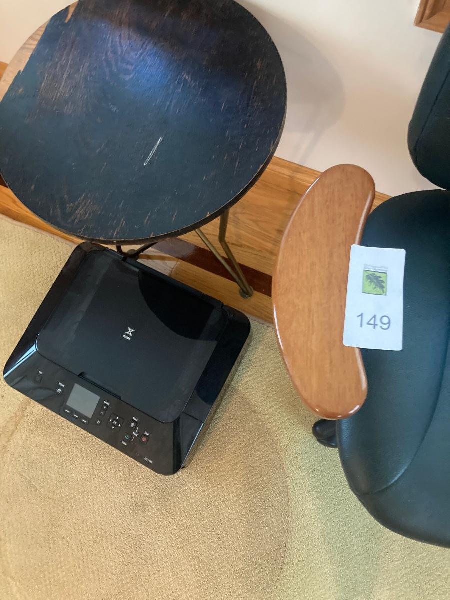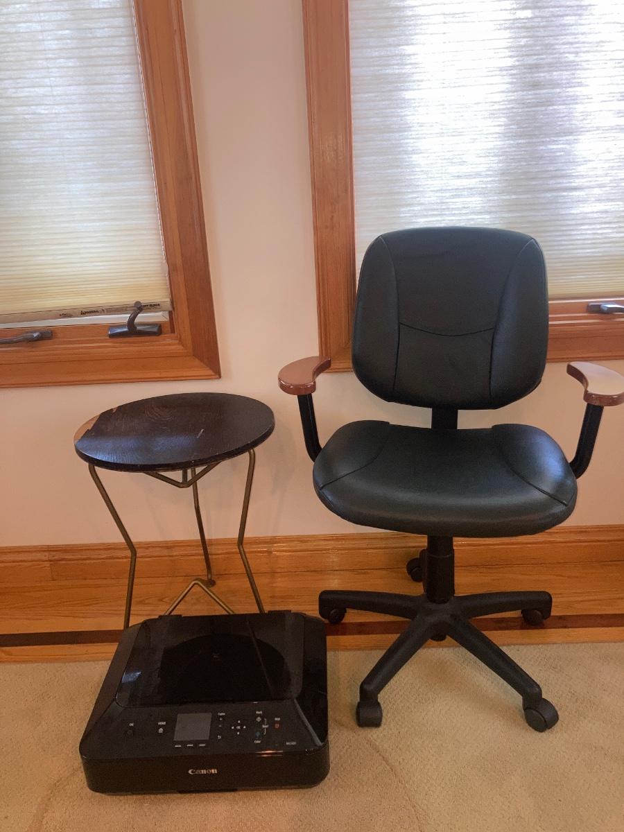 Canon MG5420 printer (untested), desk chair with wood armrest, and round mid-century, wood-top table (see photo for damage).