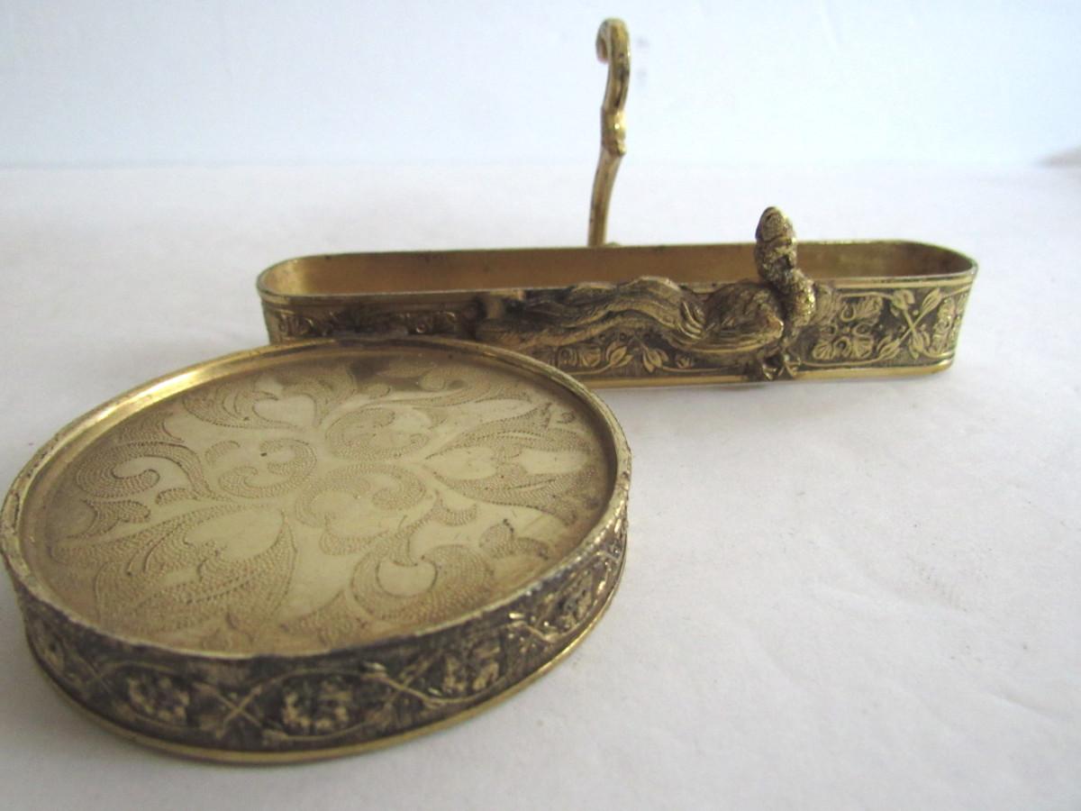 Wear on the tea strainer. The cup and saucer holder is neat. Shipping is available at actual shipping cost plus $5.00 handling fee per box for supplies/labor. See our terms for details. All sales are final. Condition notes may not be all inclusive, we may miss some issues as most vintage items are not in mint condition and have some degree of wear, paint loss, etc, but we always try to note obvious damage.