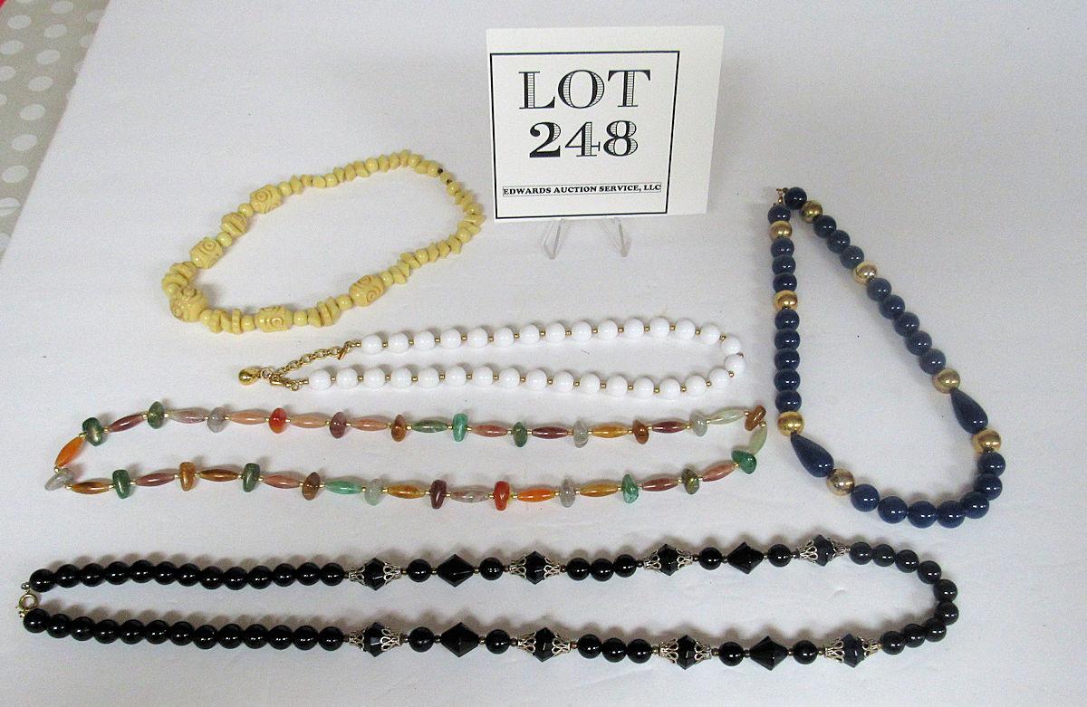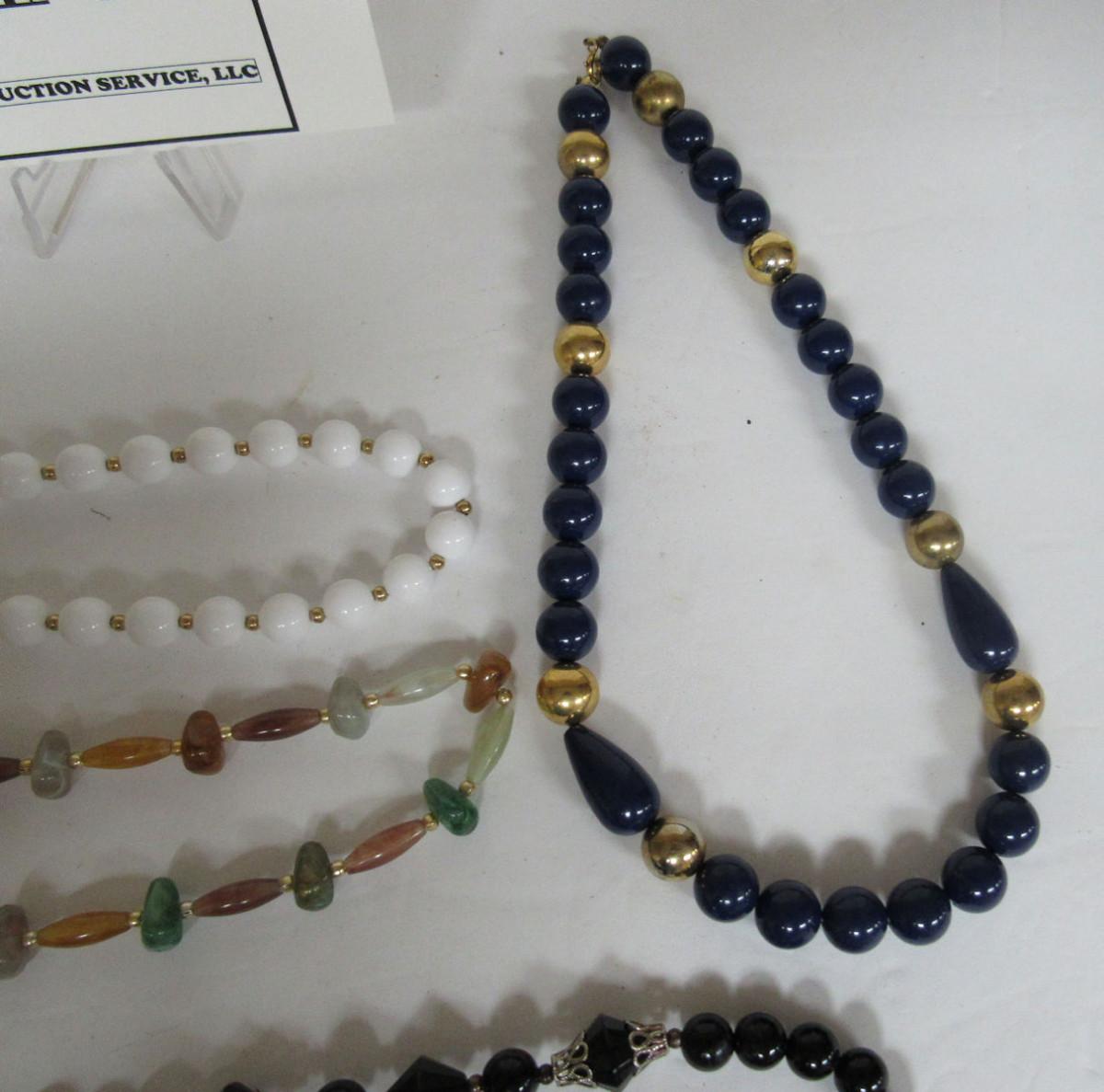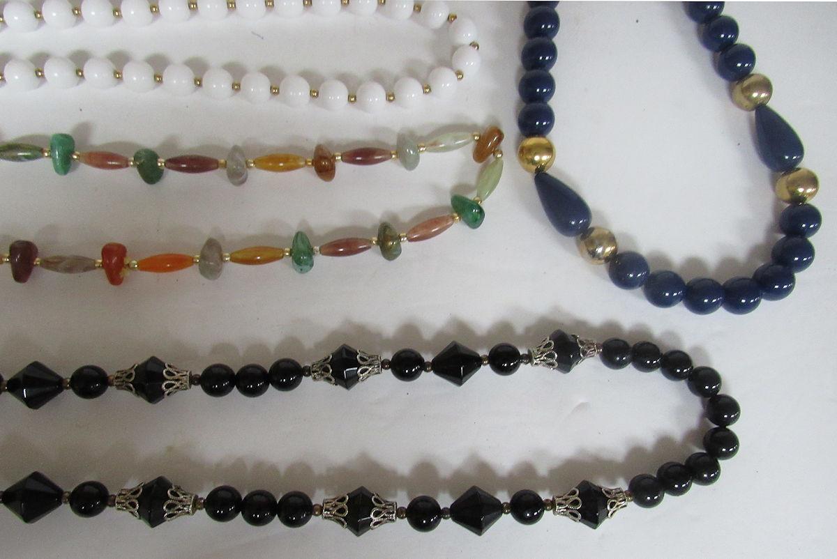 Good overall condition. Carved plastic, blue glass with gold beads, black glass with silver trim, multi colored plastic beads. Shipping is available at shipping cost plus $5.00 handling fee on up to 8 lots, $10.00 handling fee on 9 or more lots or two boxes.