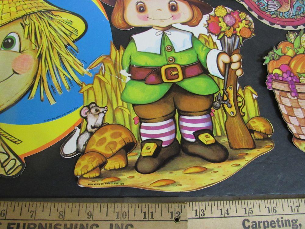 The scarecrow is good, the others all have varying degrees of wear, bends, some minor, some worse, and one Pilgrim and one Happy Thanksgiving flat has a paper tear as seen in photos. Backs of most have tape or paper loss. Shipping is available but will be an oversized package and at least 1-2 lbs.