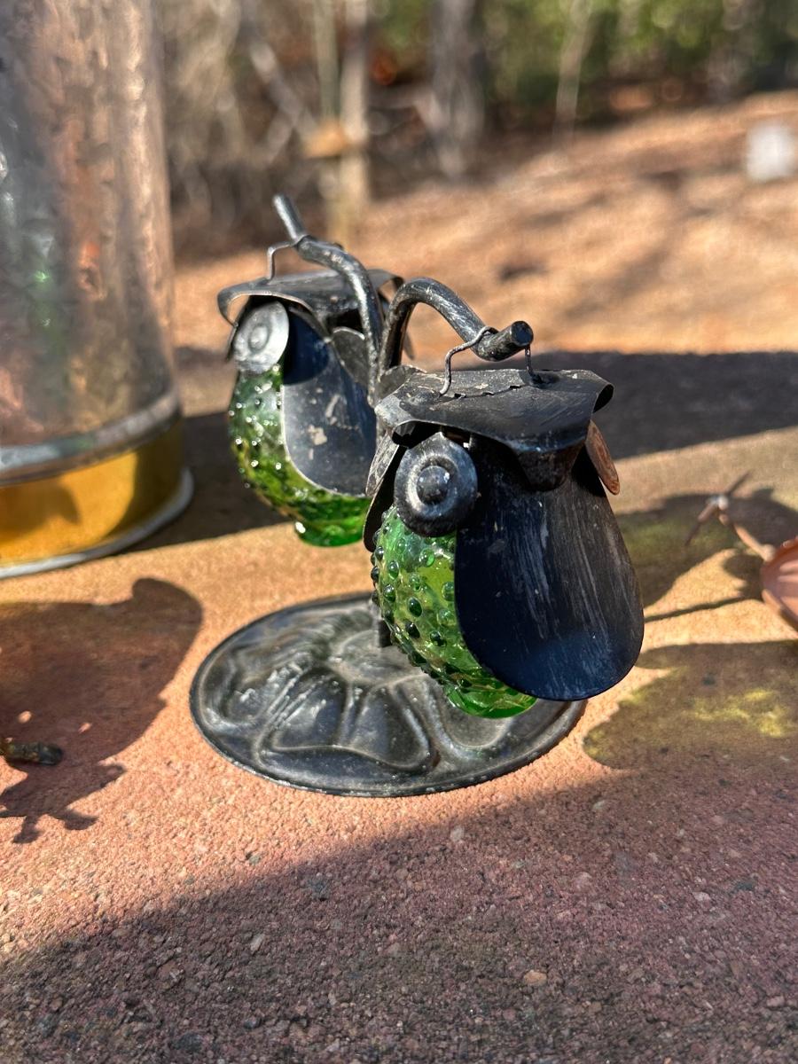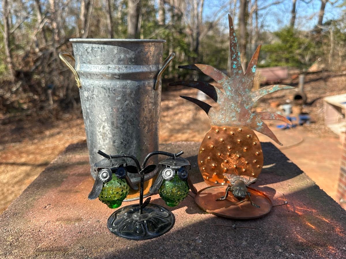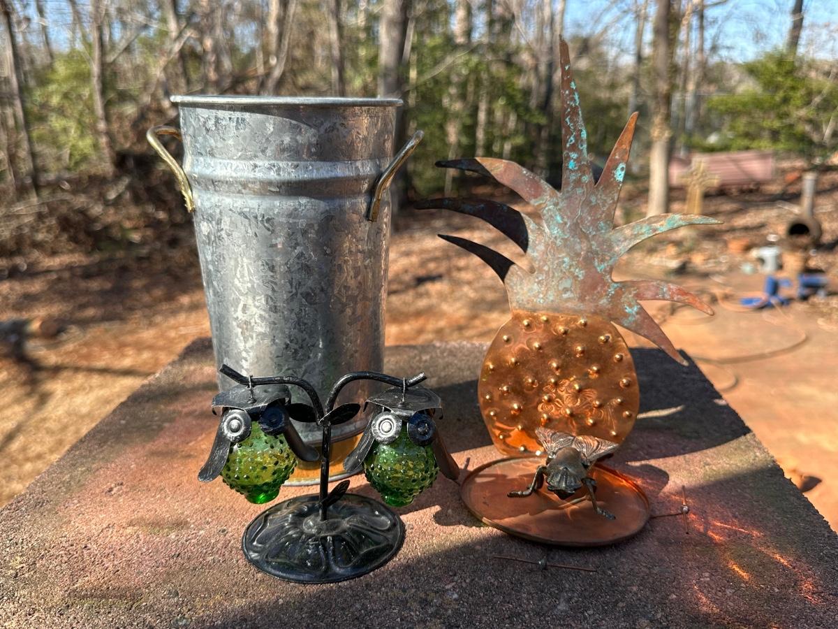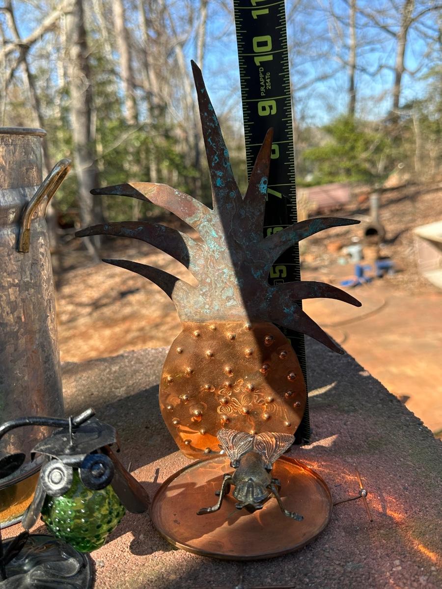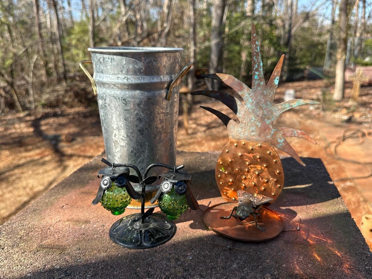 Incudes Tin pot, what appears to be a Pineapple plant stand, Owl Salt & Pepper Shakers and a Fly Trinket Dish